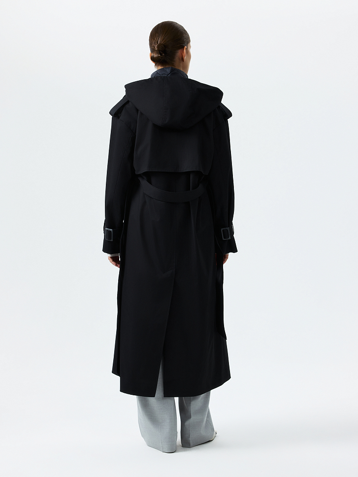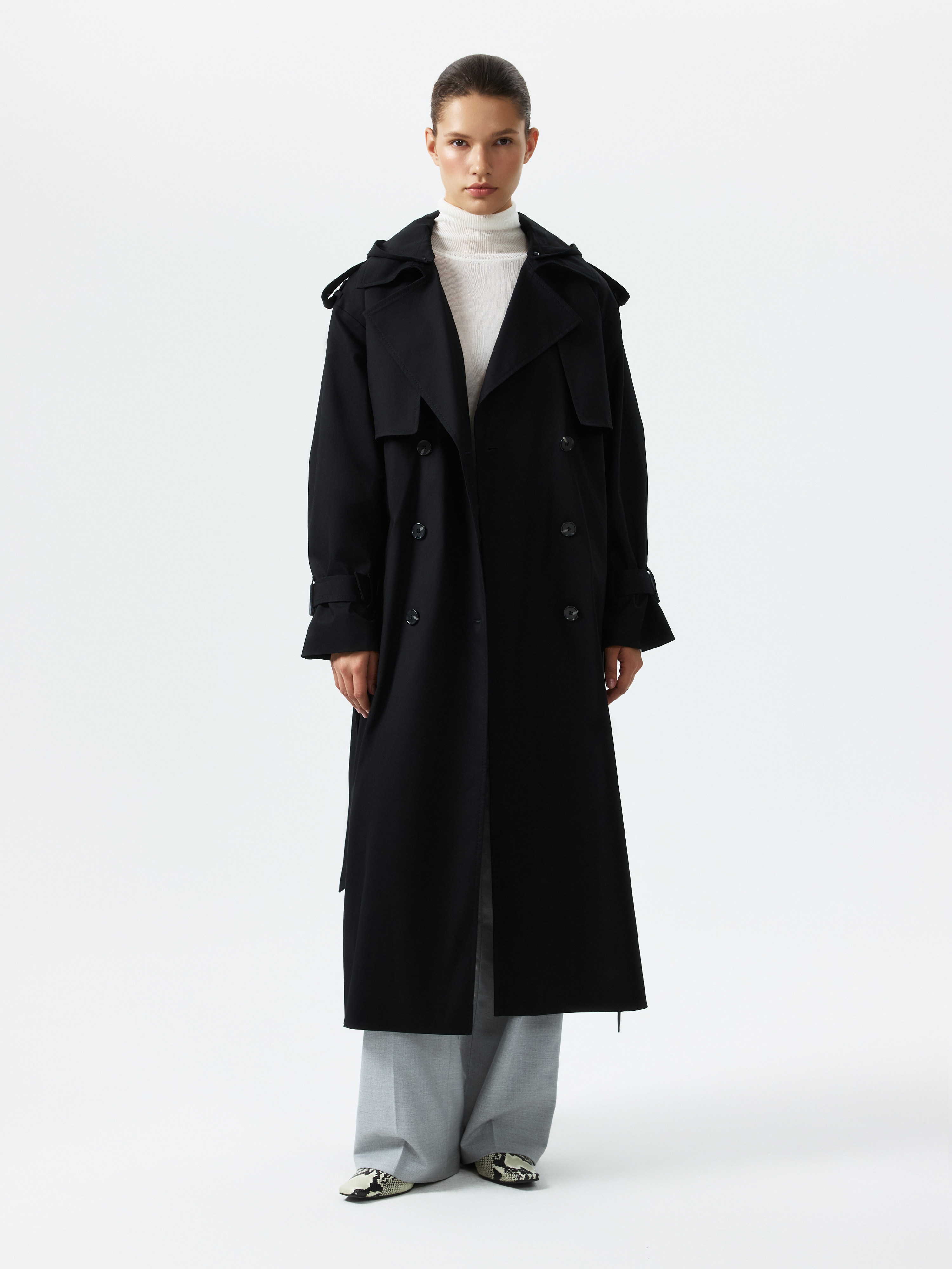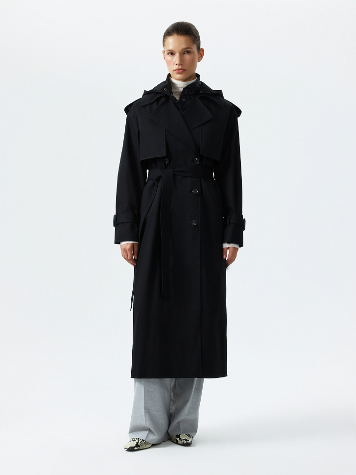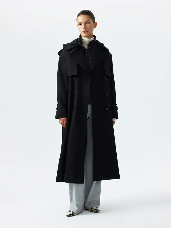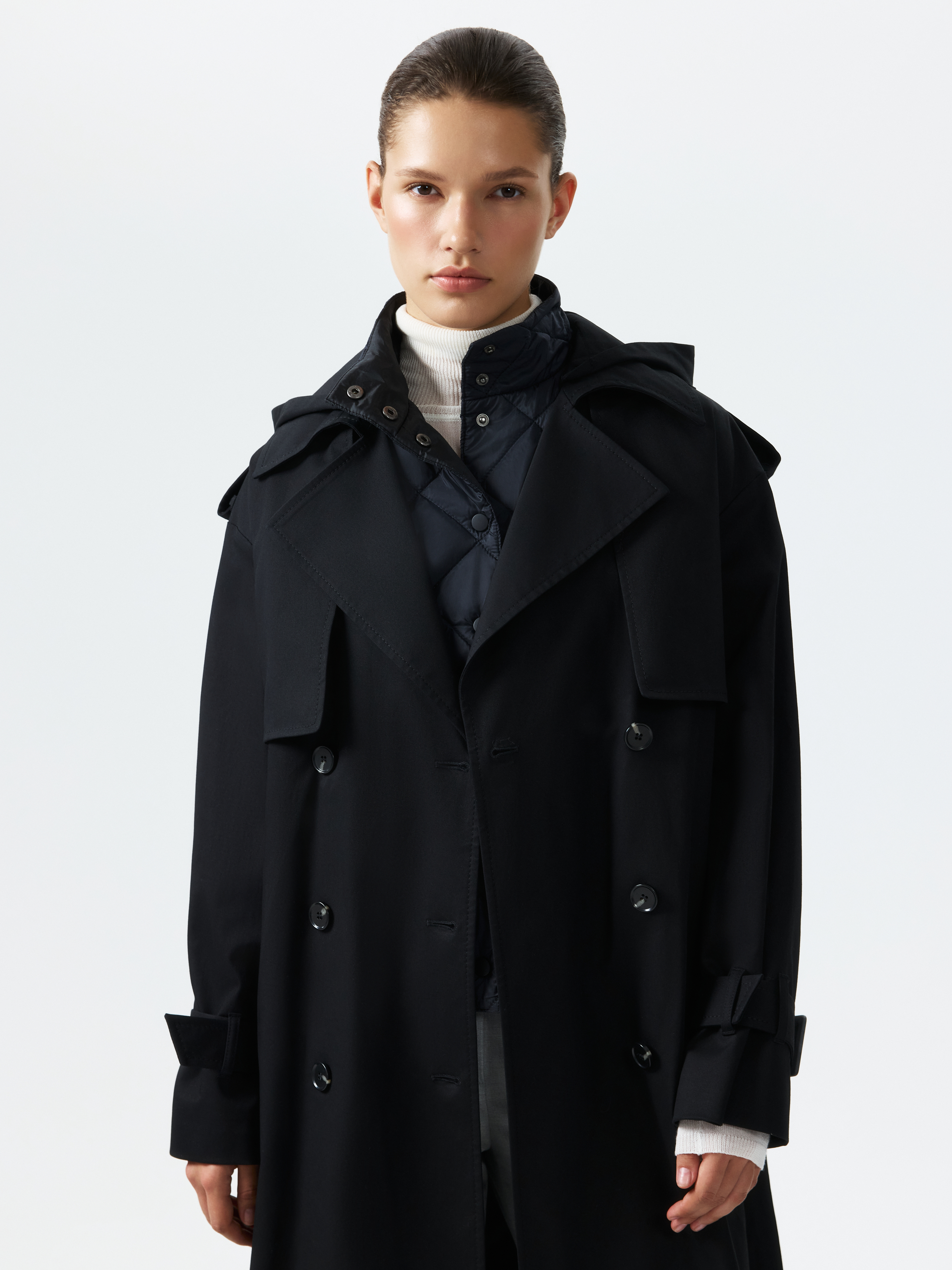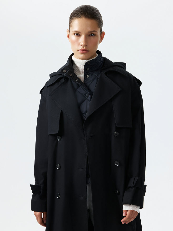 Двубортный тренч с утеплителем – многофункциональное изделие, которое позволит менять образ по настроению и погоде. Плотный хлопковый текстиль с водоотталкивающей пропиткой легко очищается от загрязнений и защищает от осадков. Стеганный утепленный жилет на кнопках, который придаст дополнительное тепло, можно носить отдельно. Детали продуманы до мелочей: съемные пояс, паты и капюшон трансформируют силуэт с классического на спортивный.