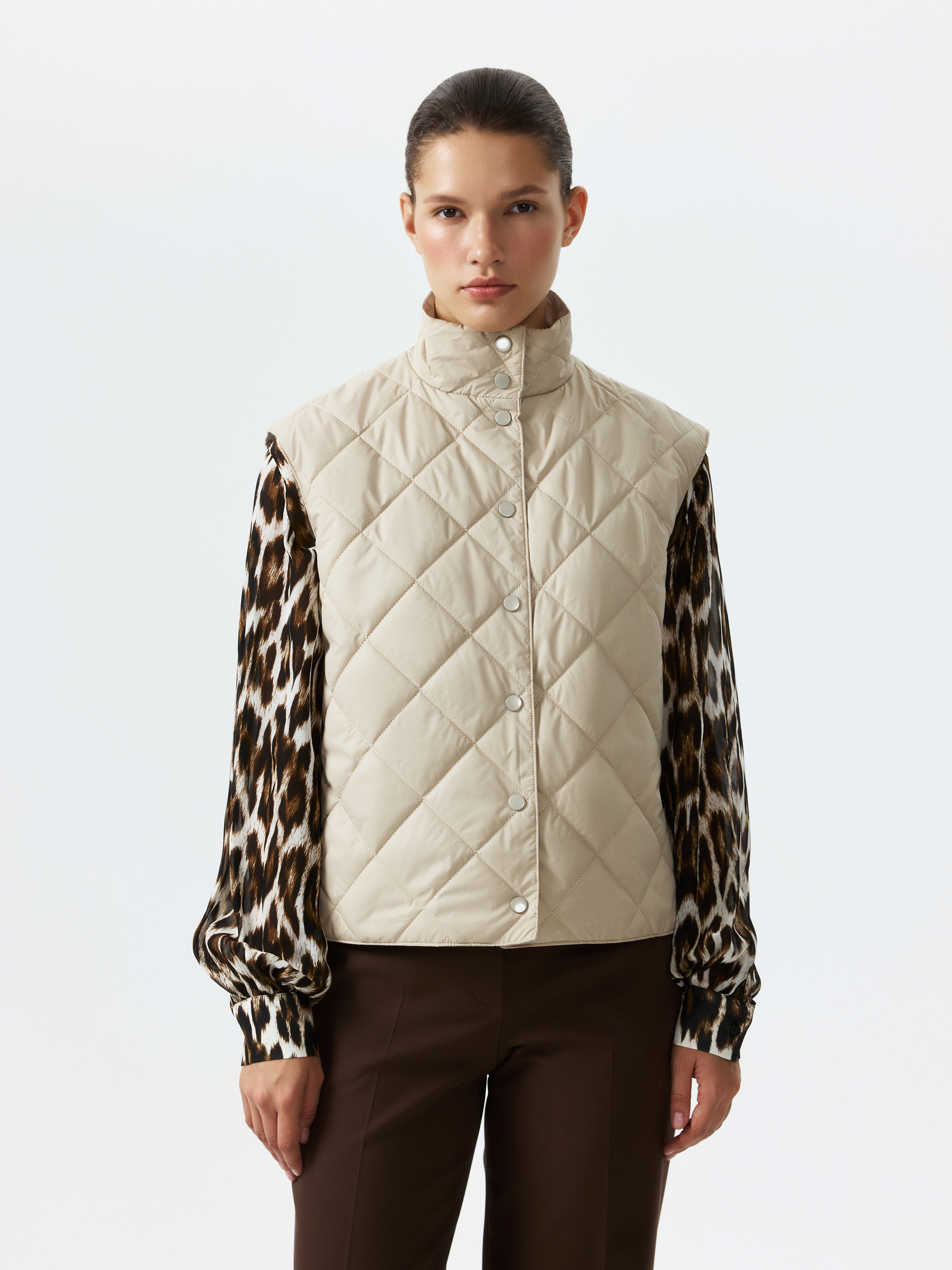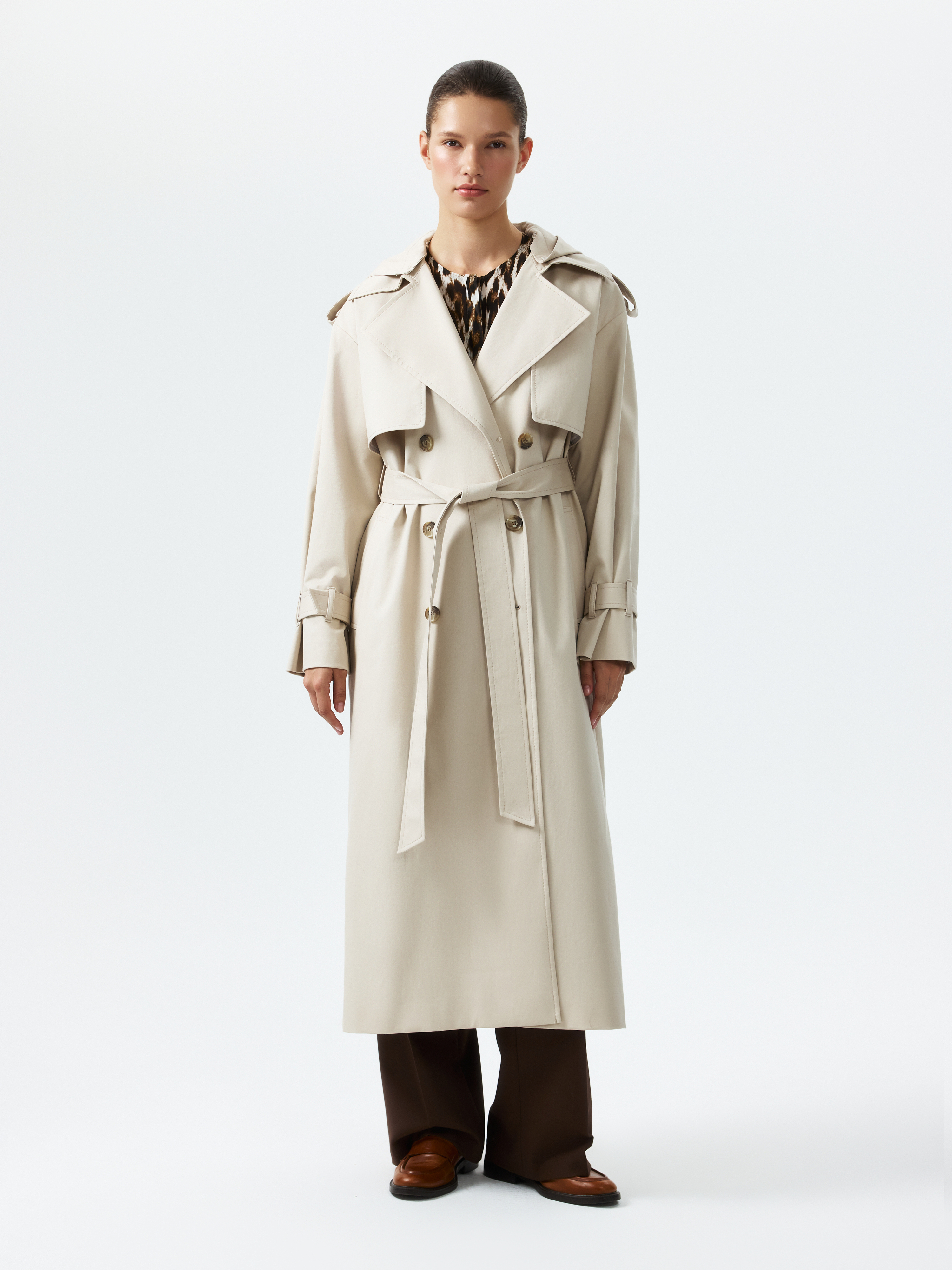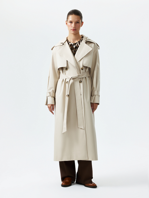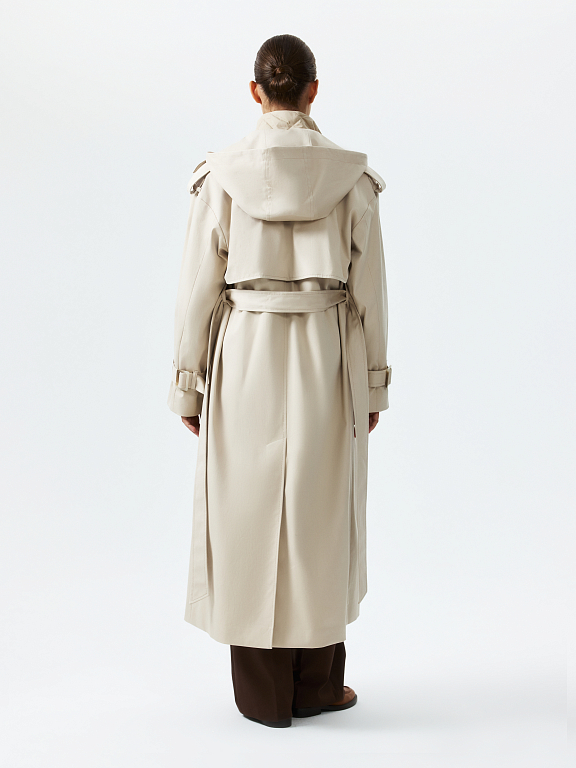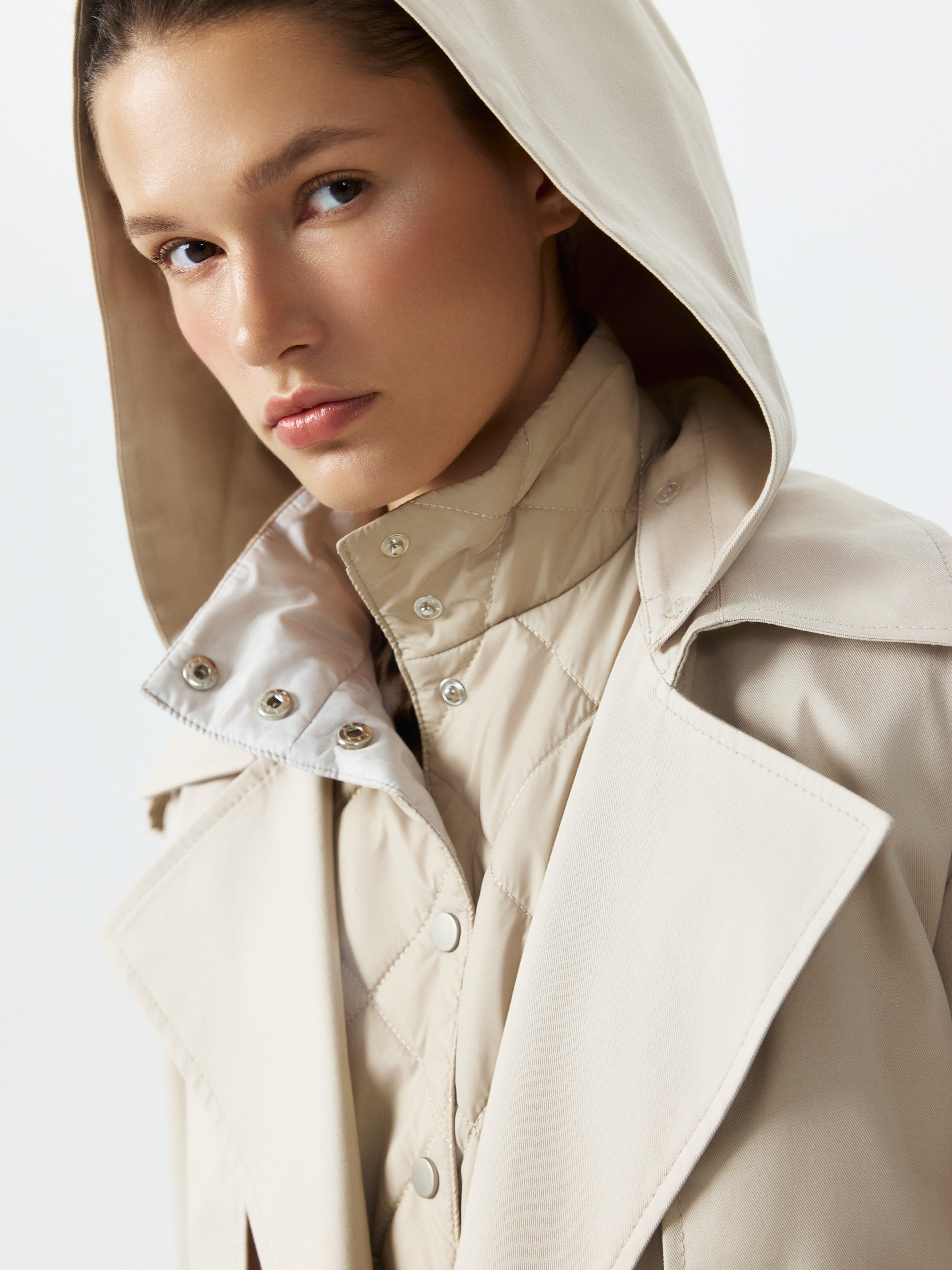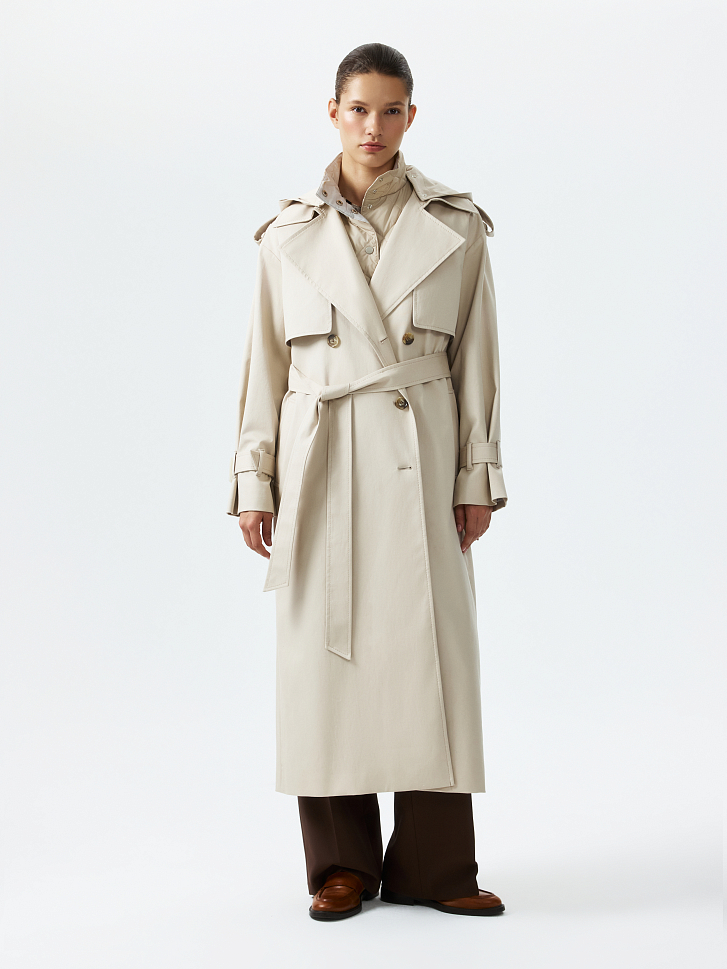 Двубортный тренч с утеплителем – многофункциональное изделие, которое позволит менять образ по настроению и погоде. Плотный хлопковый текстиль с водоотталкивающей пропиткой легко очищается от загрязнений и защищает от осадков. Стеганный утепленный жилет на кнопках, который придаст дополнительное тепло, можно носить отдельно. Детали продуманы до мелочей: съемные пояс, паты и капюшон трансформируют силуэт с классического на спортивный.