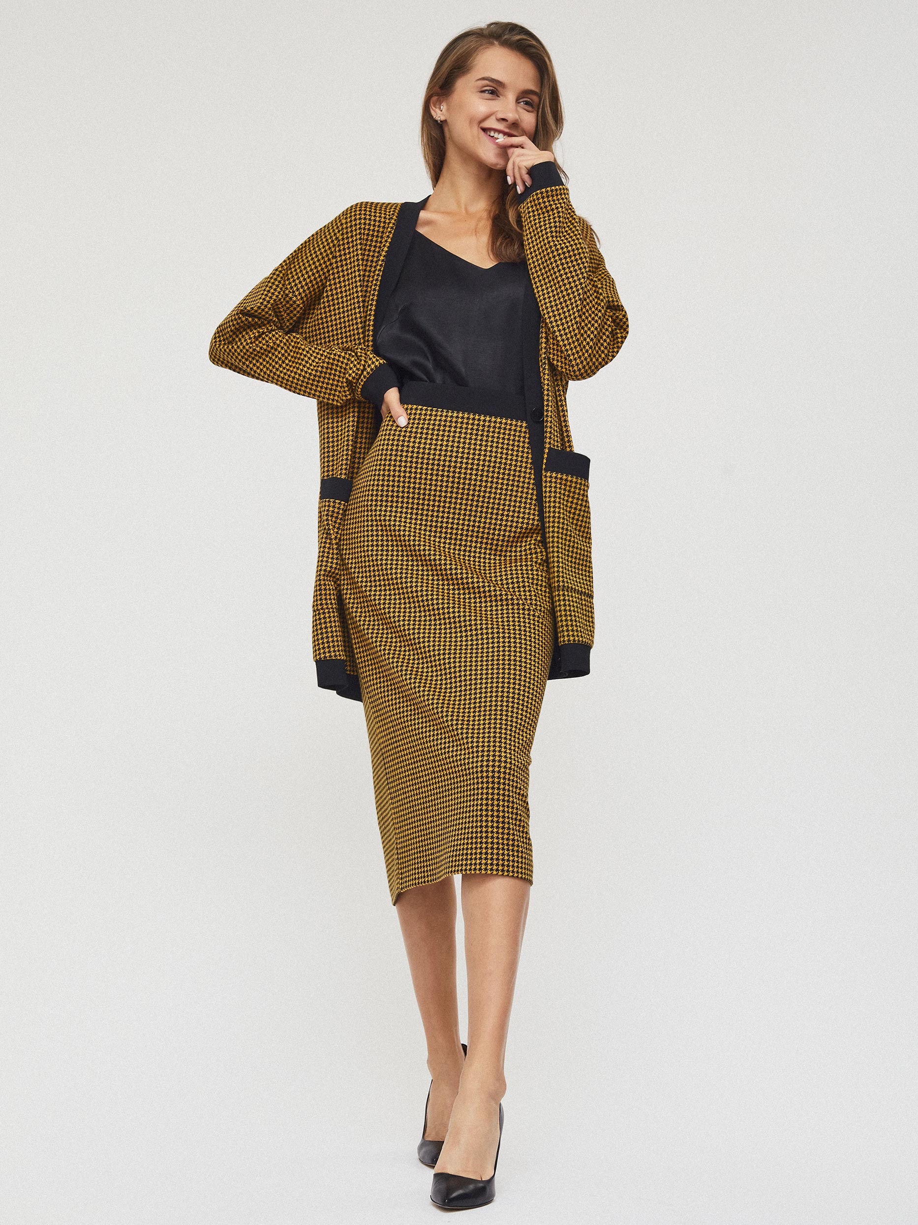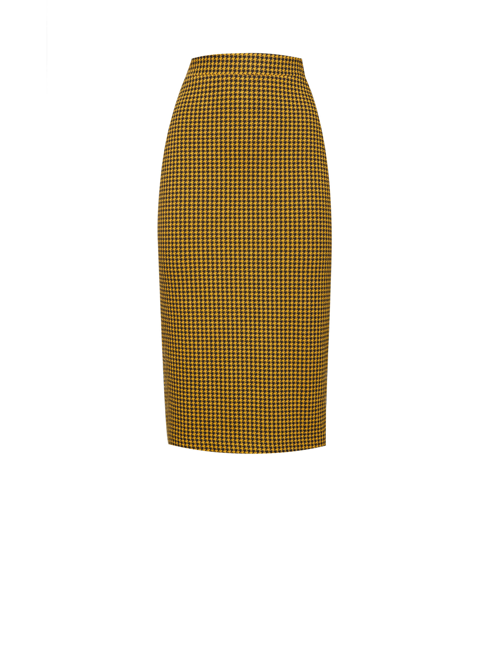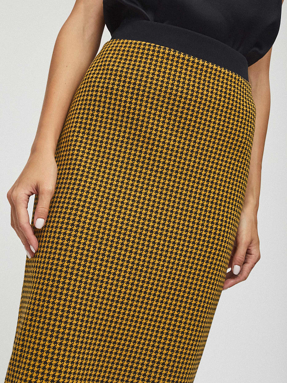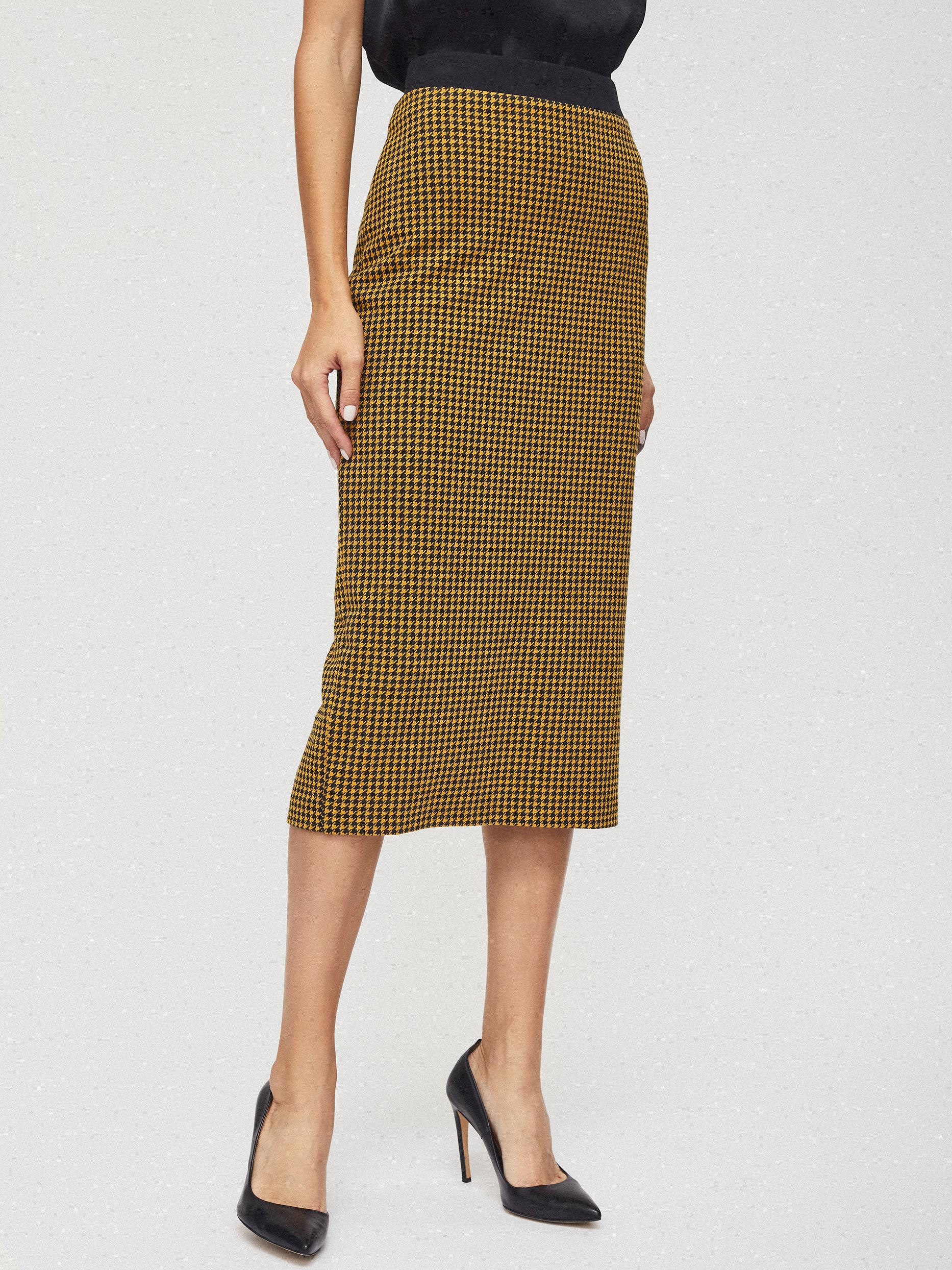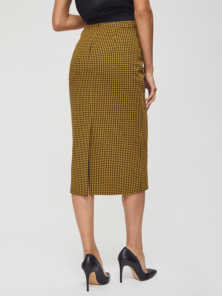 Юбка-карандаш, выполненная из эластичной ткани. Высокая посадка, втачной пояс, шлица. Застегивается на потайную молнию сзади. Изделие на подкладке.
