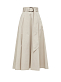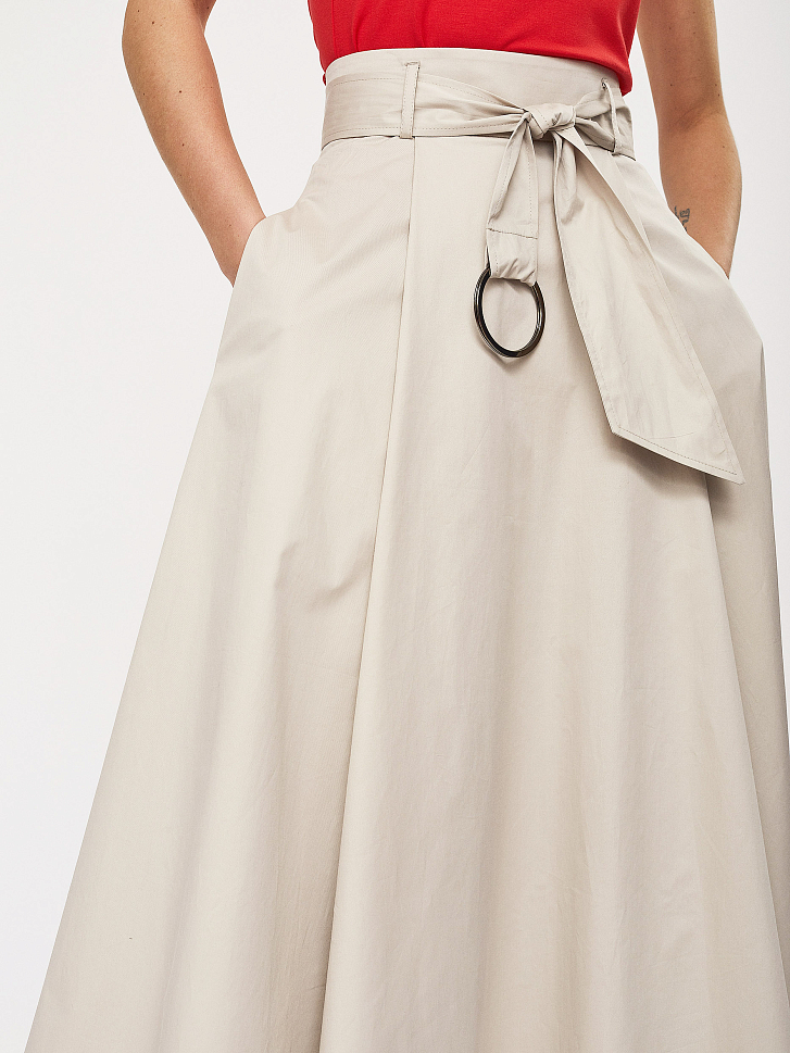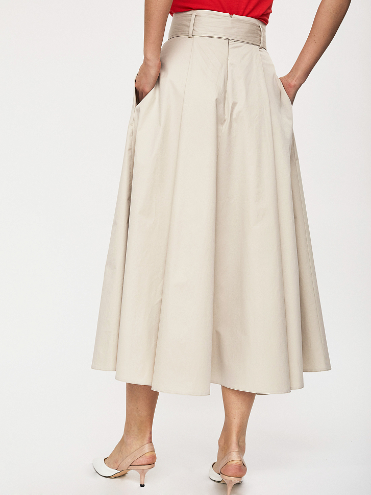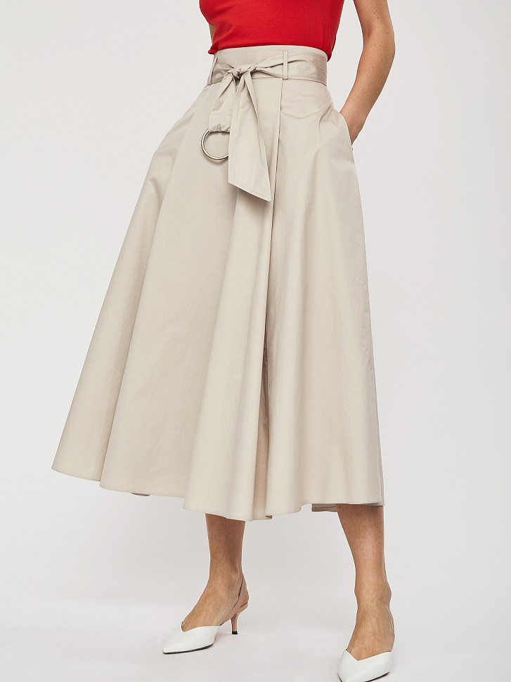 Юбка А-силуэта длины миди, изготовленная из смесового хлопка с поясом из этой же ткани с крупной металлической пряжкой. По бокам карманы. Застежка на потайную молнию.