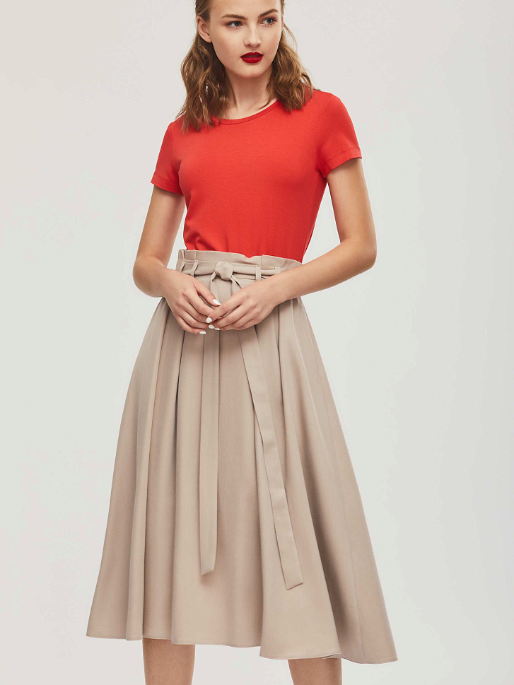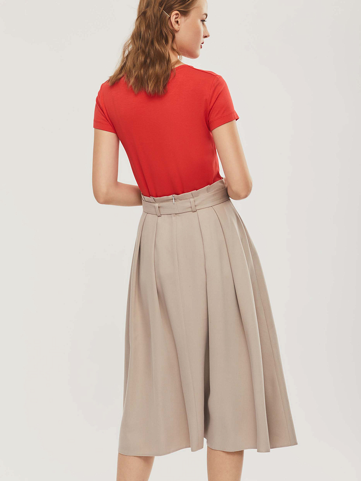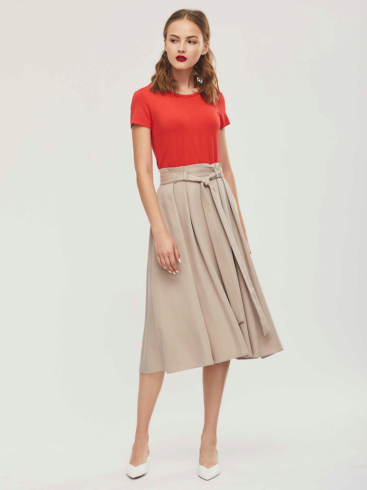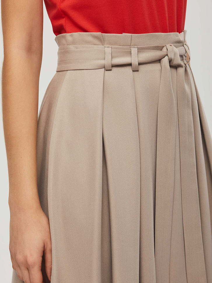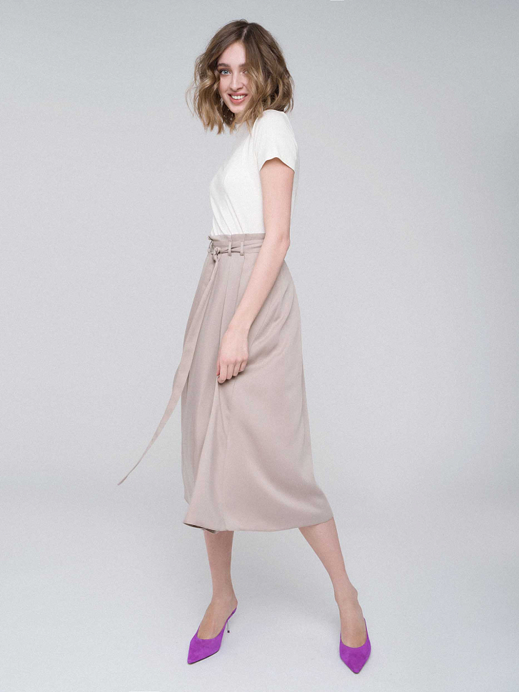 Приталенная юбка со складками и поясом в тон. Длина миди, втачная талия с драпировкой. Застегивается на потайную молнию.