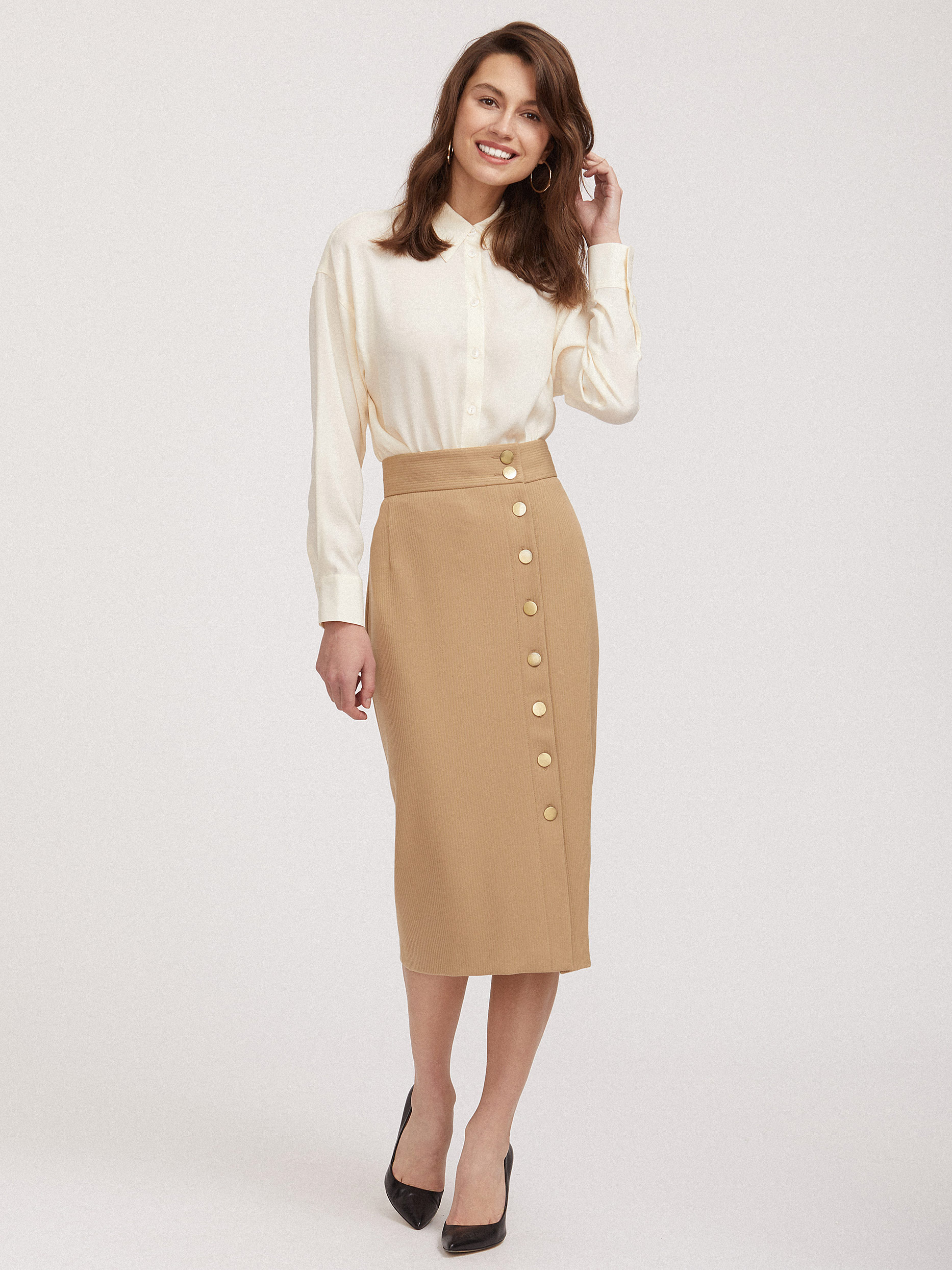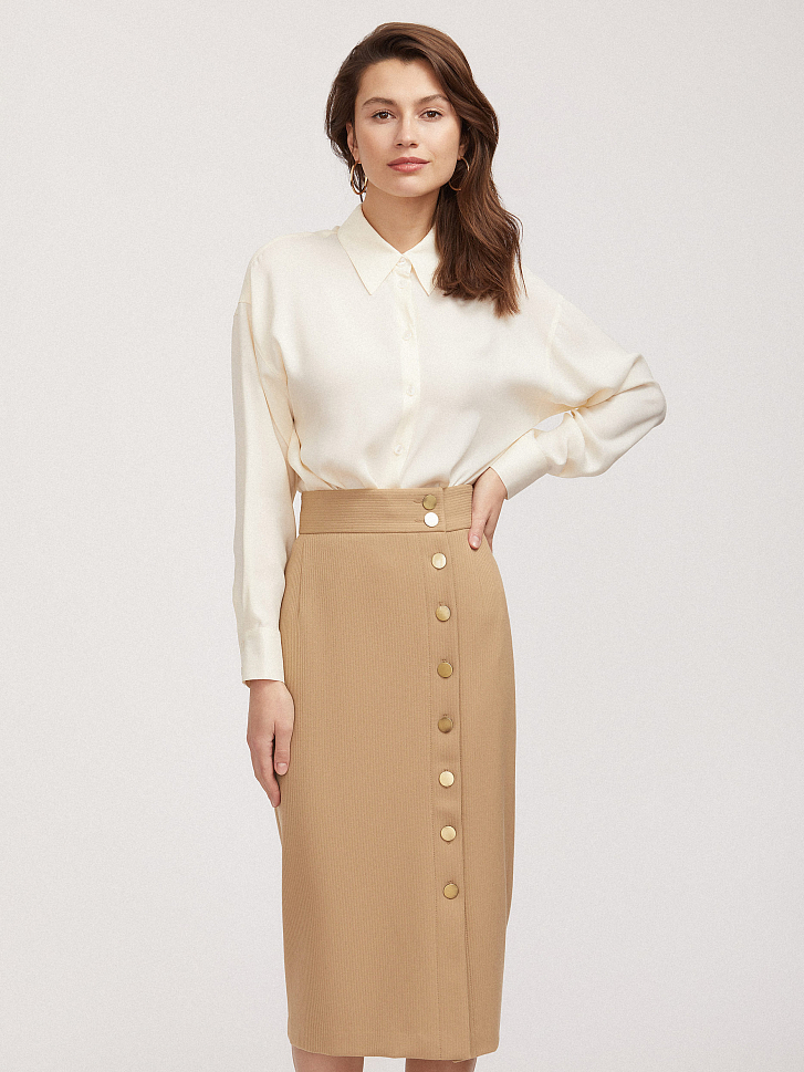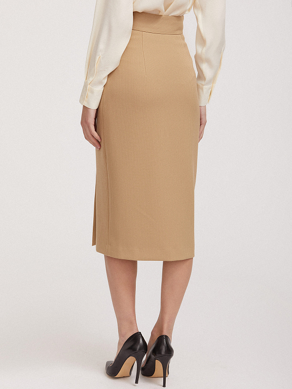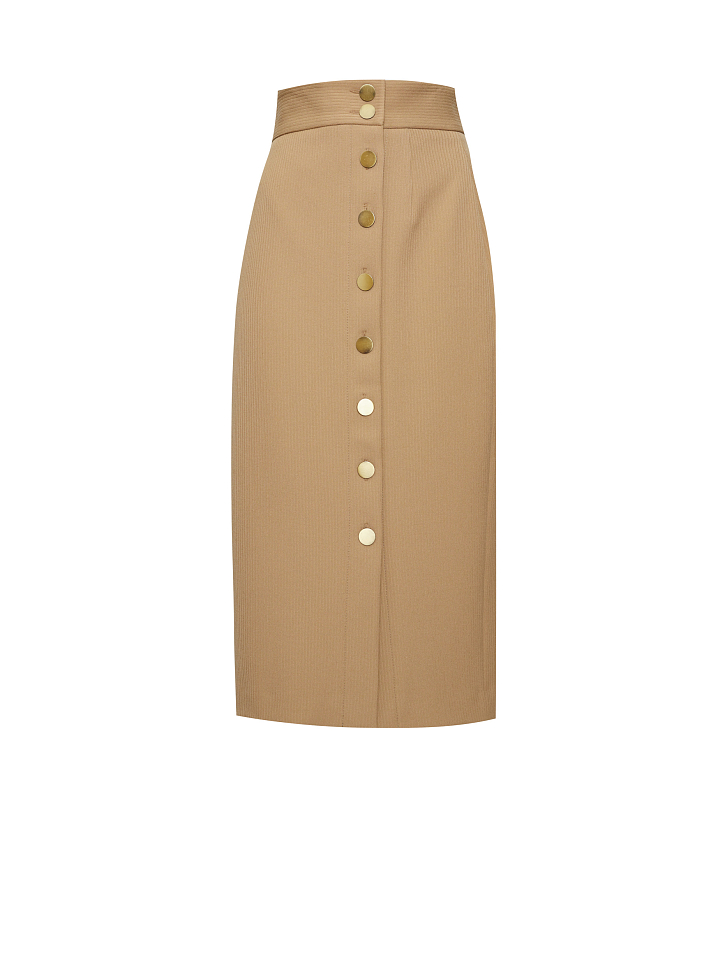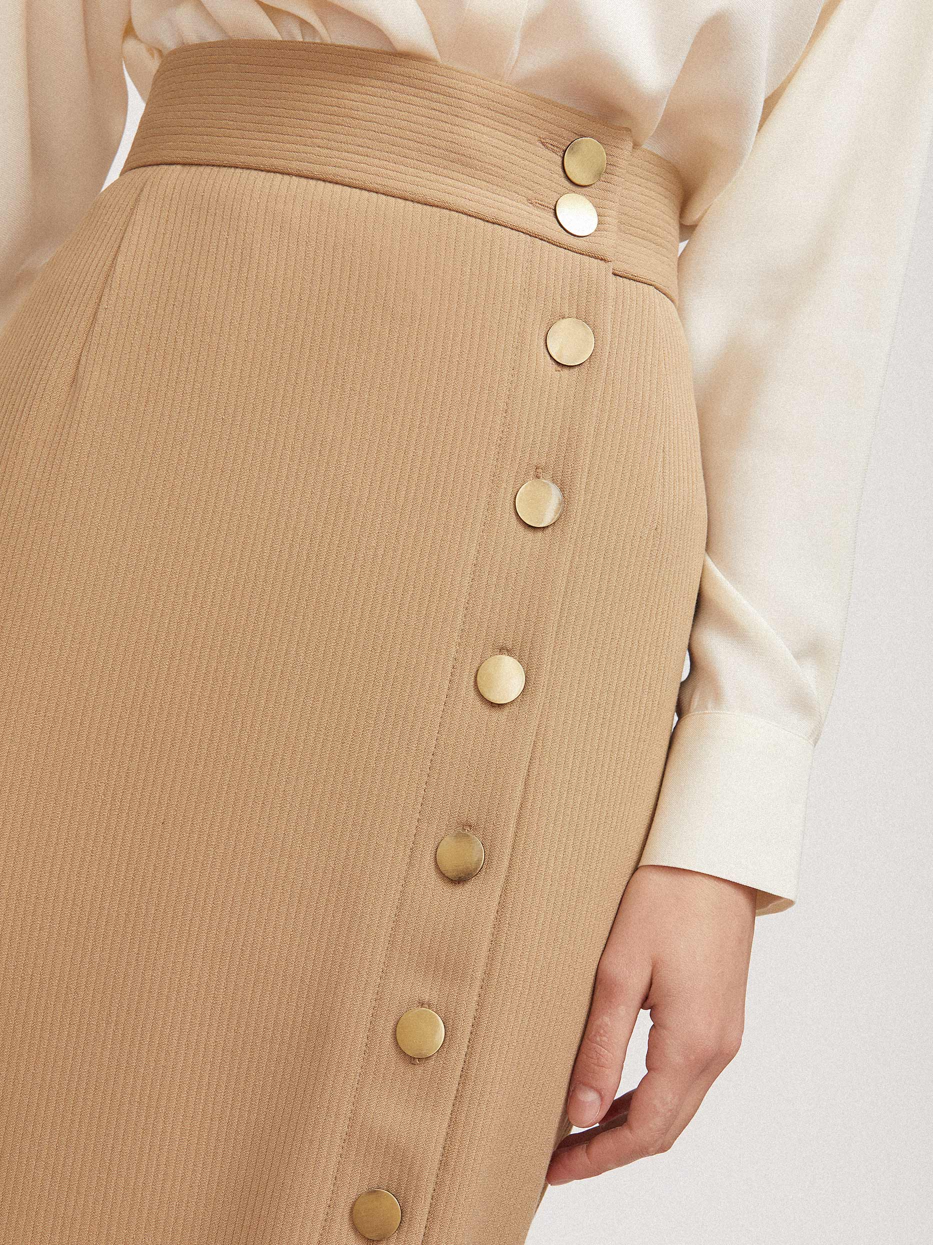 Юбка в рубчик облегающего силуэта, выполненная из плотной смесовой вискозы. Высокая посадка, застежка на ряд матовых пуговиц. Изделие на подкладке.
