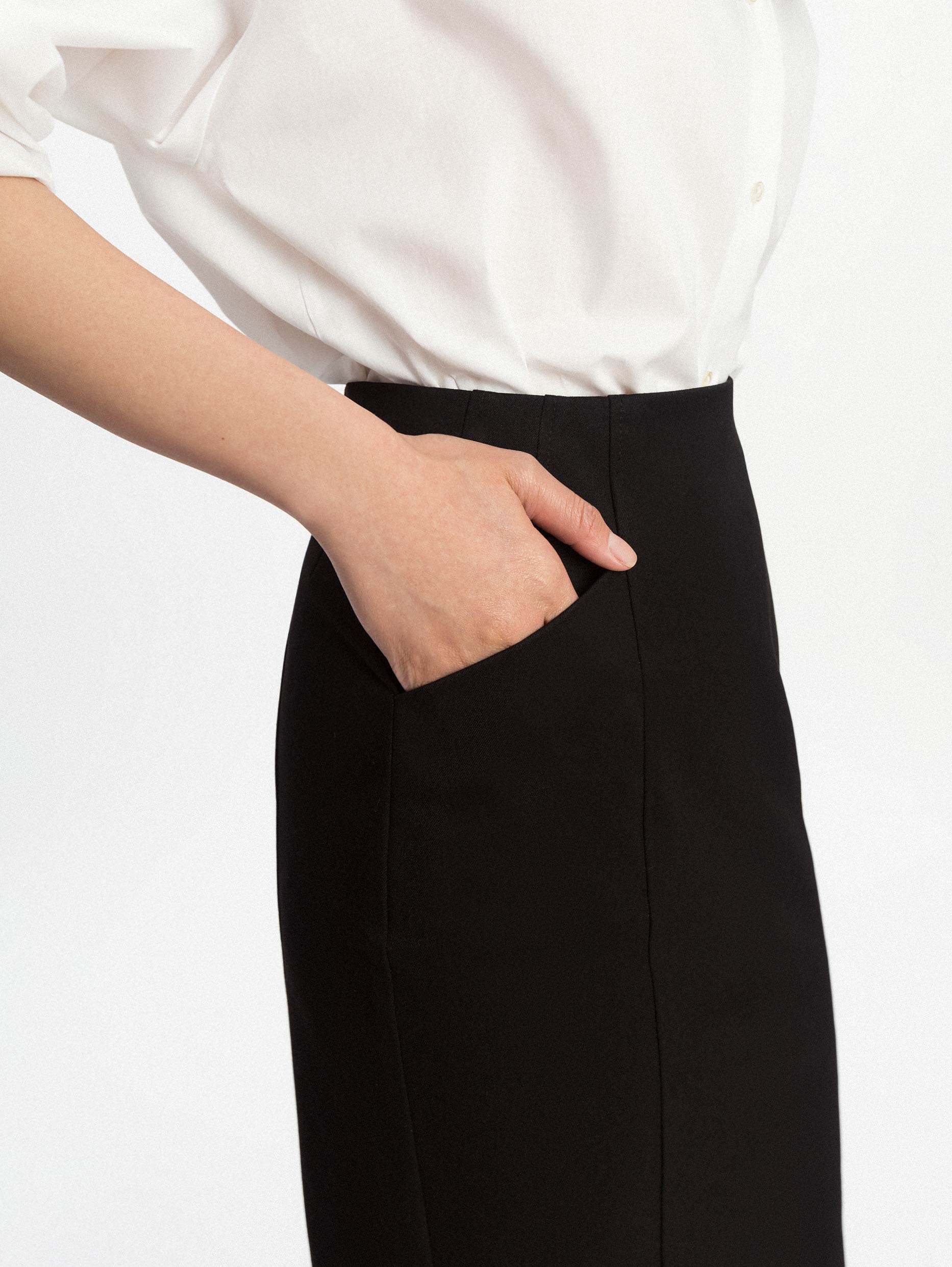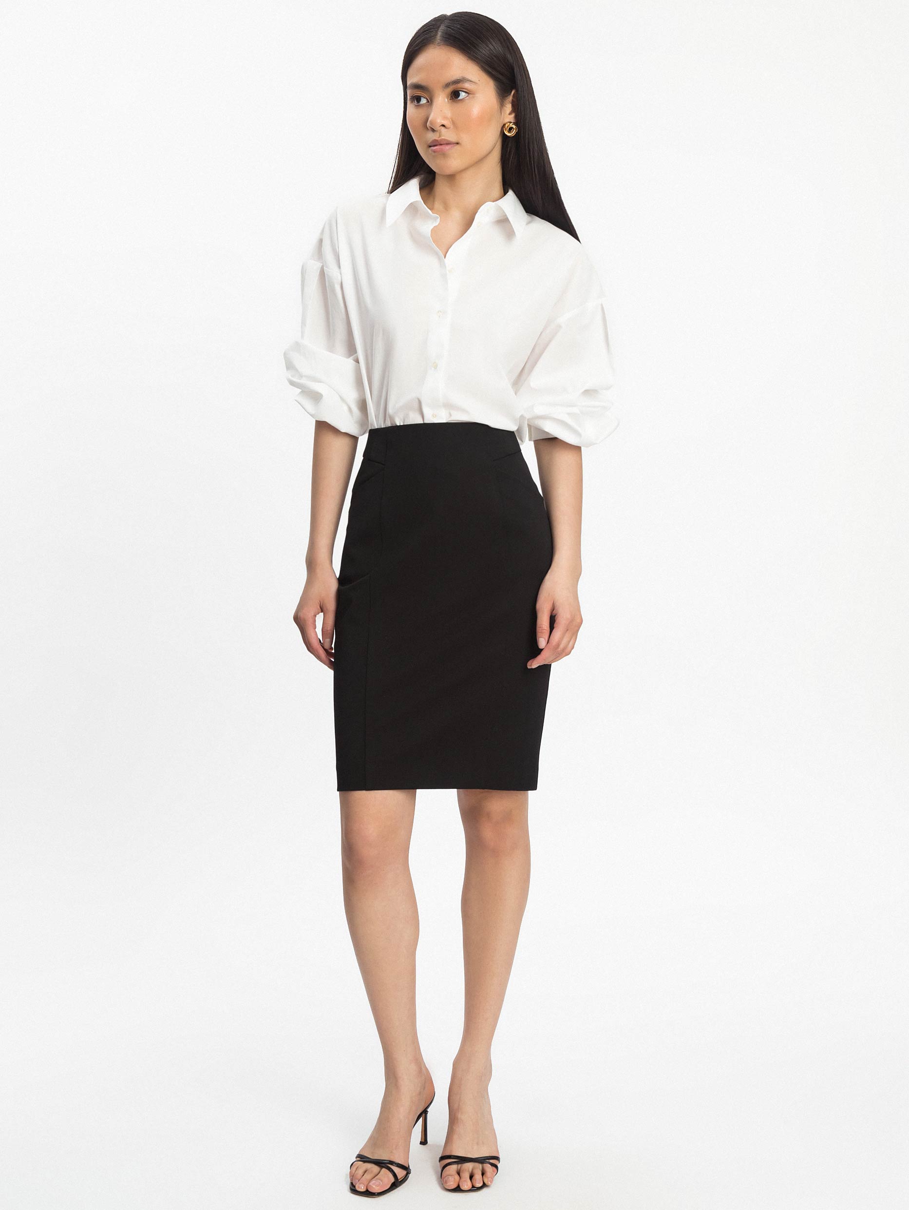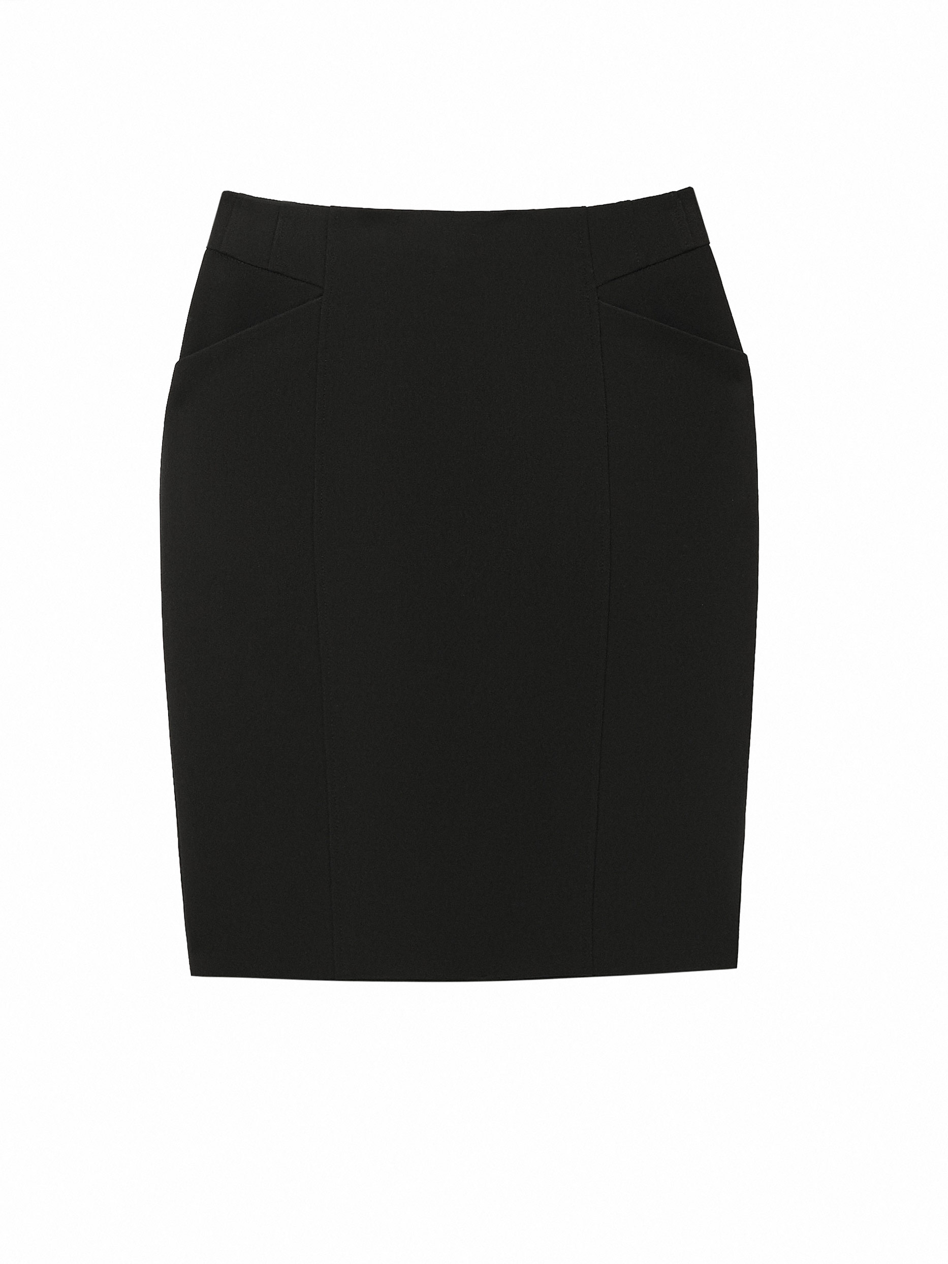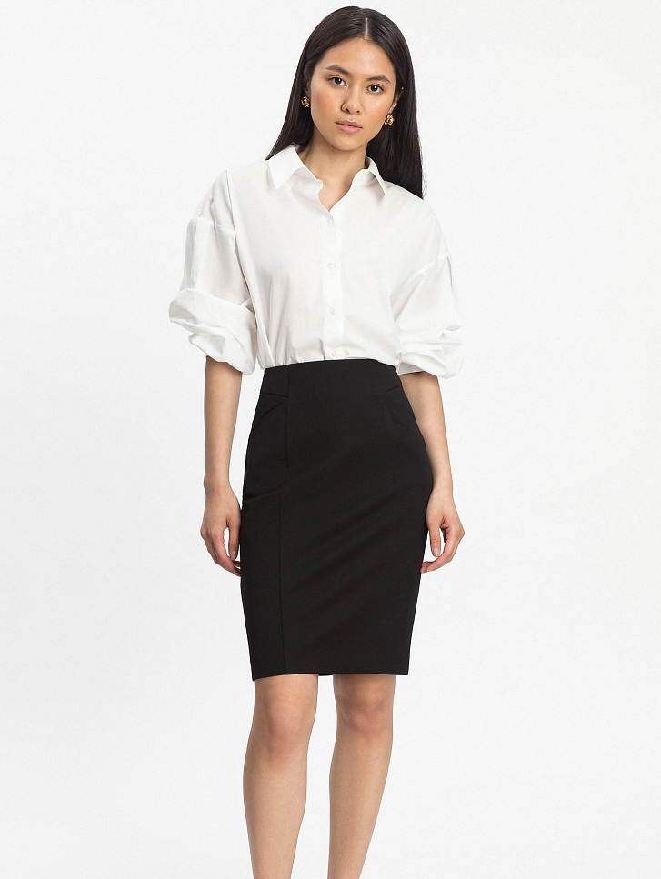 Однотонная юбка из плотной эластичной ткани. Облегающий силуэт, высокая посадка, боковые карманы, шлица, подклад.