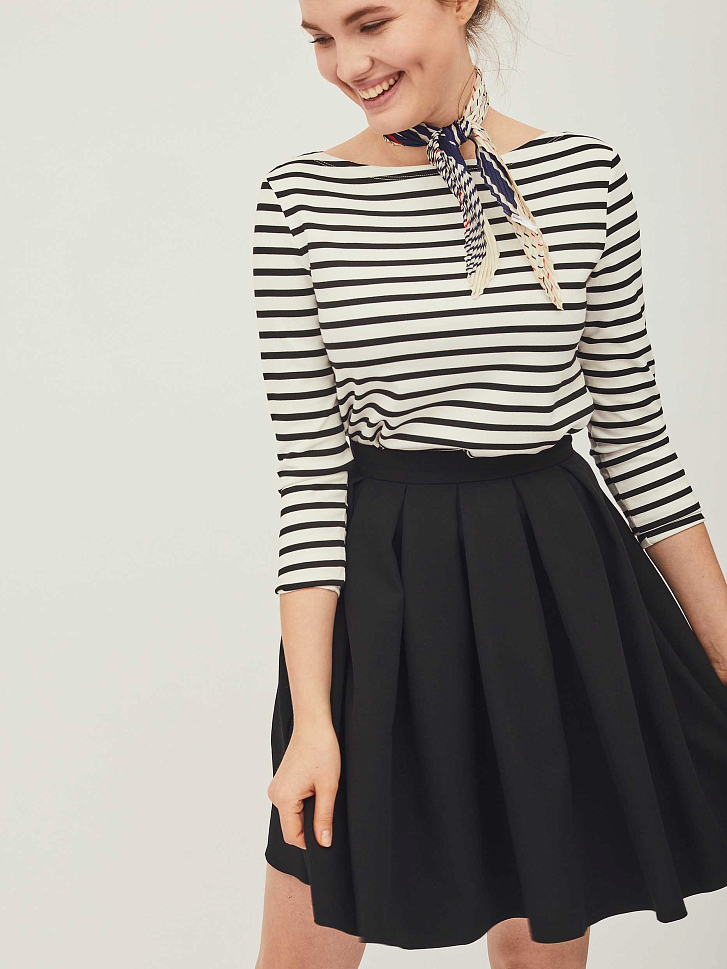 Расклешённая юбка в складку со съёмными лямками. Изделие длиной выше колена. Застёжка на потайную молнию сзади. Юбка с карманами в боковых швах. Изделие без подкладки.  Рост модели 176 см, размер 42 (российский)