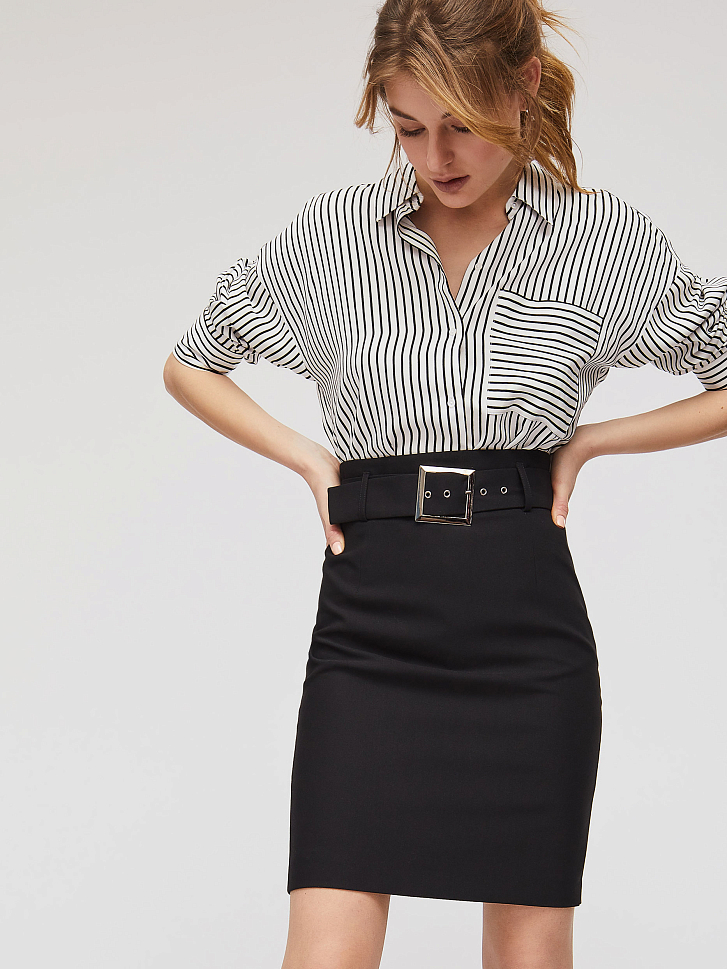 Юбка приталенного кроя длины мини. Широкий пояс в тон, высокая посадка, шлица. Застегивается на потайную молнию сзади.