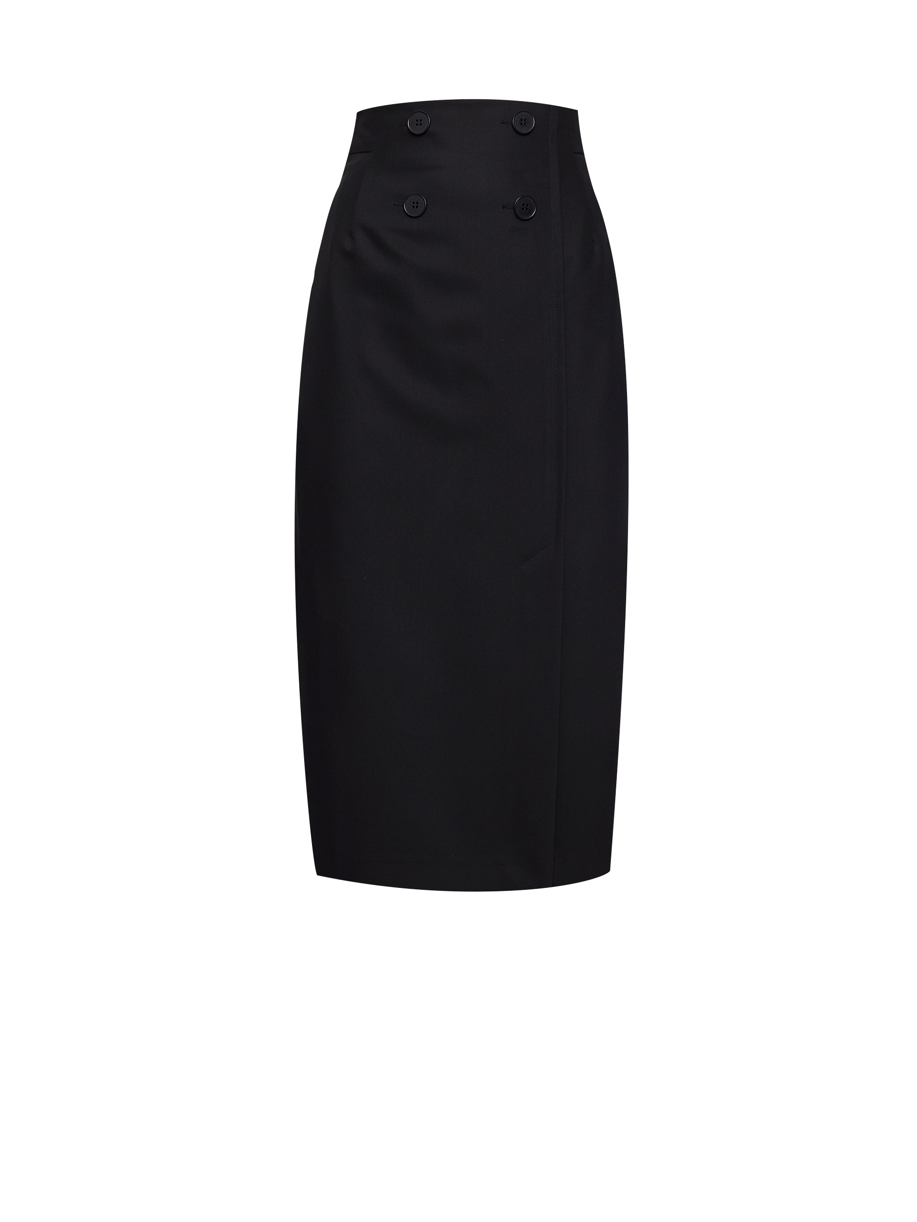 Однотонная прямая юбка с декоративными рядами пуговиц. Высокая посадка, шлица по левой ноге, подкладка.