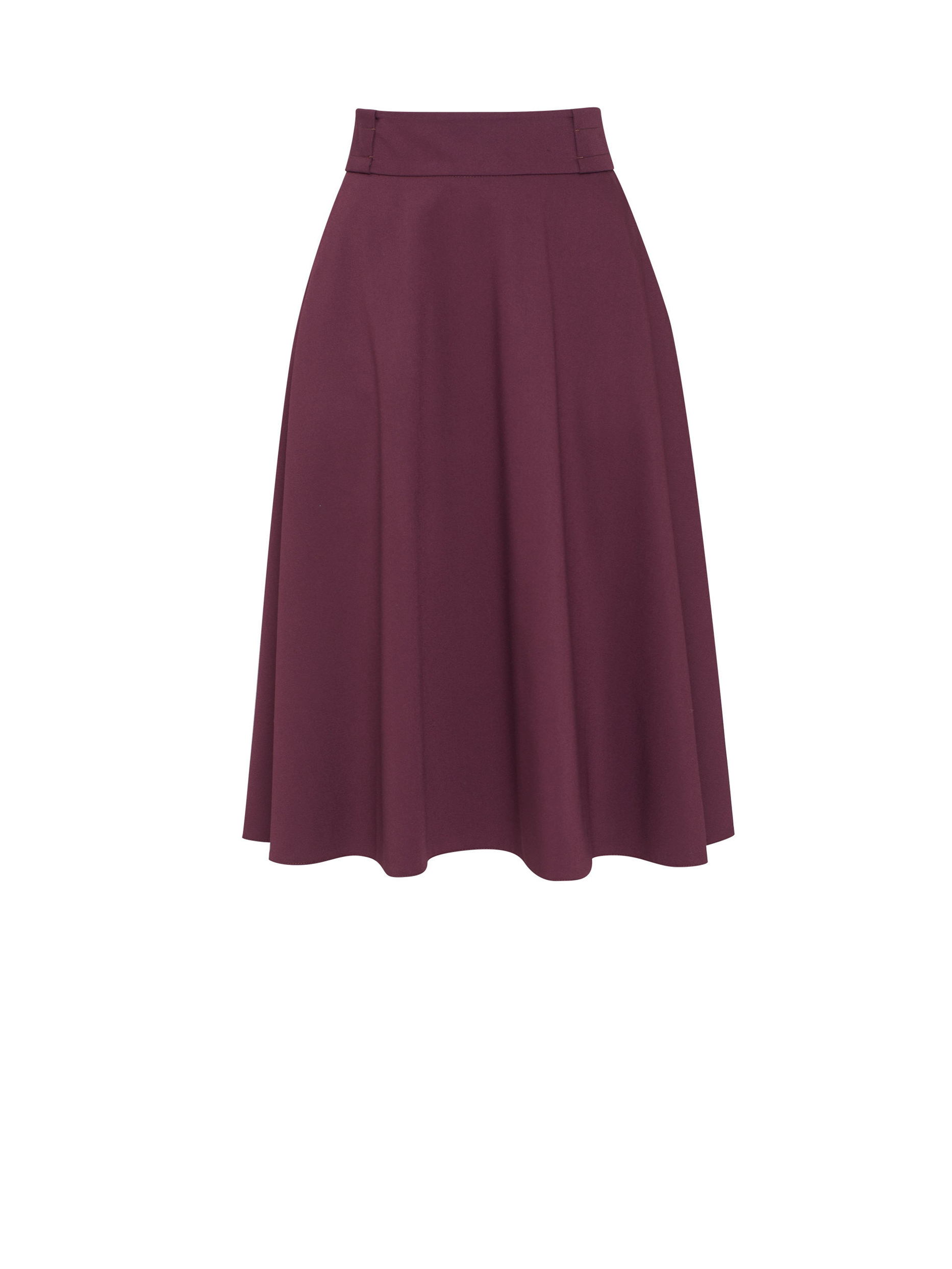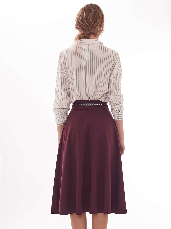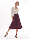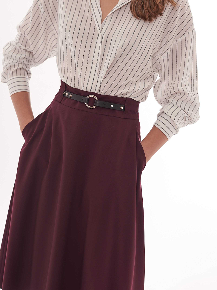 Расклешённая юбка длины миди с боковыми подрезными карманами. Юбка с притачным  поясом с боковыми широкими шлёвками для ремня в комплекте.  Застёжка на потайную молнию сзади. Изделие без подкладки.  Рост модели 175 см, размер 42 (российский)