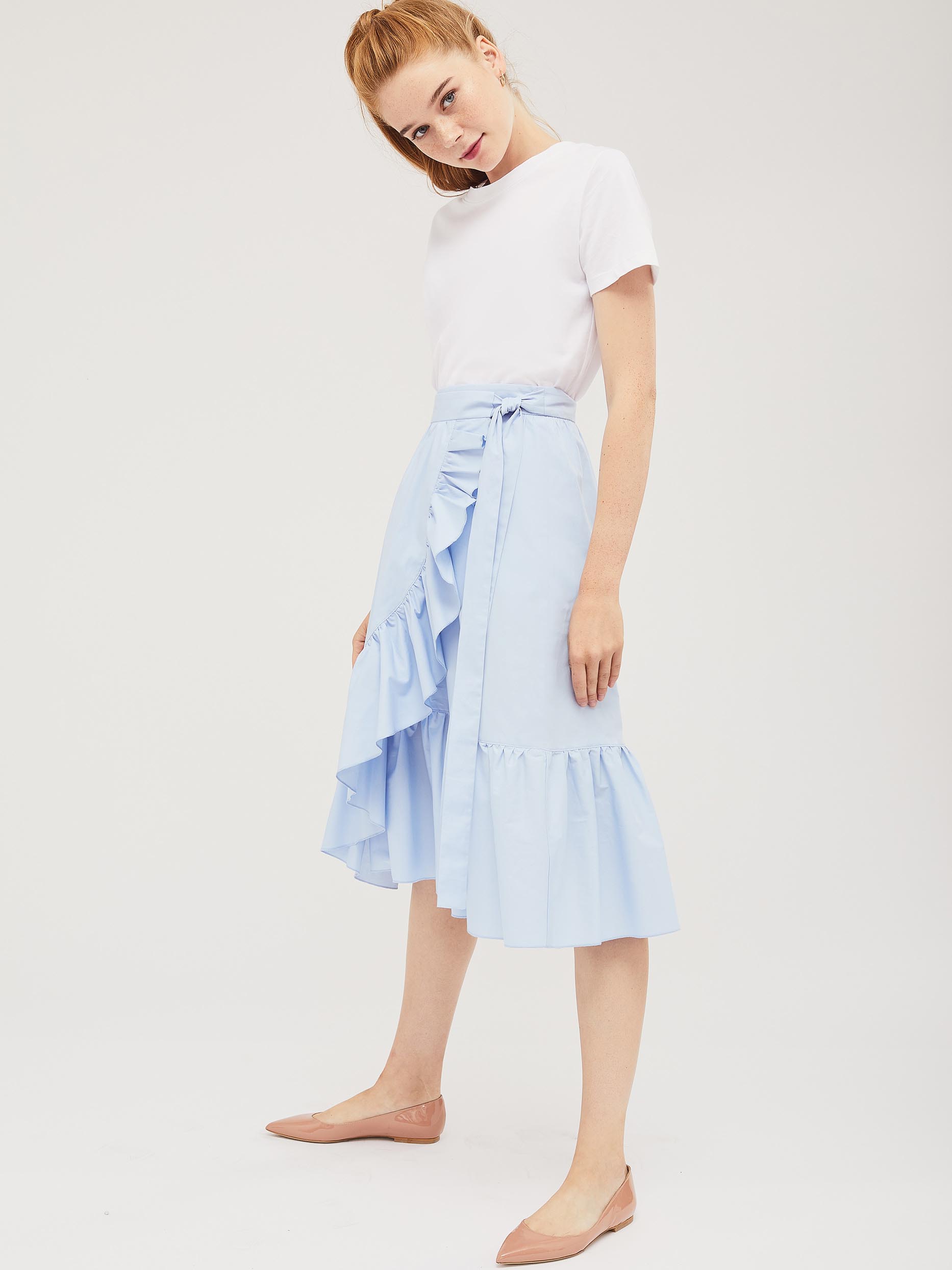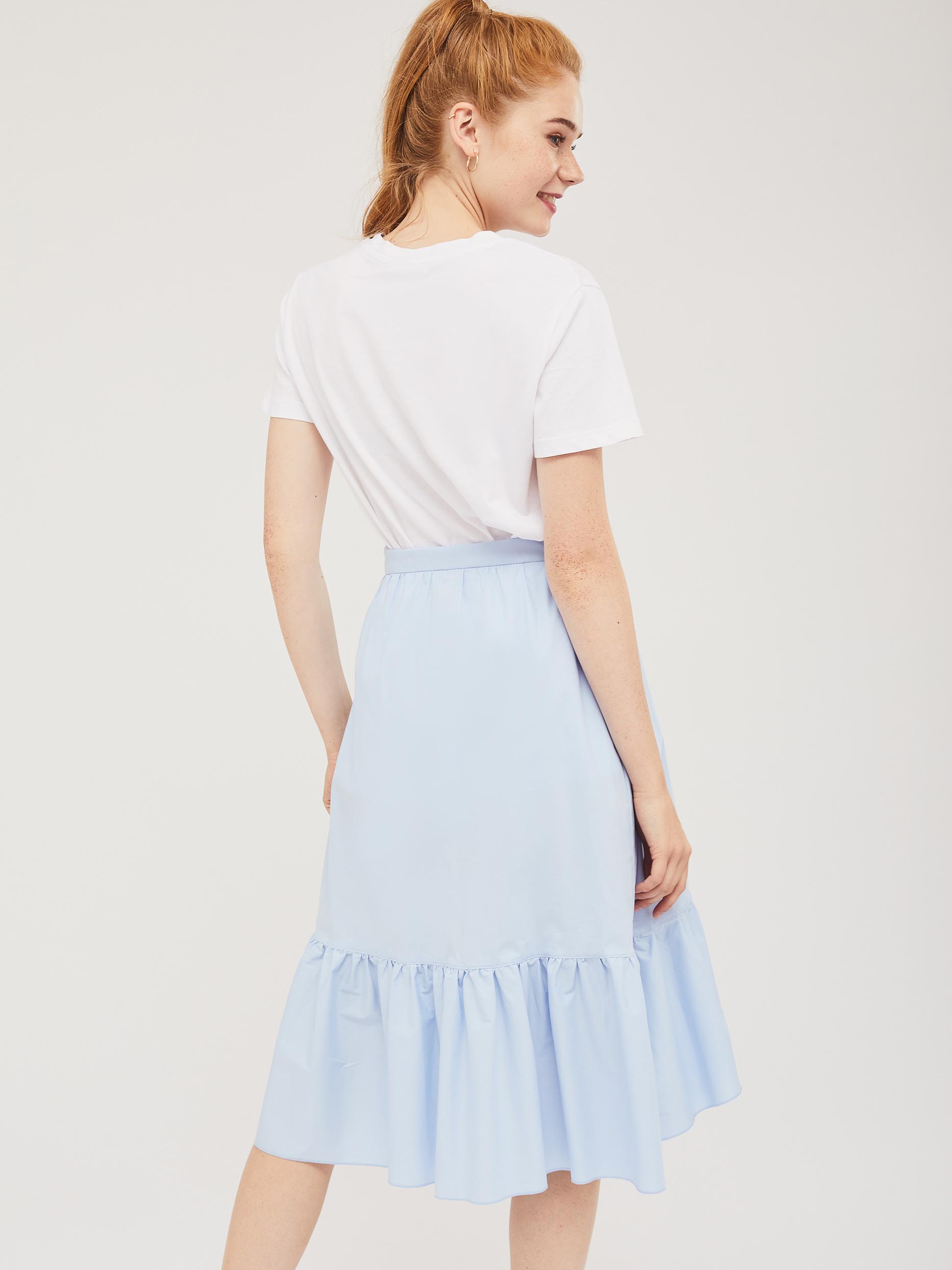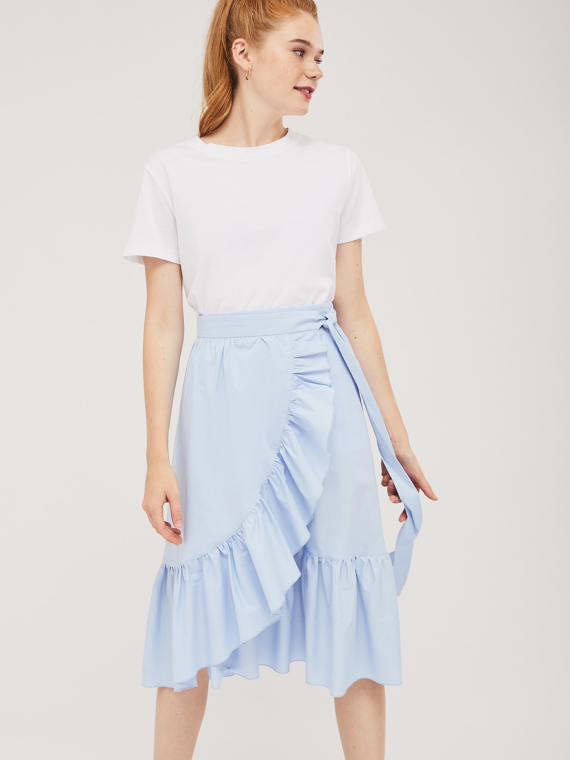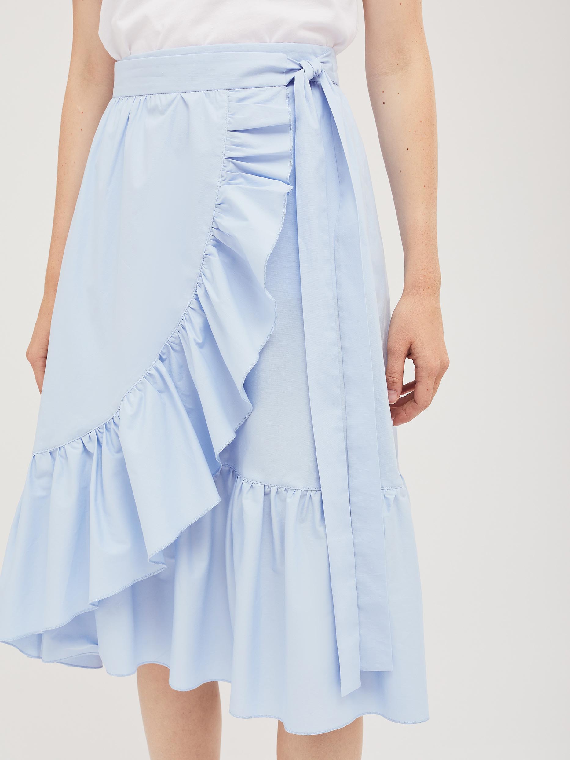 Хлопковая юбка длины миди на запах с завязками и оборкой по краю. Изделие с застёжкой на потайную пуговицу. Изделие без подкладки. Рост модели 172 см, размер 42 (российский)