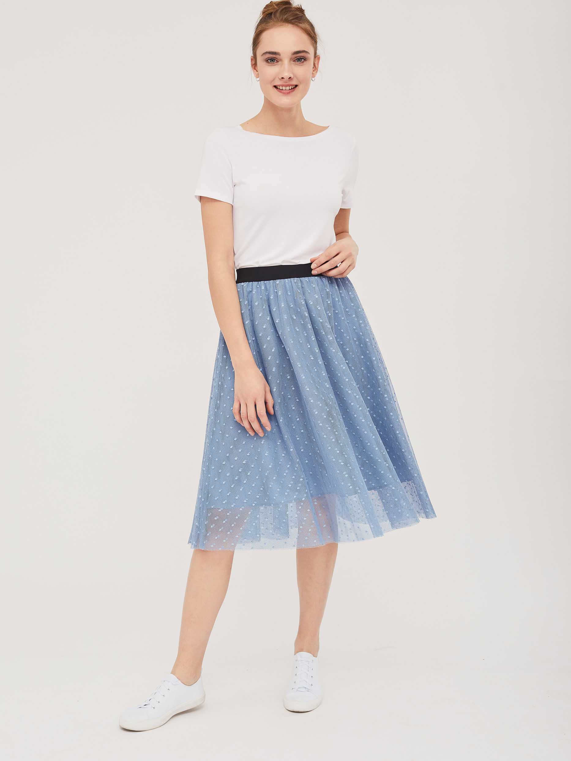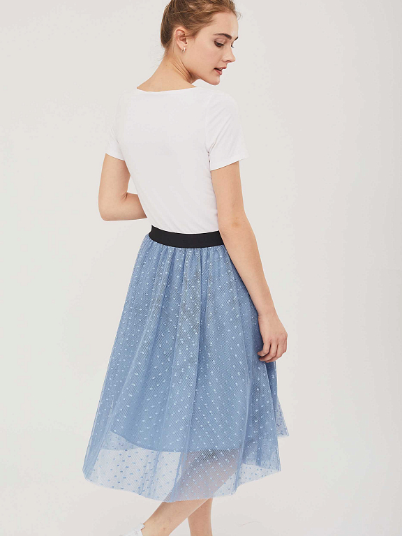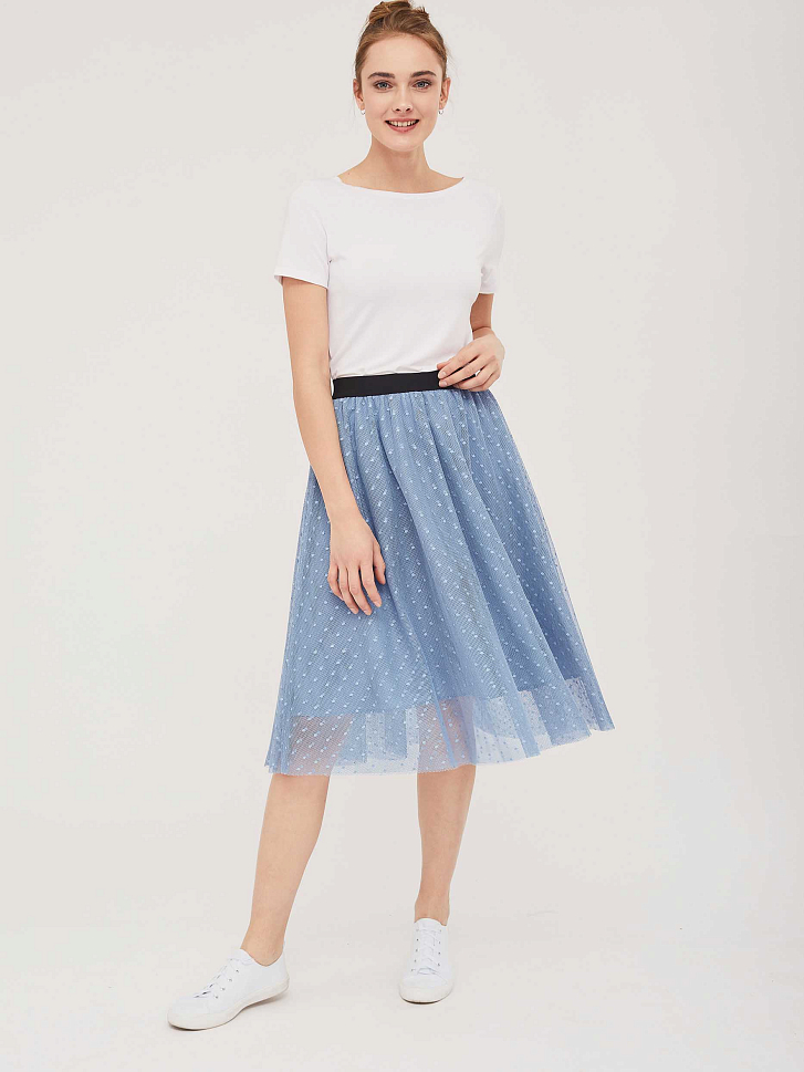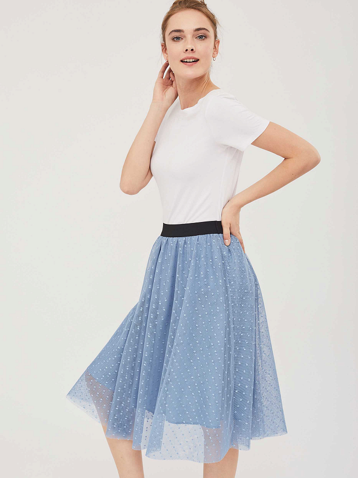 Воздушная юбка из двойной сетки и эластичной контрастной талией. Изделие на  подкладке.  Рост модели 175 см, размер 42 (российский)