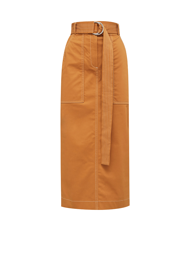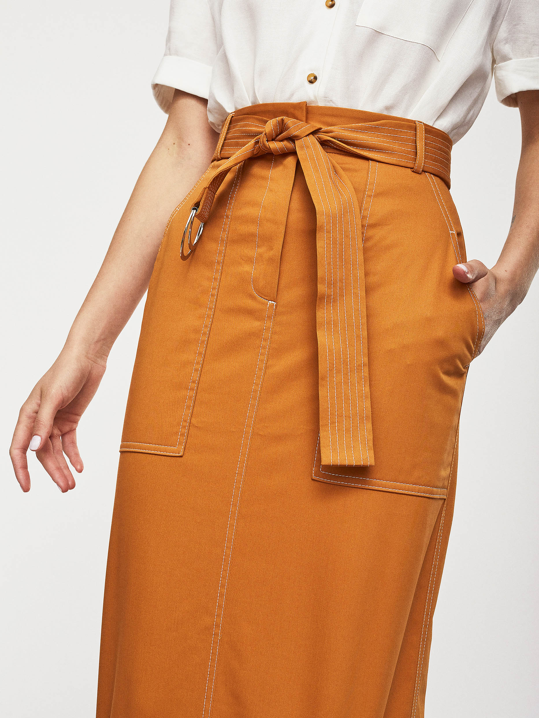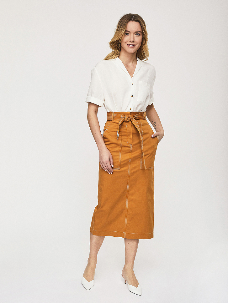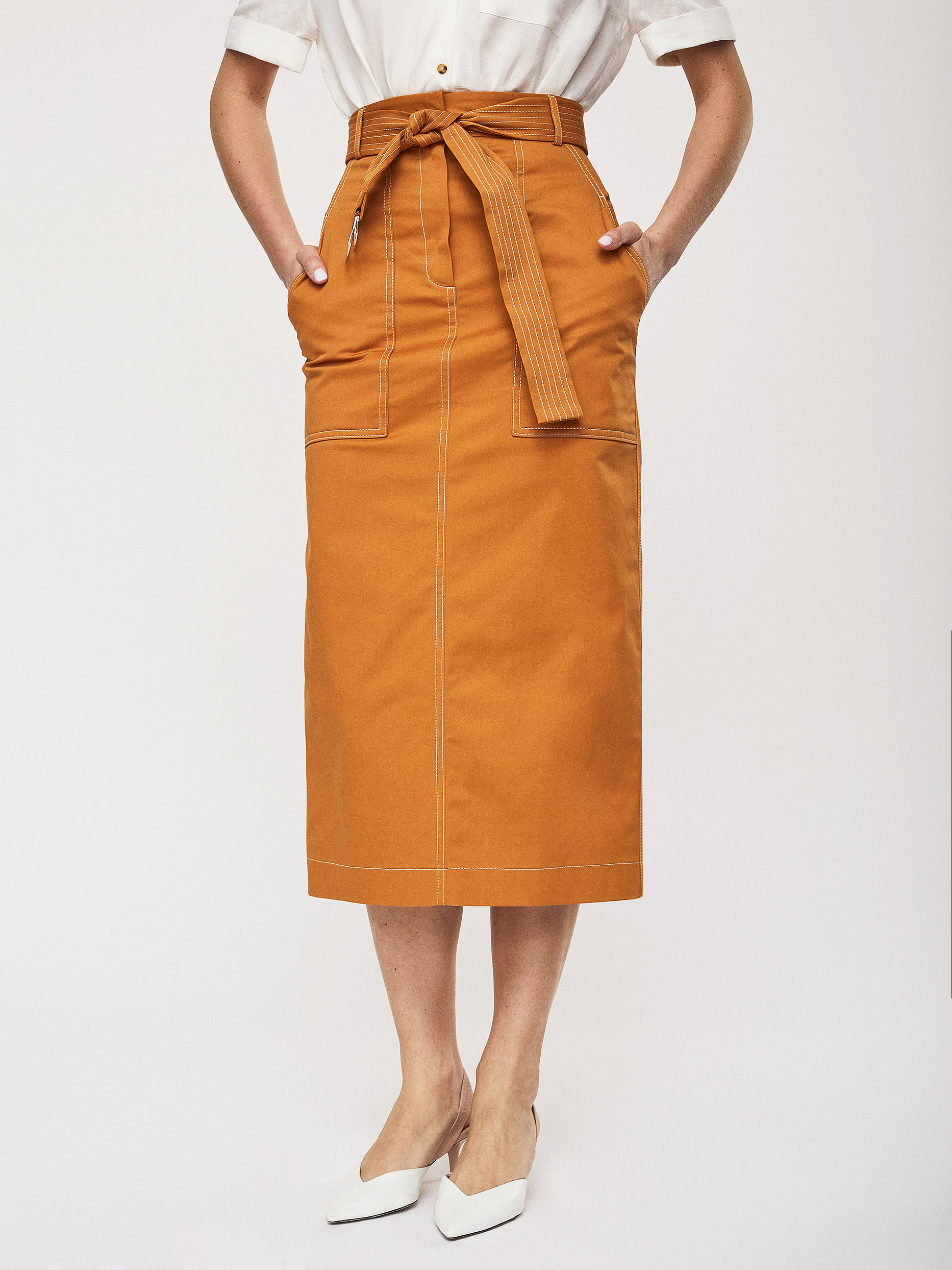 Приталенная юбка, изготовленная из плотного смесового хлопка с поясом из той же ткани. Контрастная строчка, крупные накладные карманы по бокам и шлица сзади.