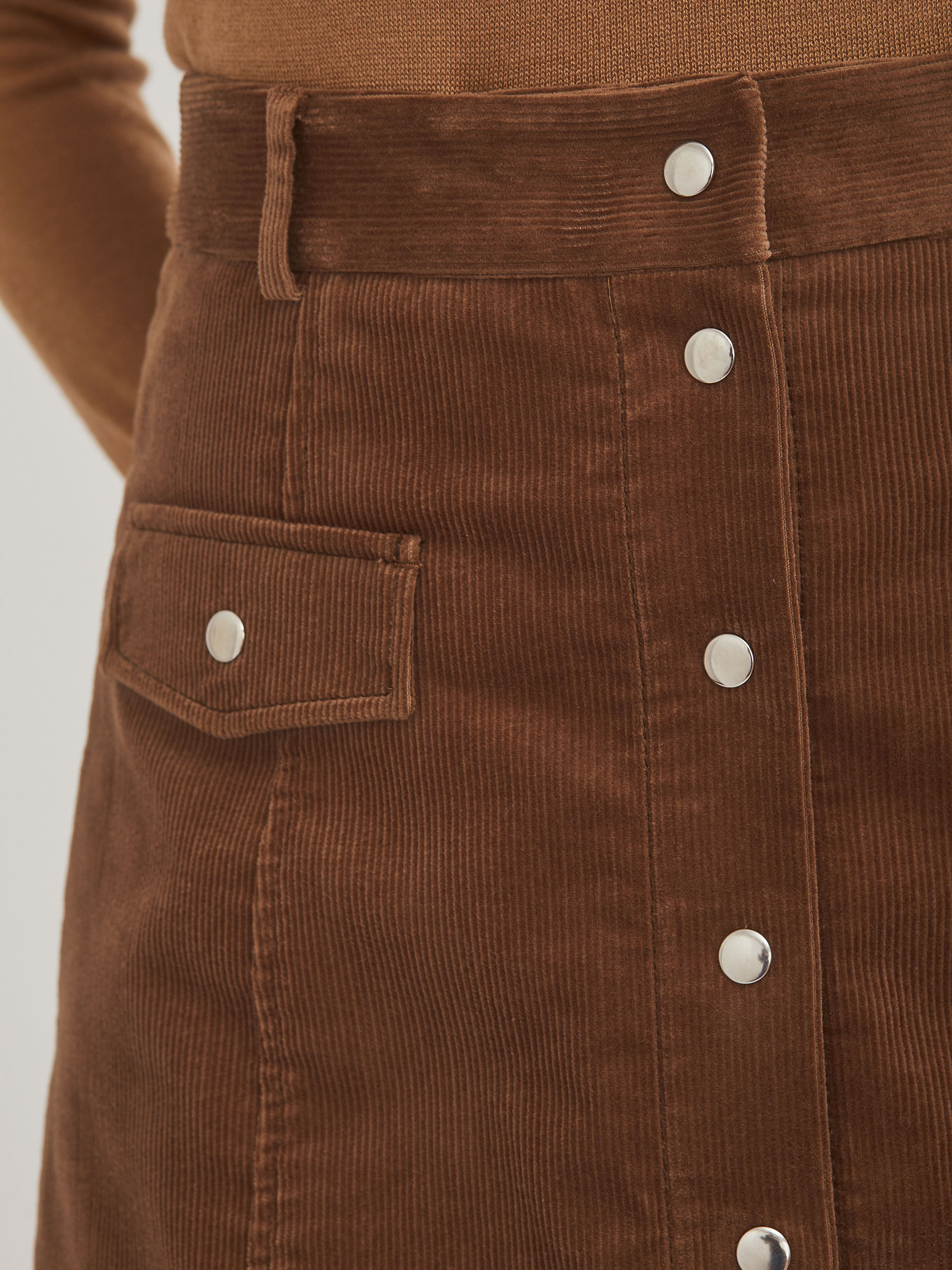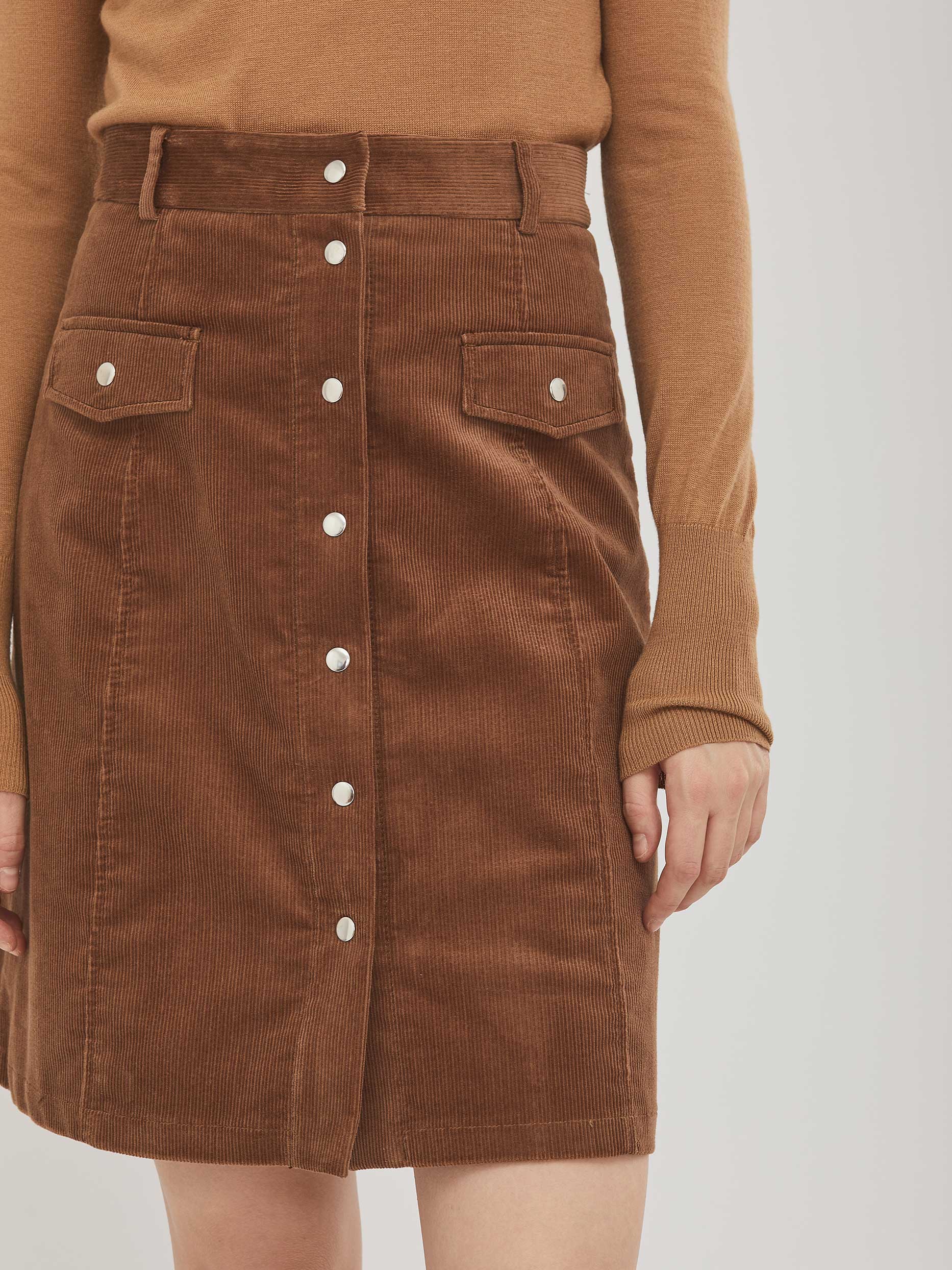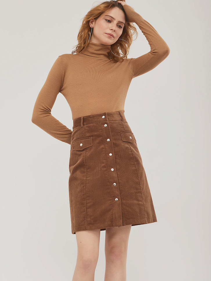 Юбка А-силуэта из вельвета длины "мини". Два кармана с клапанами, застежка на кнопки. Шлёвки для ремня. Изделие без подкладки. Рост модели 176 см, размер 42 (российский)
