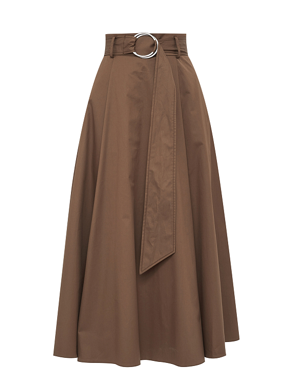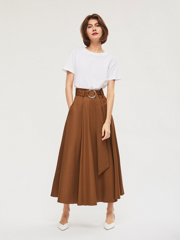 Юбка А-силуэта длины миди, изготовленная из смесового хлопка с поясом из этой же ткани с крупной металлической пряжкой. По бокам карманы. Застежка на потайную молнию.