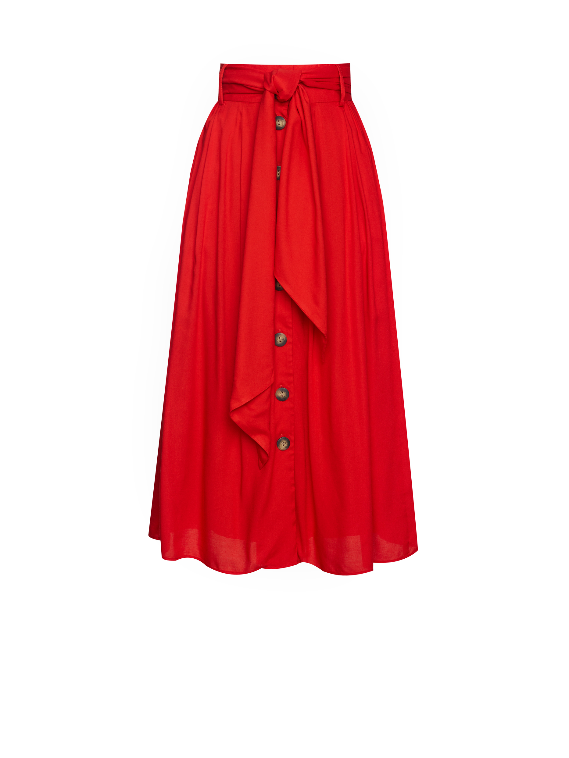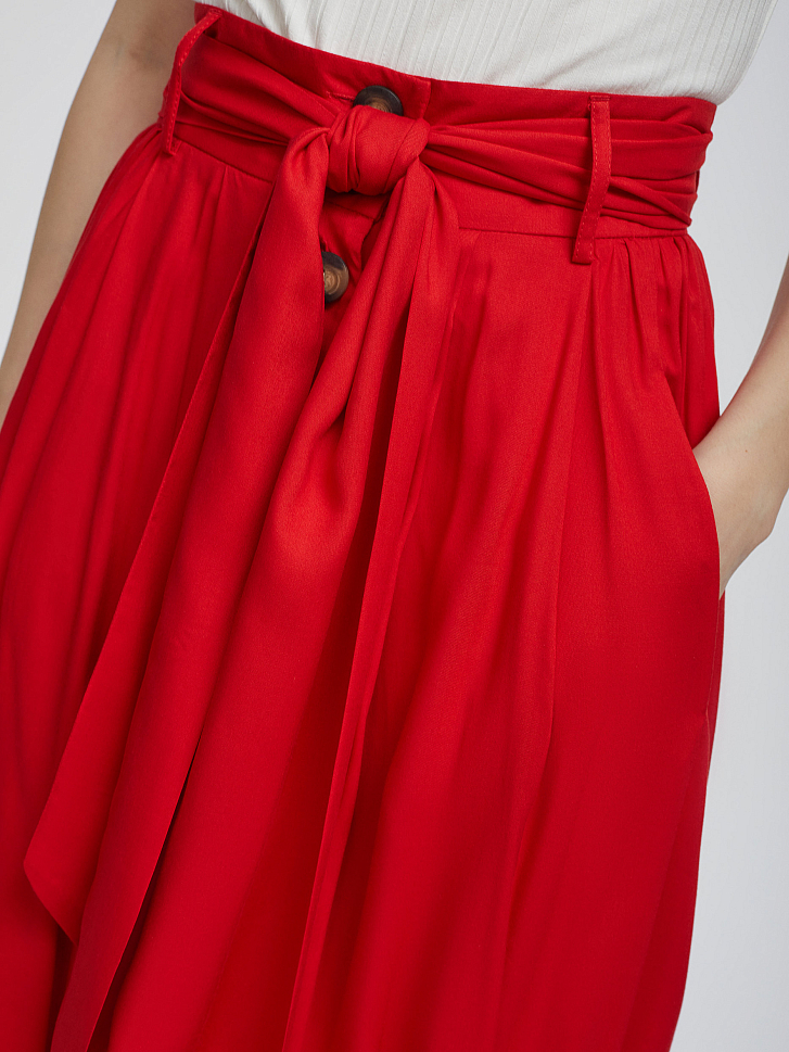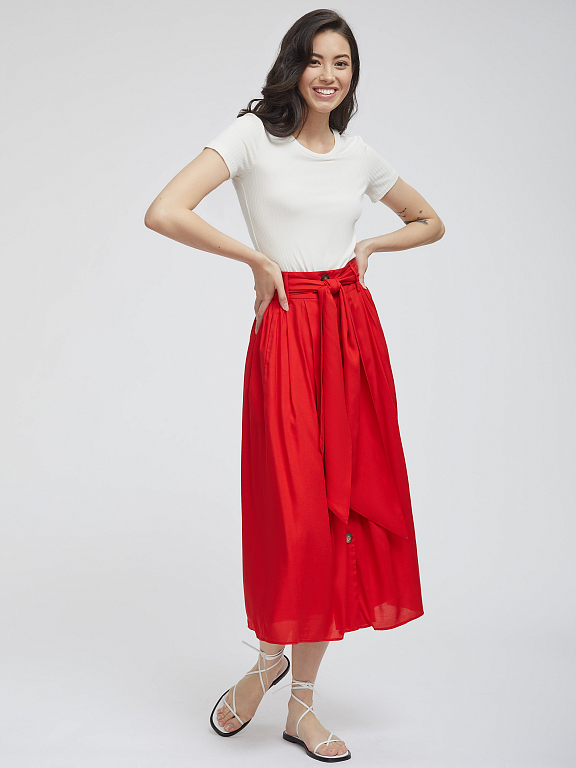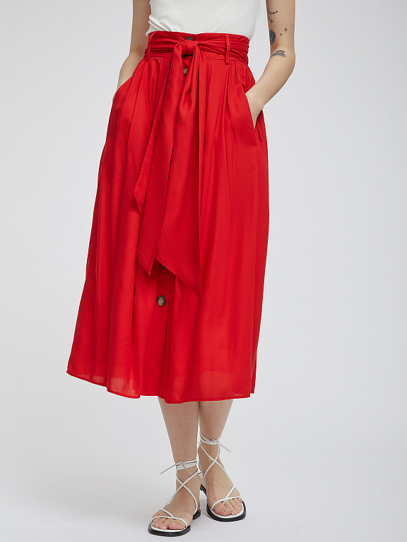 Юбка А-силуэта из легкой вискозы. Высокая посадка, втачной пояс, прорезные карманы по бокам, подклад. Застегивается на ряд пуговиц. В комплекте пояс.
