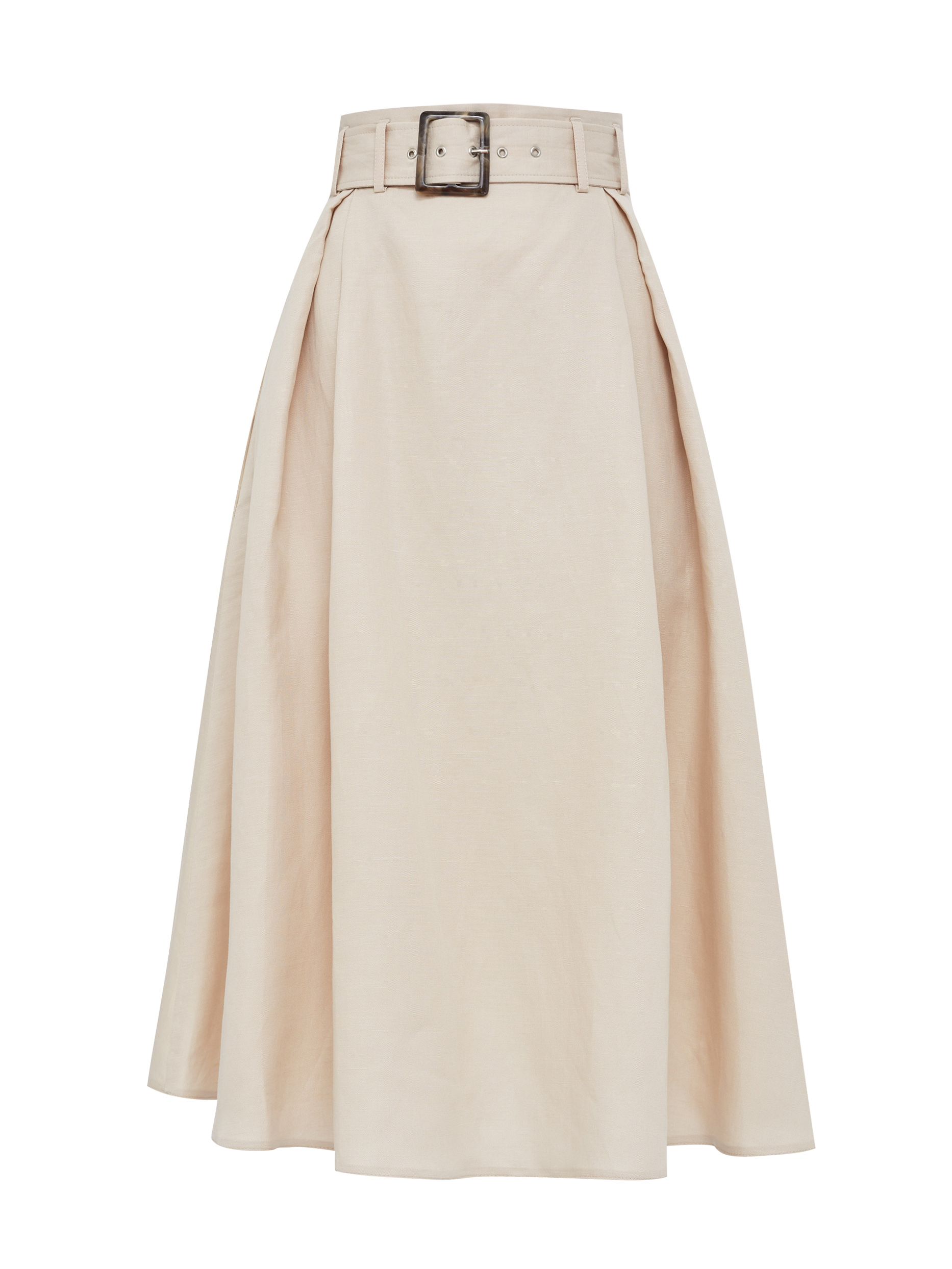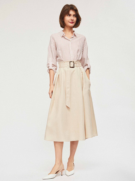 Юбка из смесового льна на талии с поясом в тон. А-силуэт, боковые прорезные карманы и потайная молния сзади.