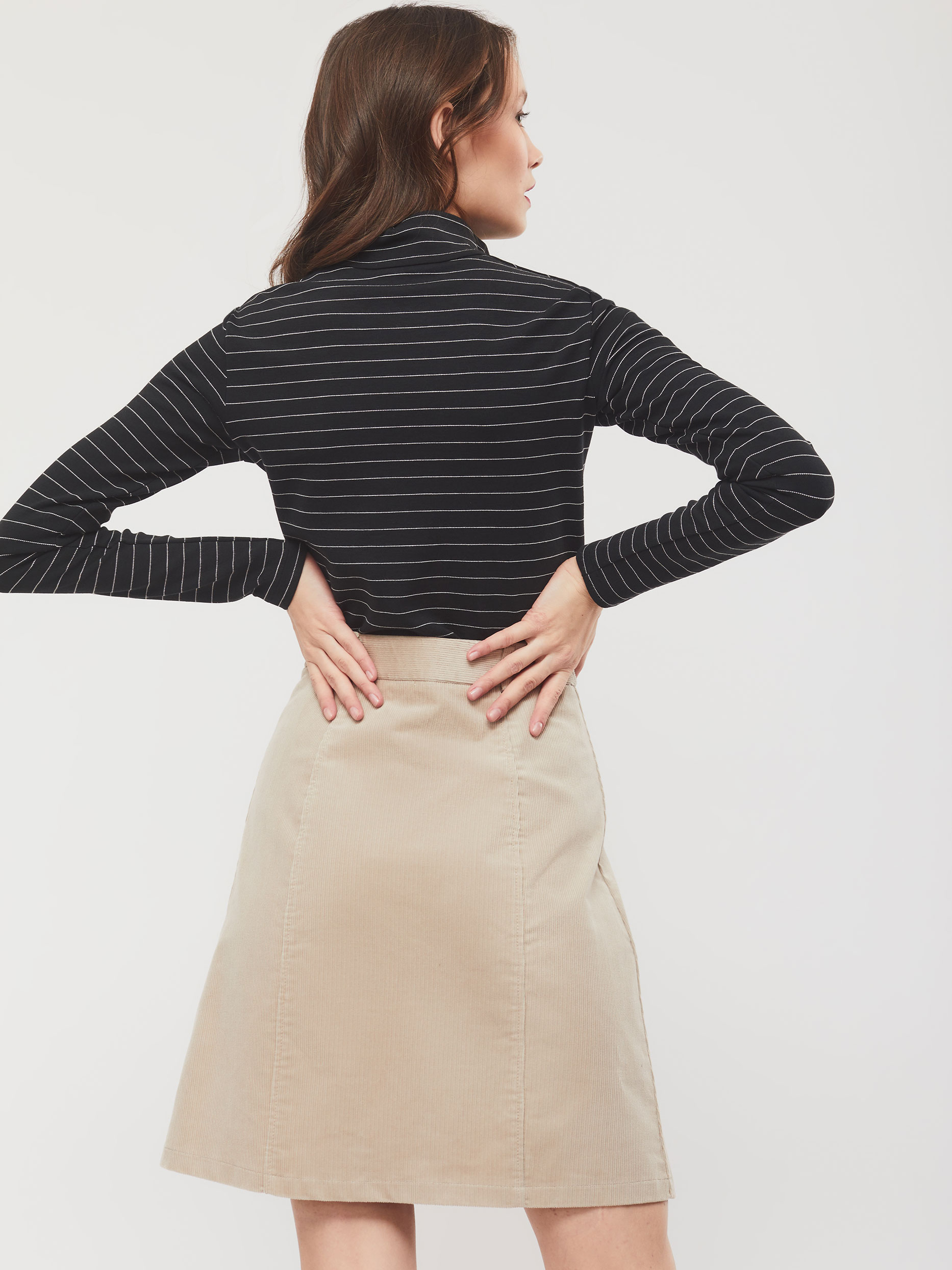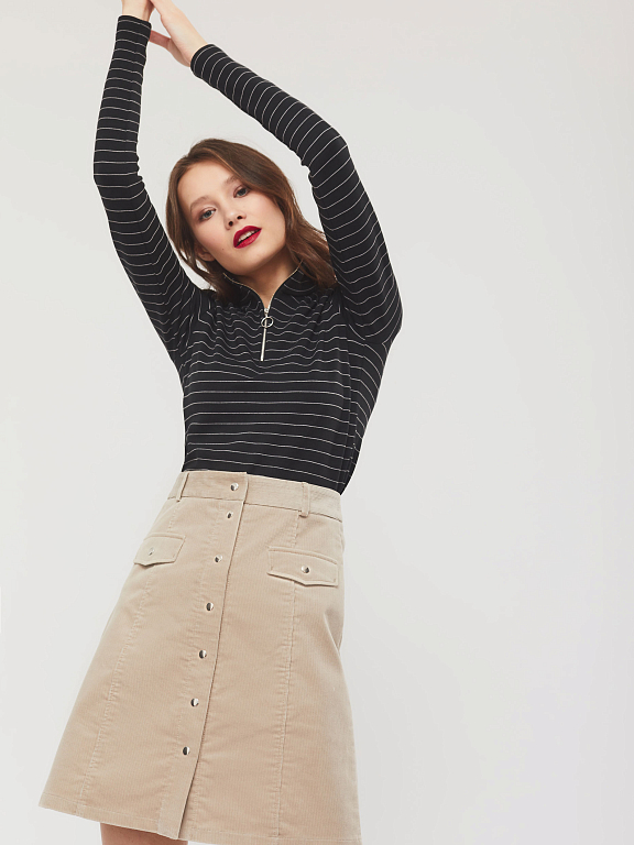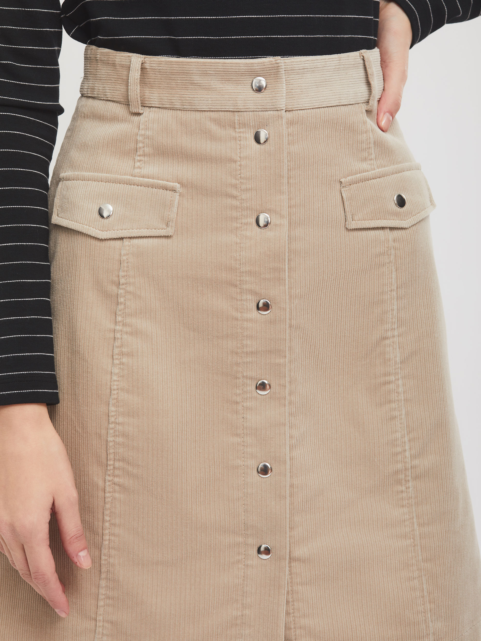 Юбка А-силуэта из вельвета длины "мини". Два кармана с клапанами, застежка на кнопки. Шлёвки для ремня. Изделие без подкладки. Рост модели 176 см, размер 42 (российский)