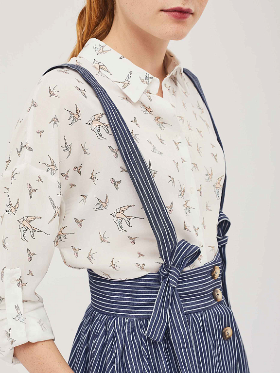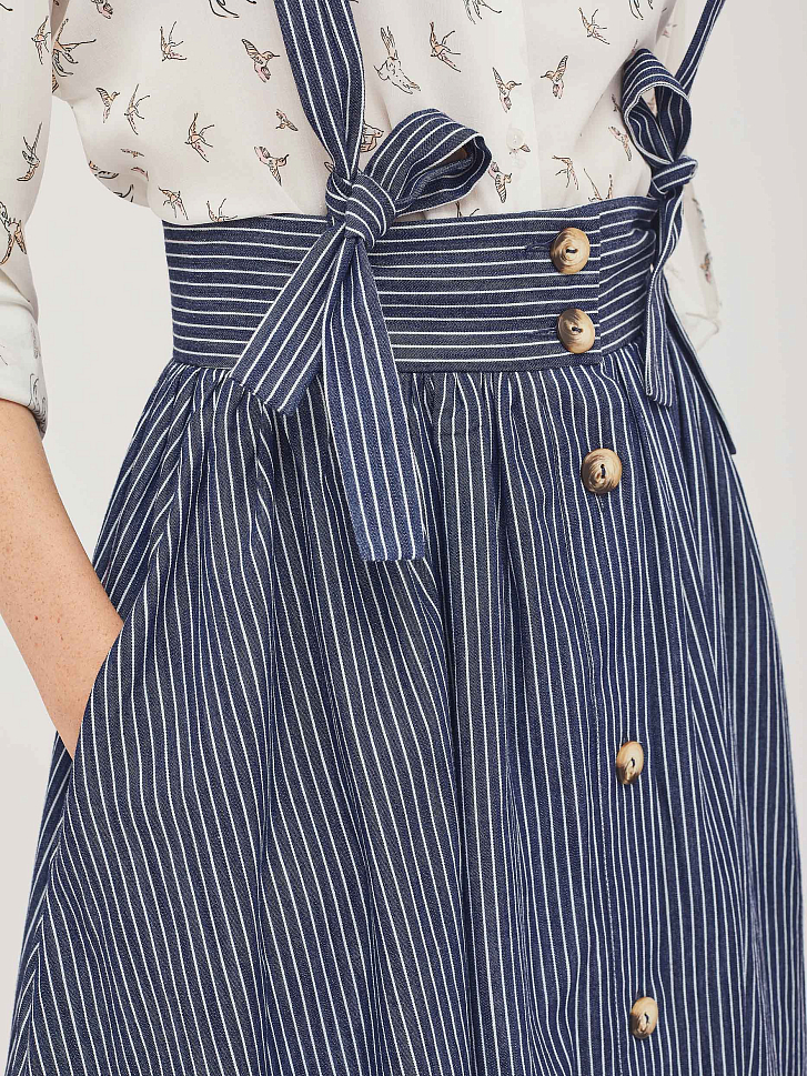 Хлопковая юбка с пуговицами и отстёгивающимися лямками, перекрещенными на спинке. Изделие со сборкой на талии, широким поясом  и карманами в боковых швах. Изделие без подкладки.  Рост модели 175 см, размер 42 (российский)