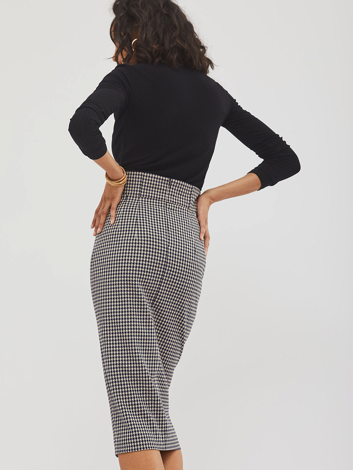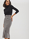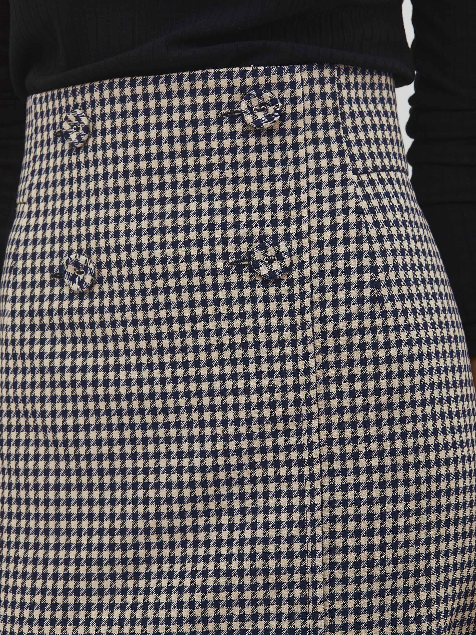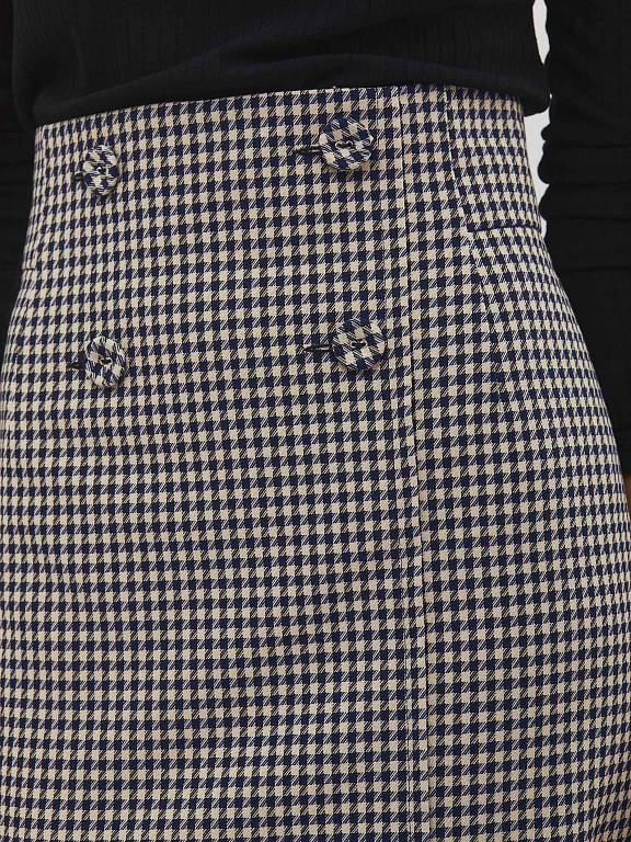 Юбка-карандаш длины миди. Высокая посадка, декоративные ряды из обтянутых пуговиц в тон основной ткани, шлица по левой ноге. Изделие на подкладке.