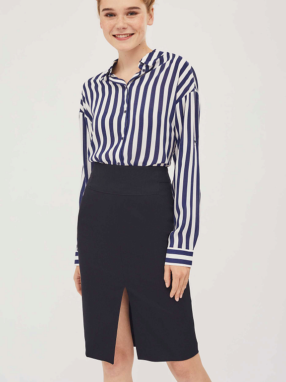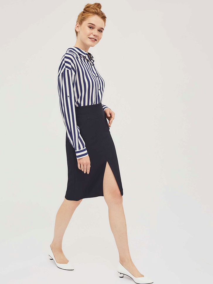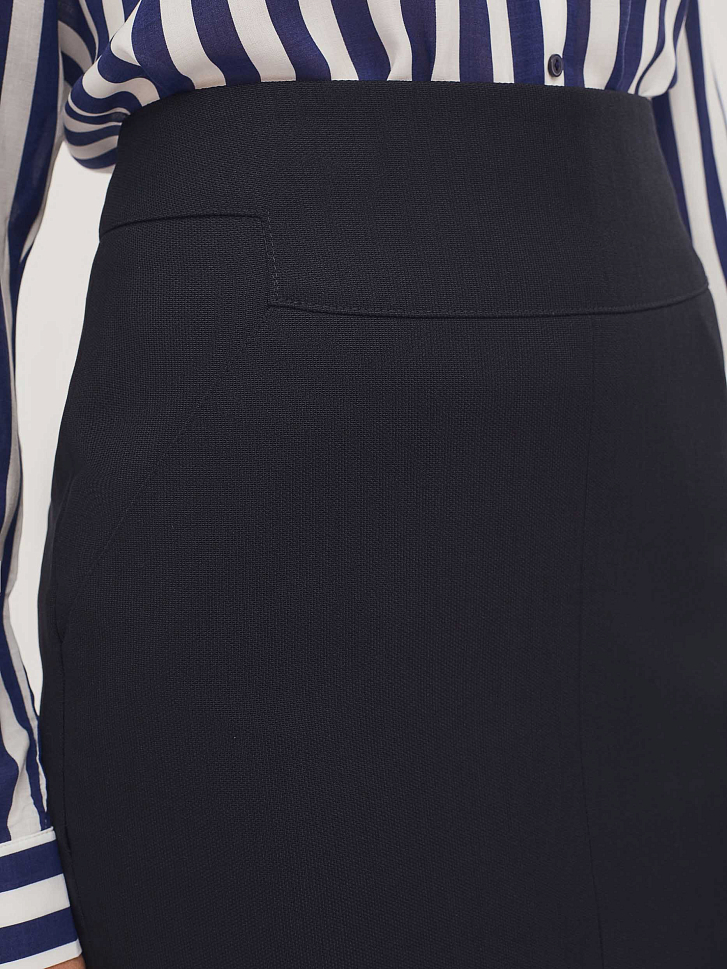 Юбка-карандаш с фигурными подрезами и разрезом спереди. Юбка длиною до колена и застёжкой на потайную молнию сзади. Изделие на подкладке.  Рост модели 172 см, размер 42 (российский)