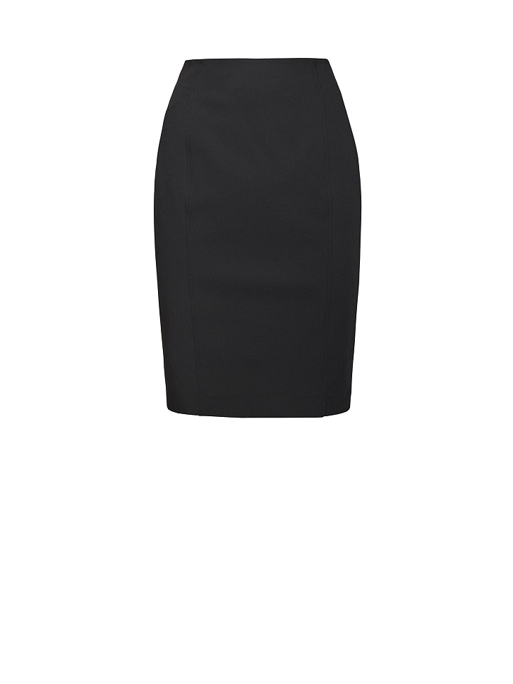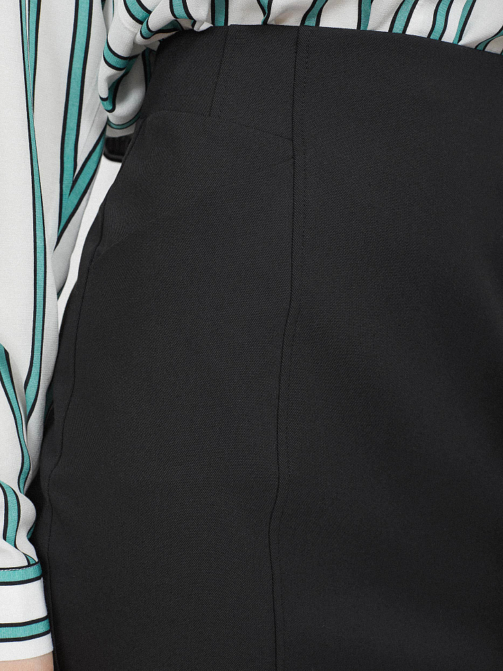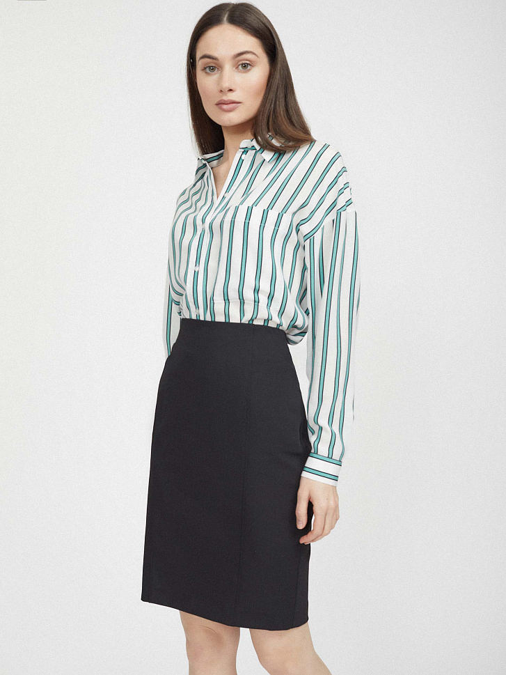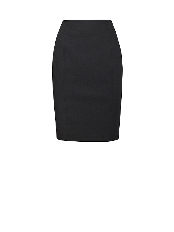 Однотонная юбка из эластичной ткани длины мини. Высокая посадка, прорезные карманы по бокам, шлица, подкладка.