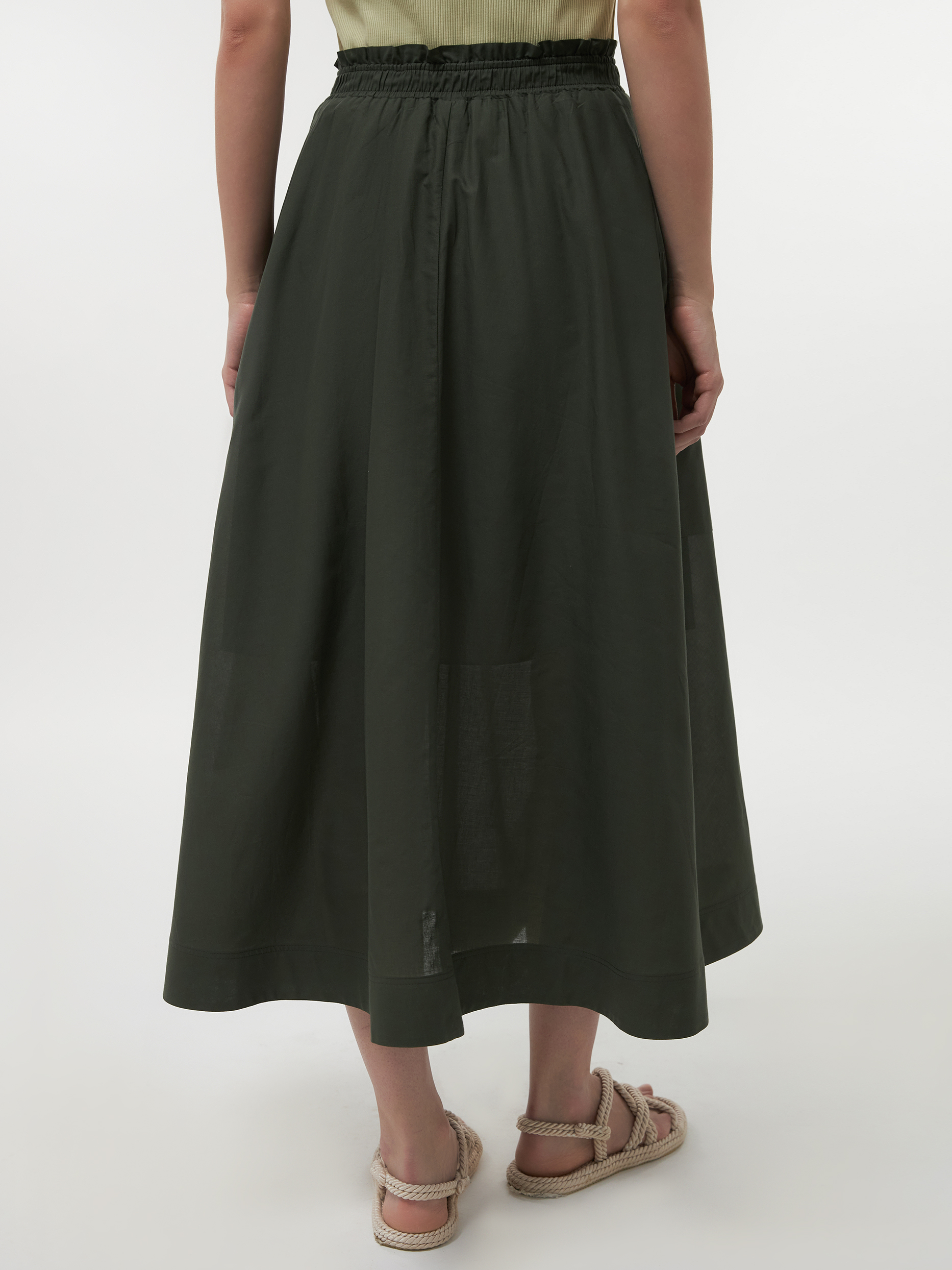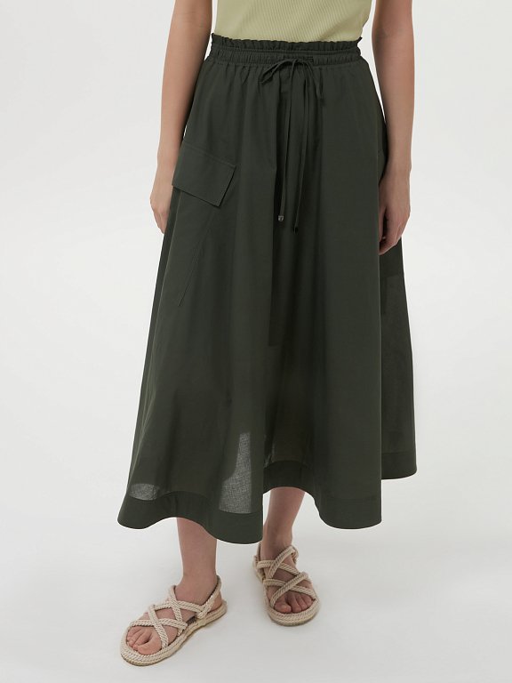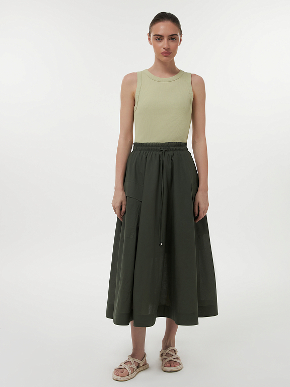 Расклешенная юбка ниже колена дарит свободу движений и выгодно садится на любой тип фигуры. Тонкая полупрозрачная ткань из натурального хлопка обладает дышащими свойствами и обеспечивает комфорт. Кулиска на талии создает удобную посадку и придает женственной юбке спортивный стиль.