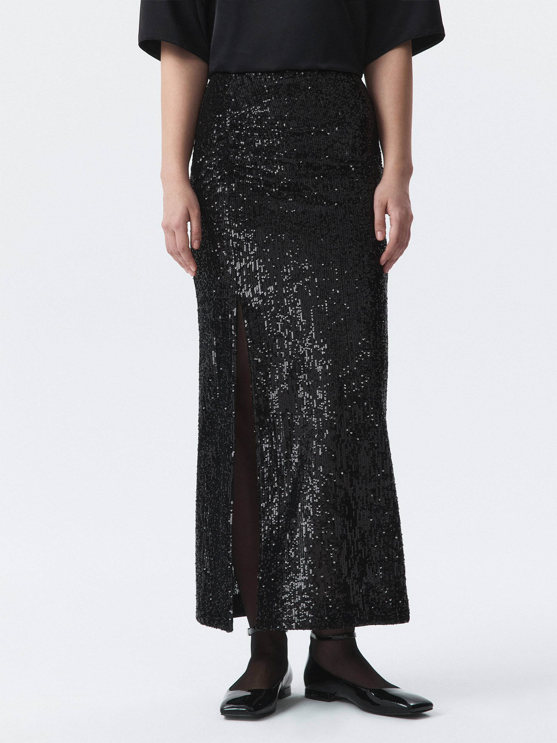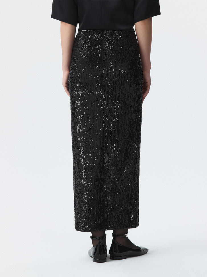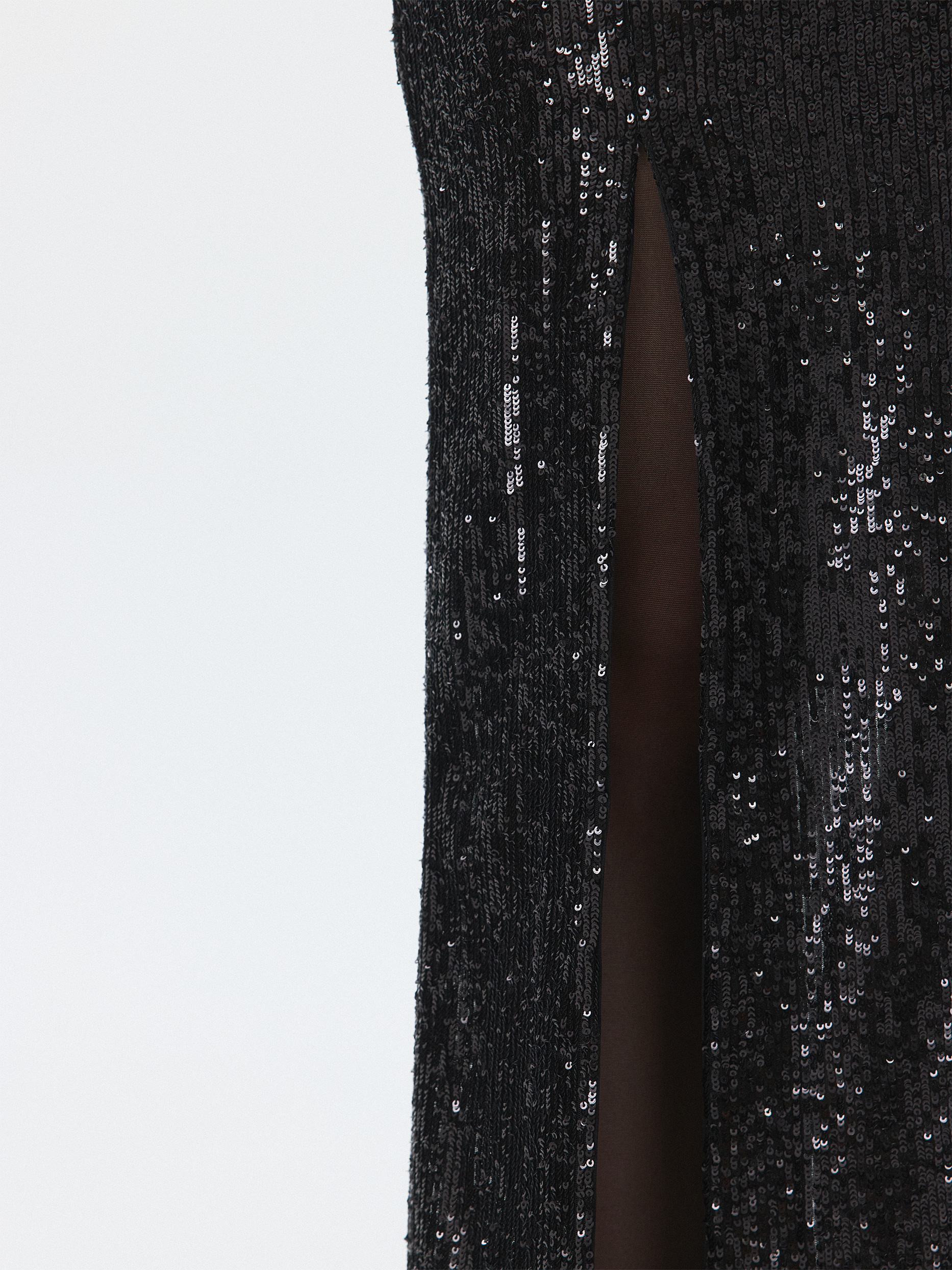 Эффектная юбка с разрезом — воплощение роскоши и блеска для торжественных мероприятий и для праздничных вечеров. Эластичная сетка, усыпанная пайетками, слегка тянется и не сковывает движения, а благодаря капроновой подкладке комфортно прилегает к телу. Драпировки создают фактуру и трендовый акцент.