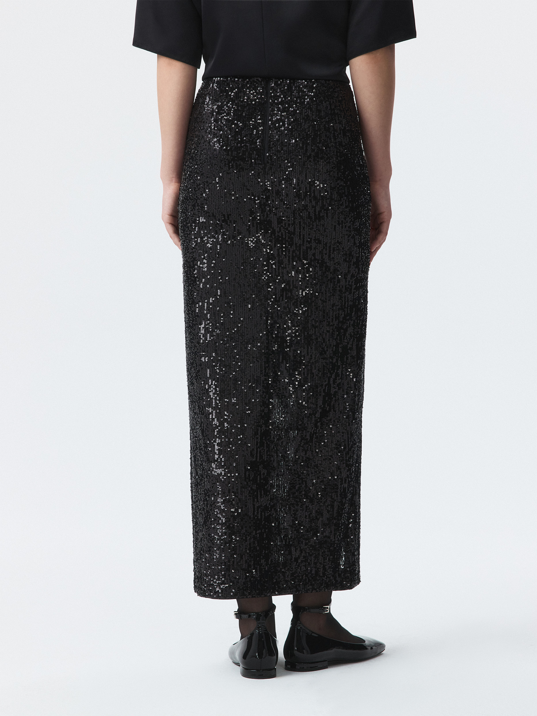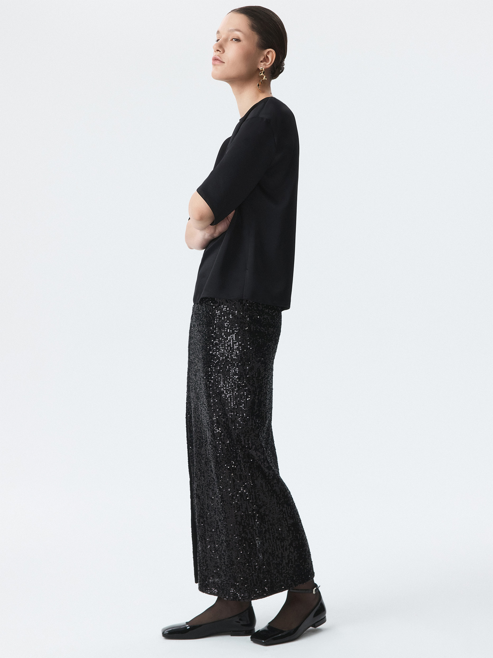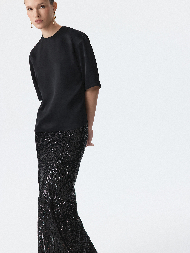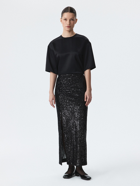 Эффектная юбка с разрезом — воплощение роскоши и блеска для торжественных мероприятий и для праздничных вечеров. Эластичная сетка, усыпанная пайетками, слегка тянется и не сковывает движения, а благодаря капроновой подкладке комфортно прилегает к телу. Драпировки создают фактуру и трендовый акцент.