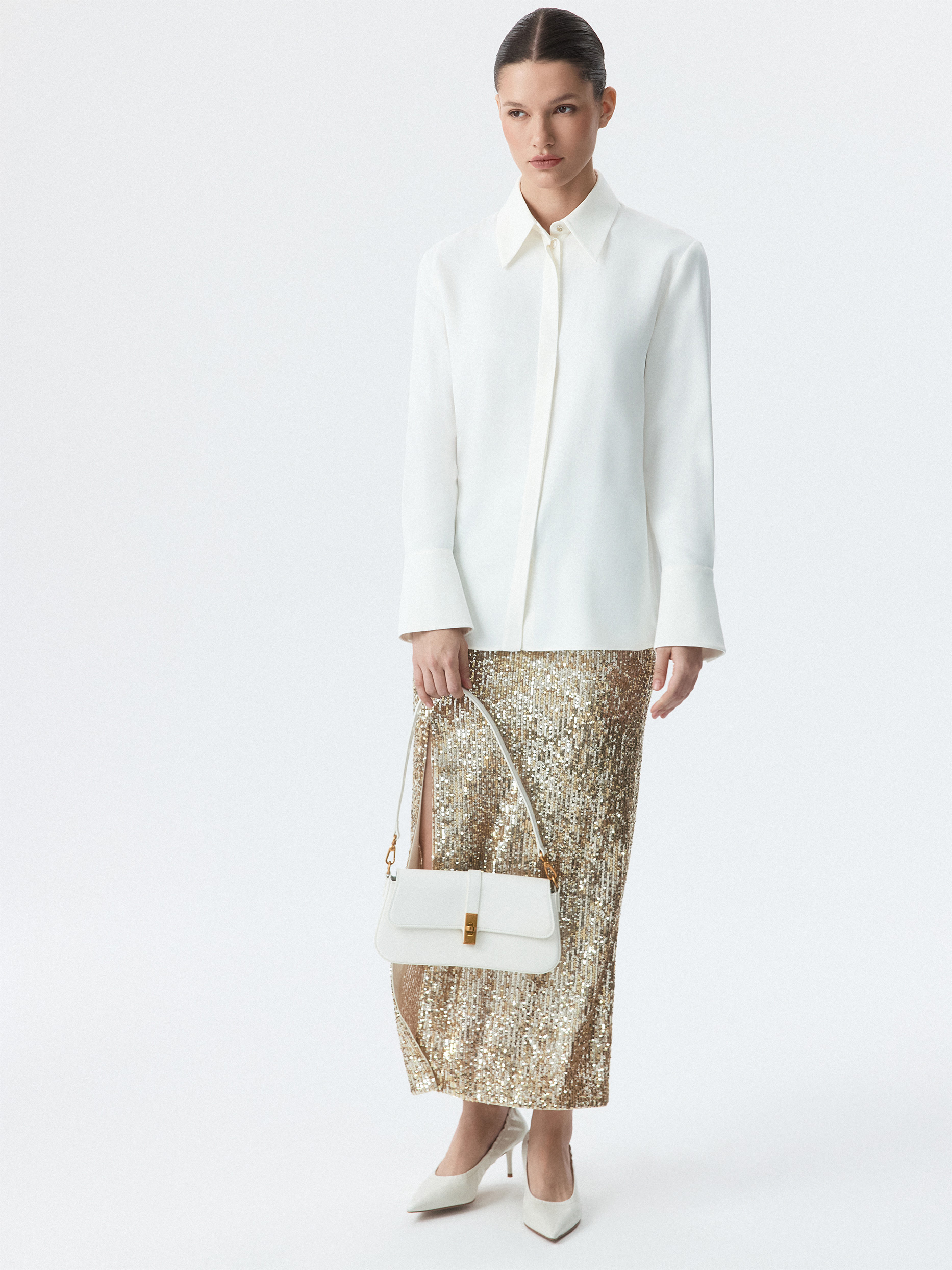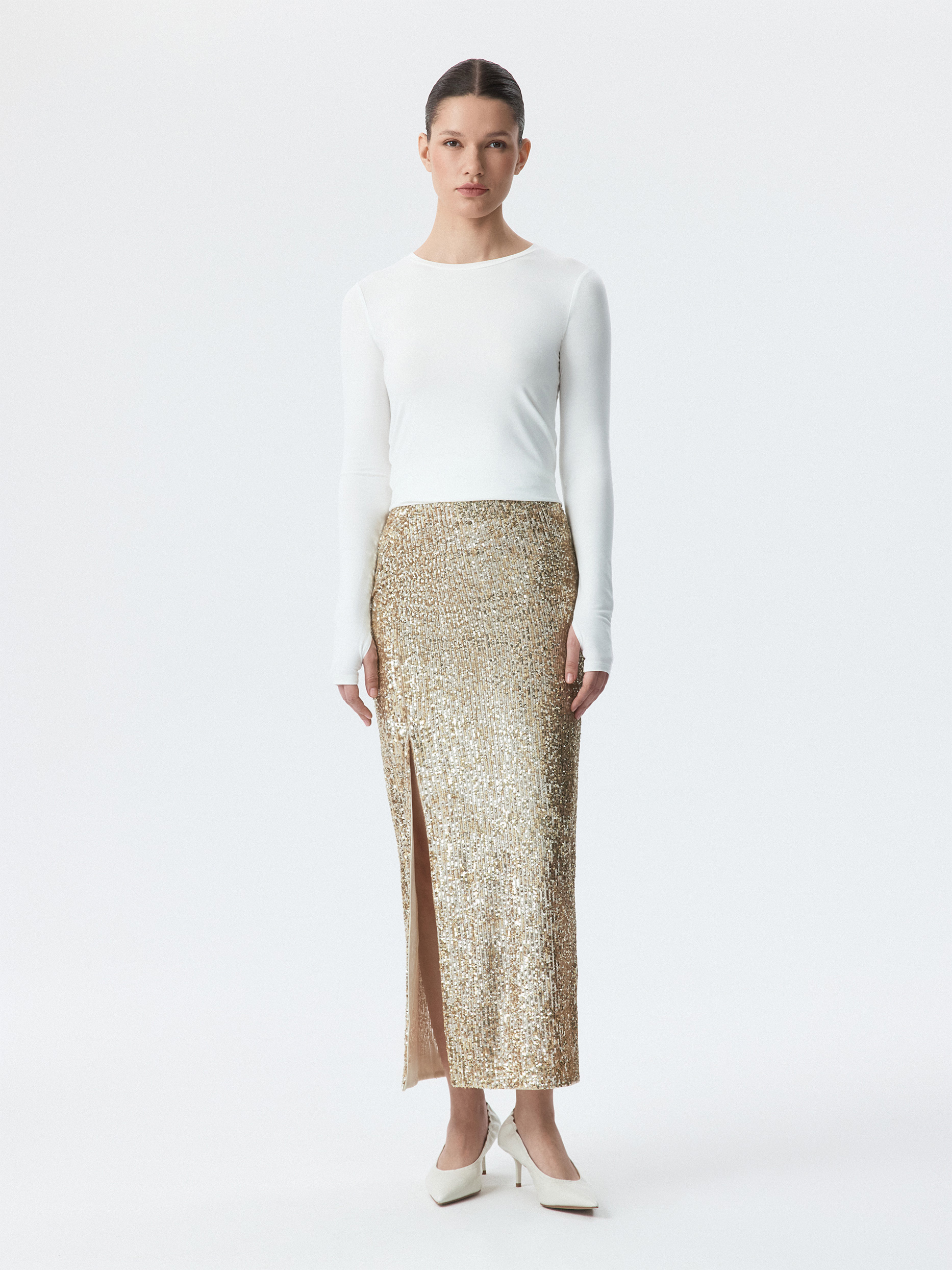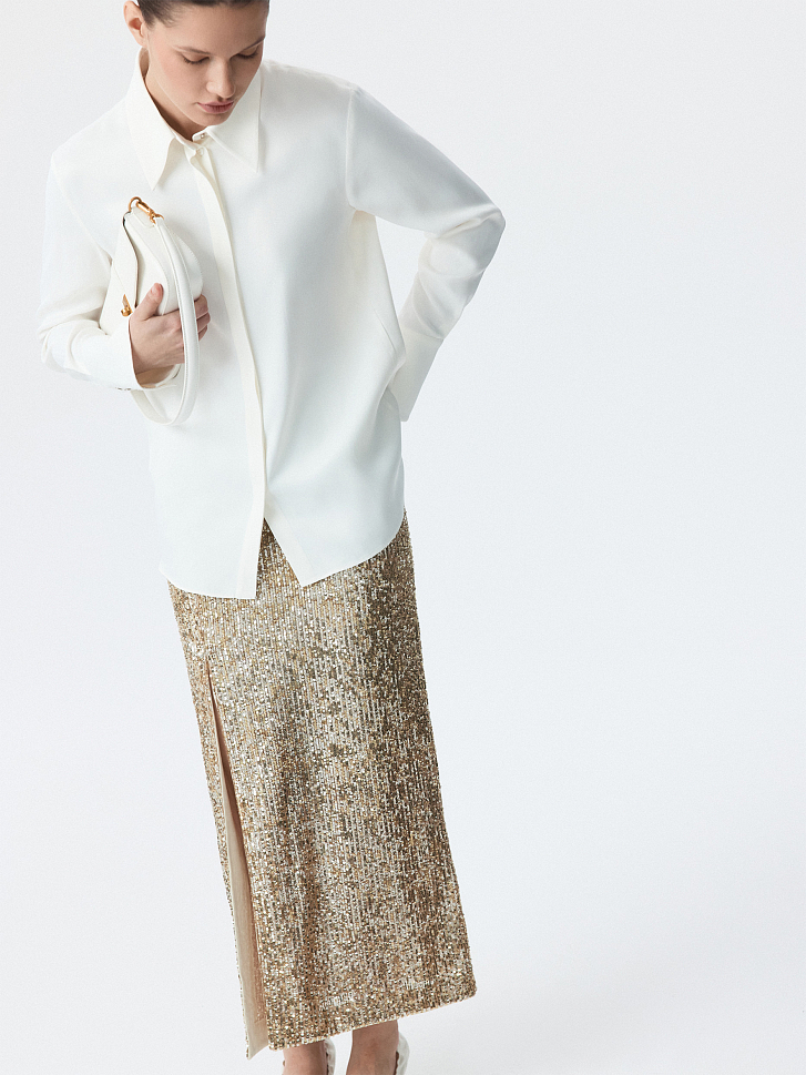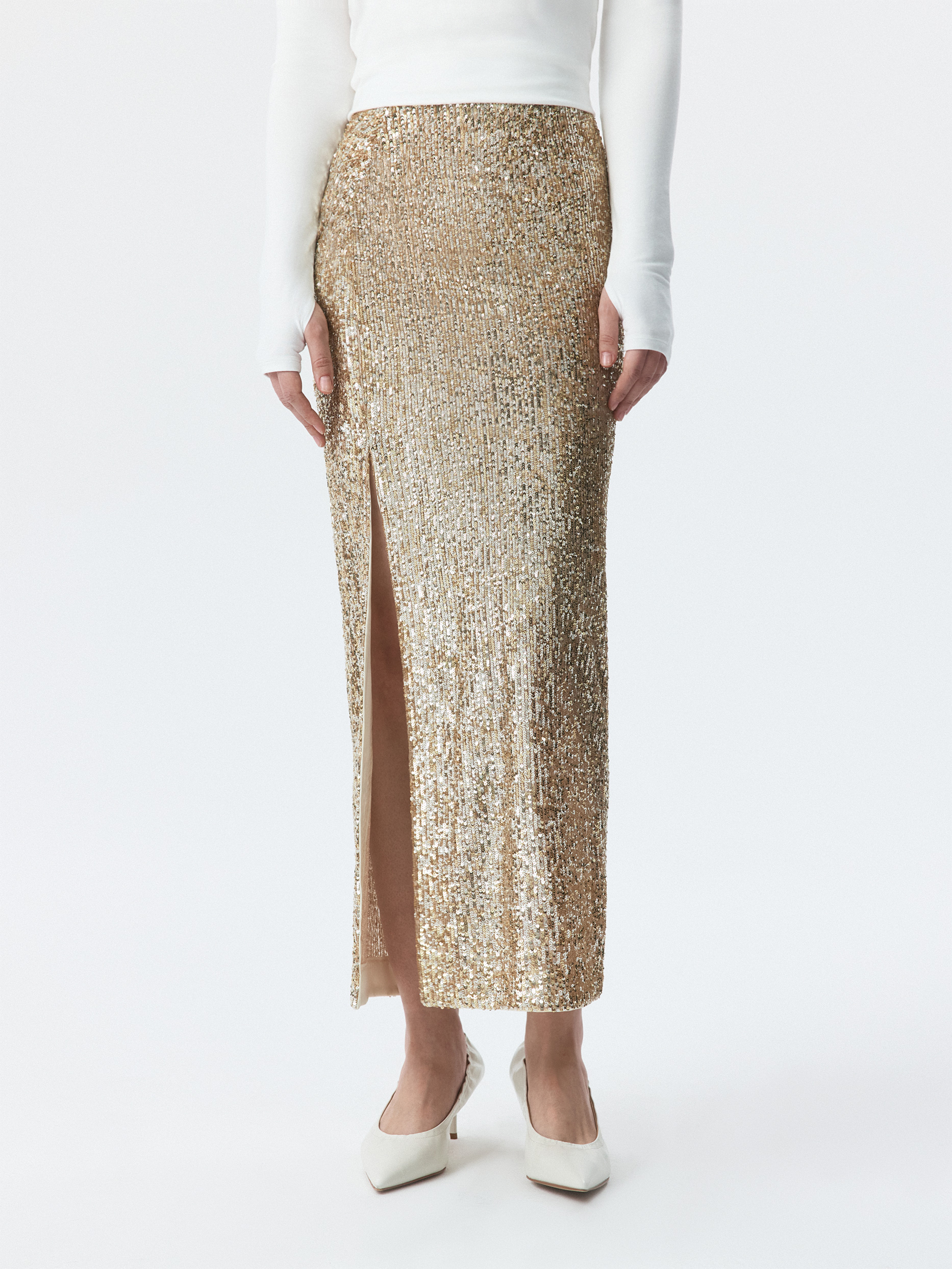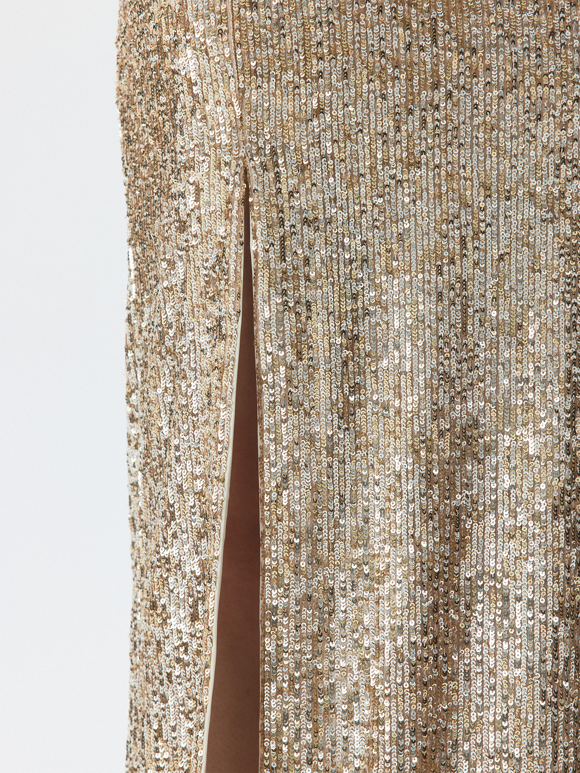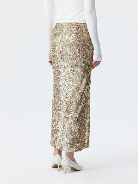 Эффектная юбка с разрезом — воплощение роскоши и блеска для торжественных мероприятий и для праздничных вечеров. Эластичная сетка, усыпанная пайетками, слегка тянется и не сковывает движения, а благодаря капроновой подкладке комфортно прилегает к телу. Драпировки создают фактуру и трендовый акцент.