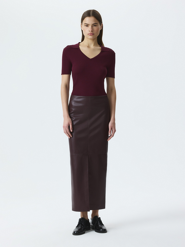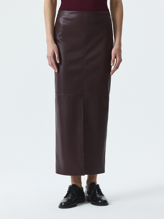 Кожаная юбка не теряет своей актуальности уже который сезон. Модель из мягкой искусственной кожи обладает пластичностью и комфортно сидит по фигуре благодаря гладкой подкладке. Чтобы длинная юбка не сковывала шаг, сзади предусмотрели разрез.