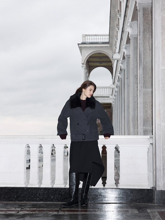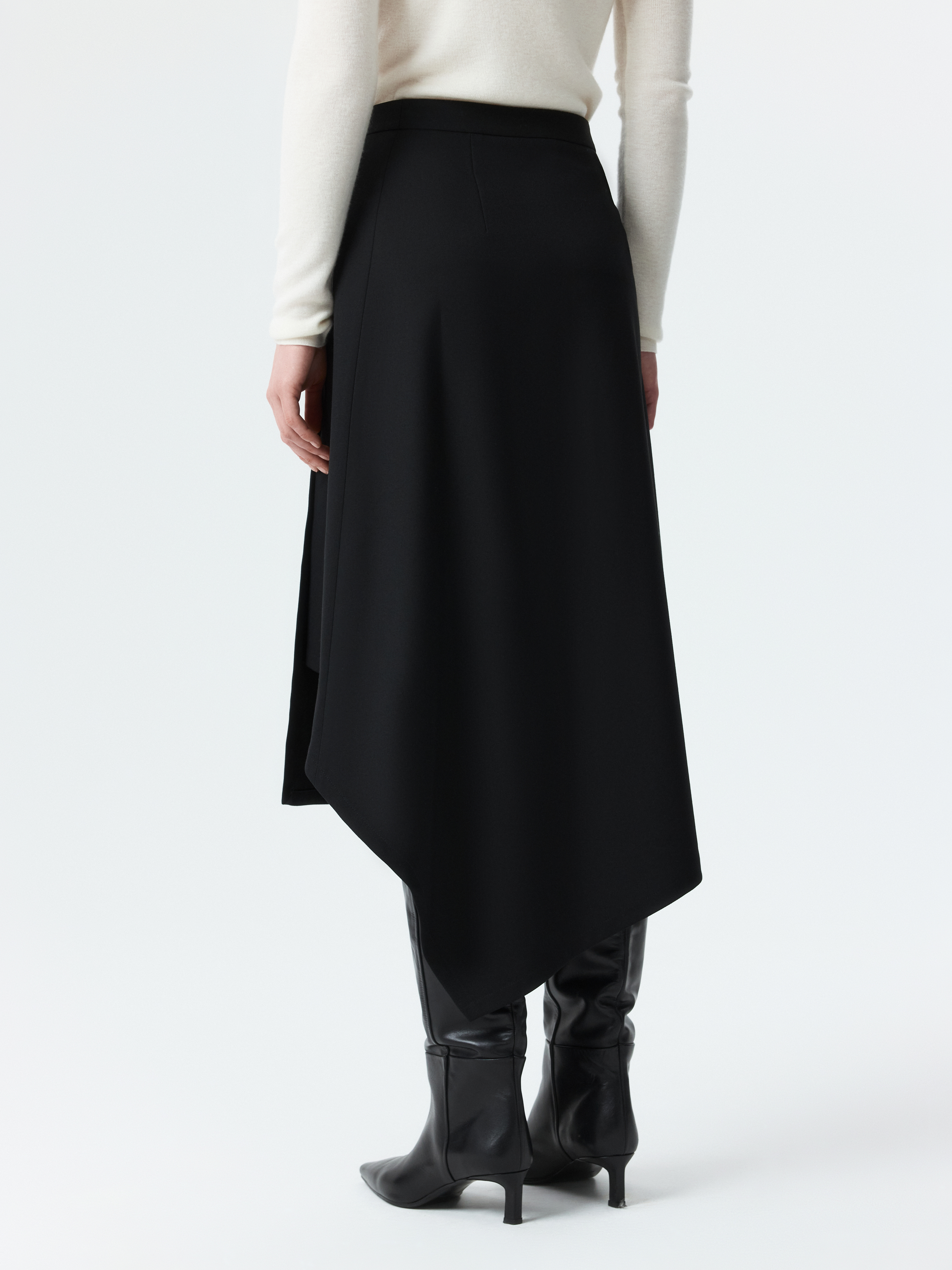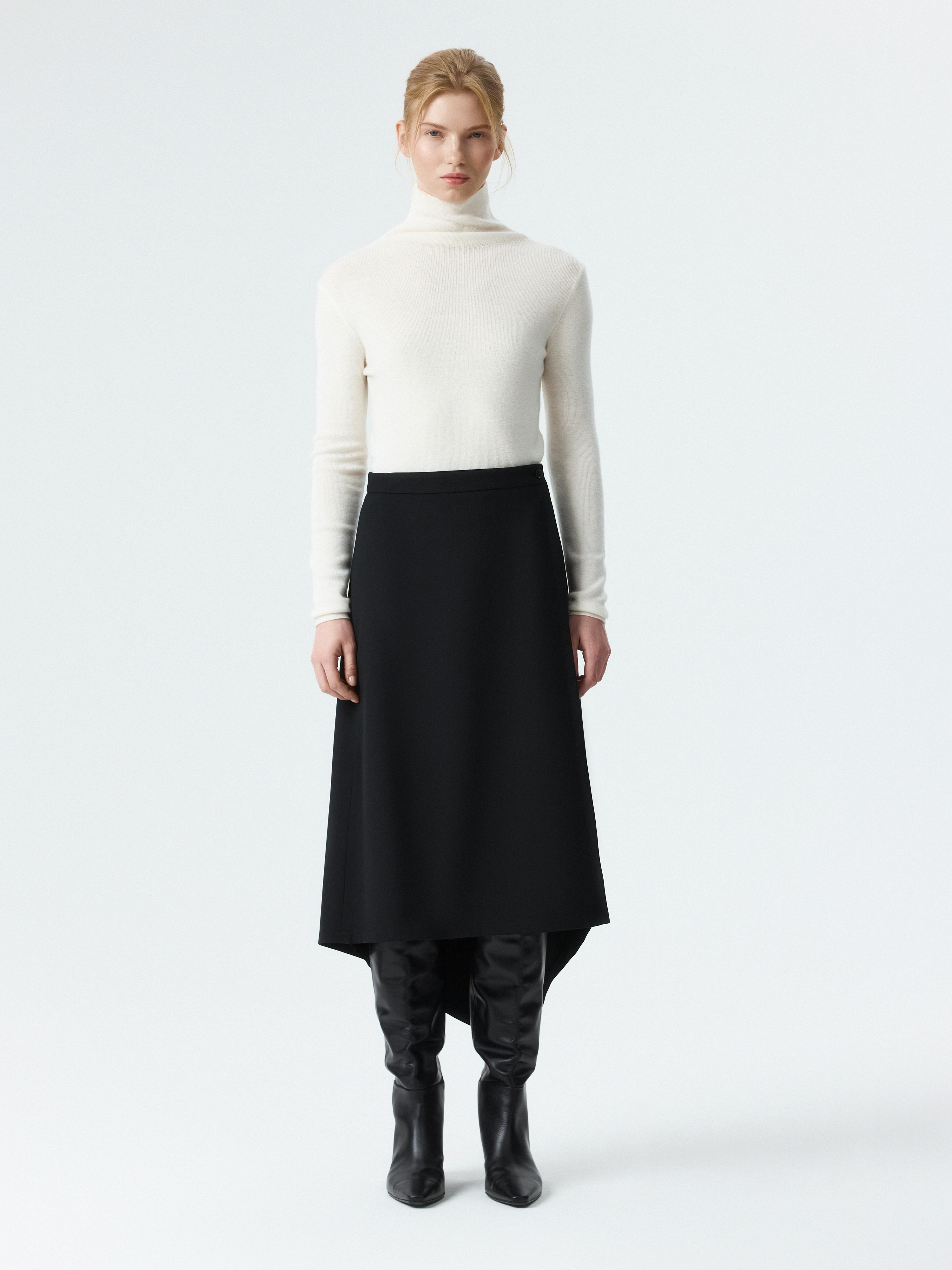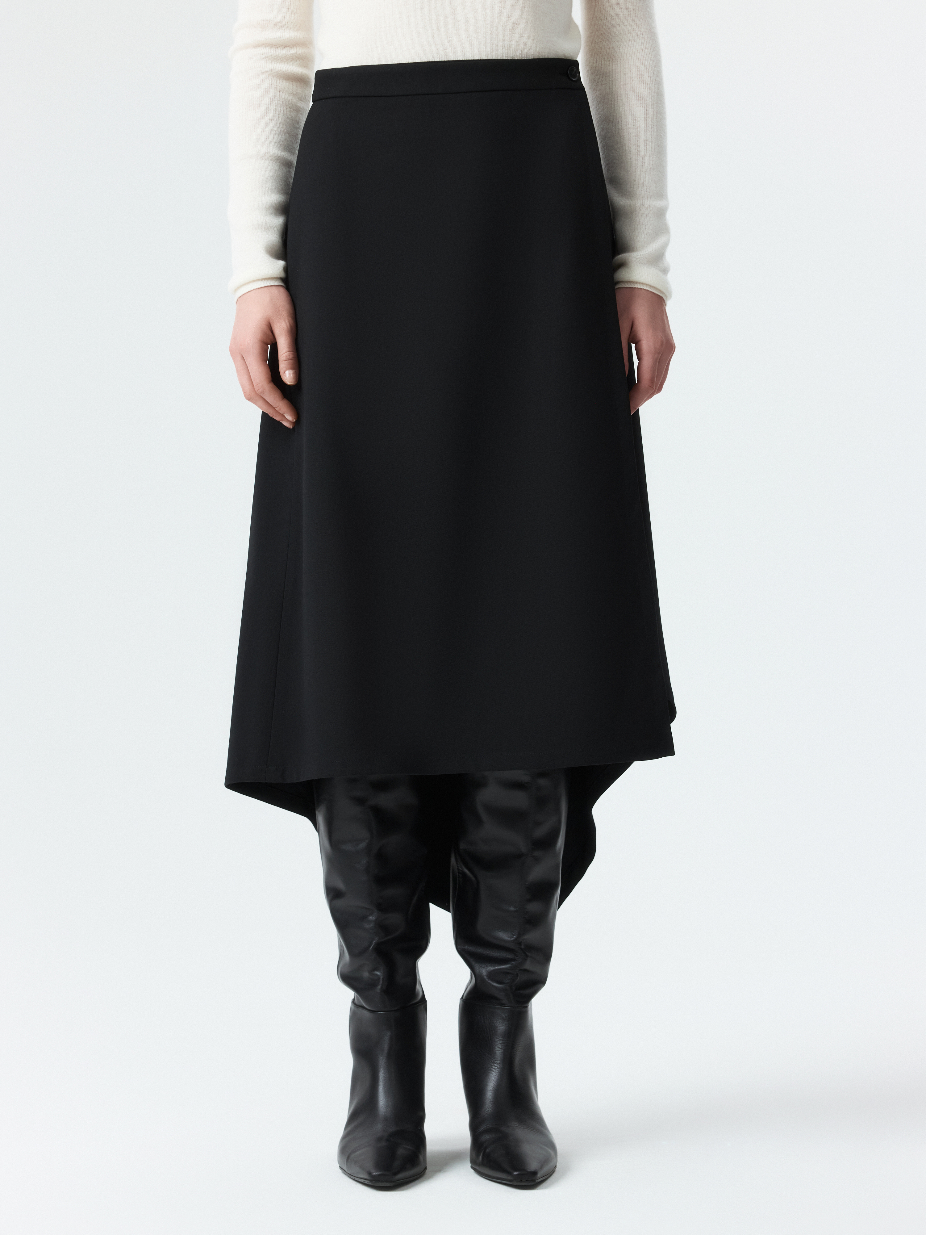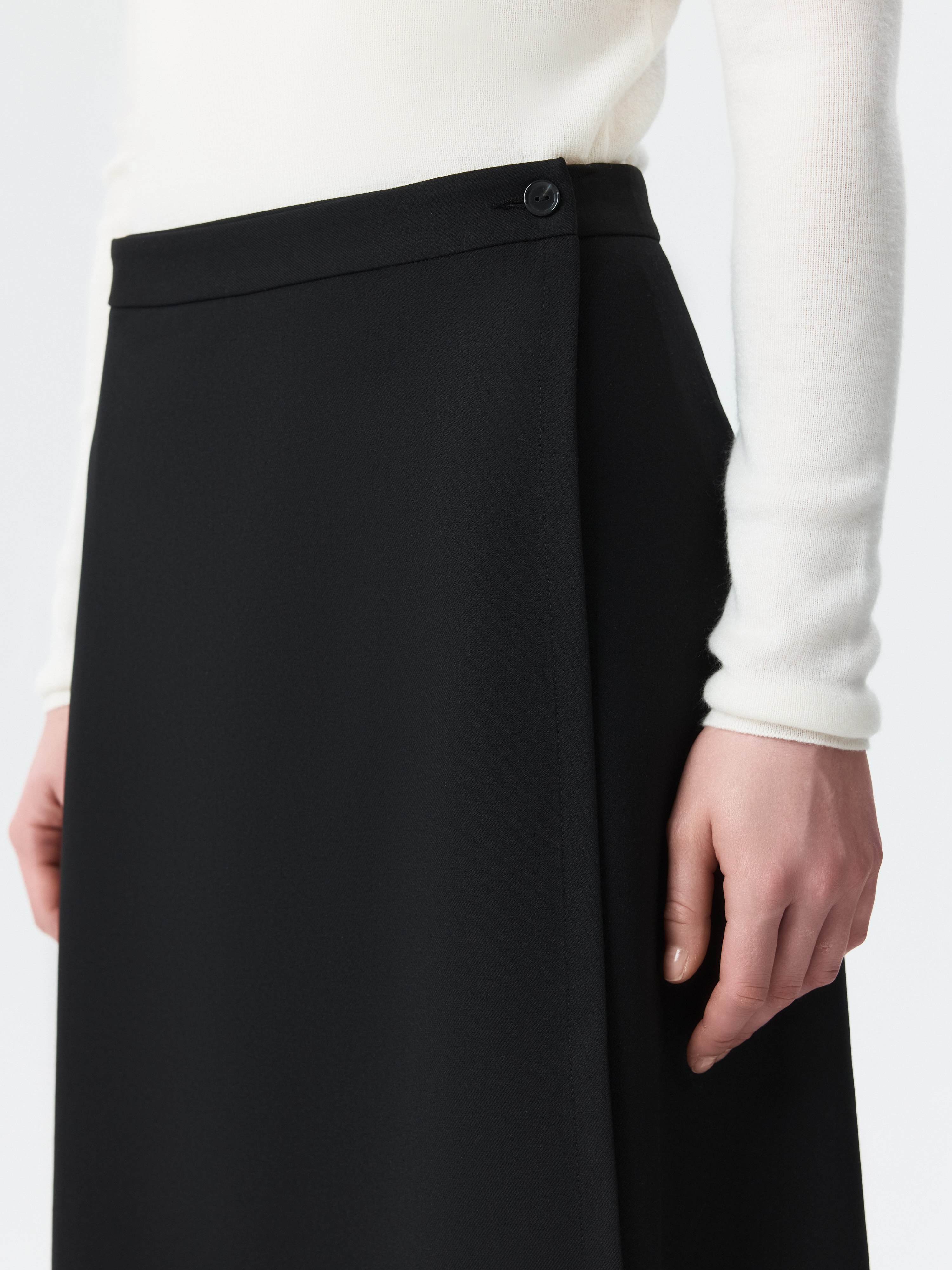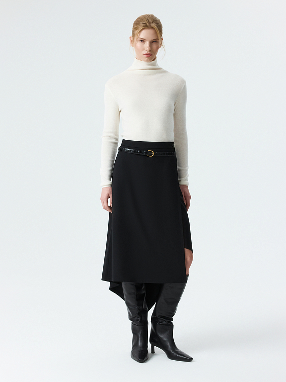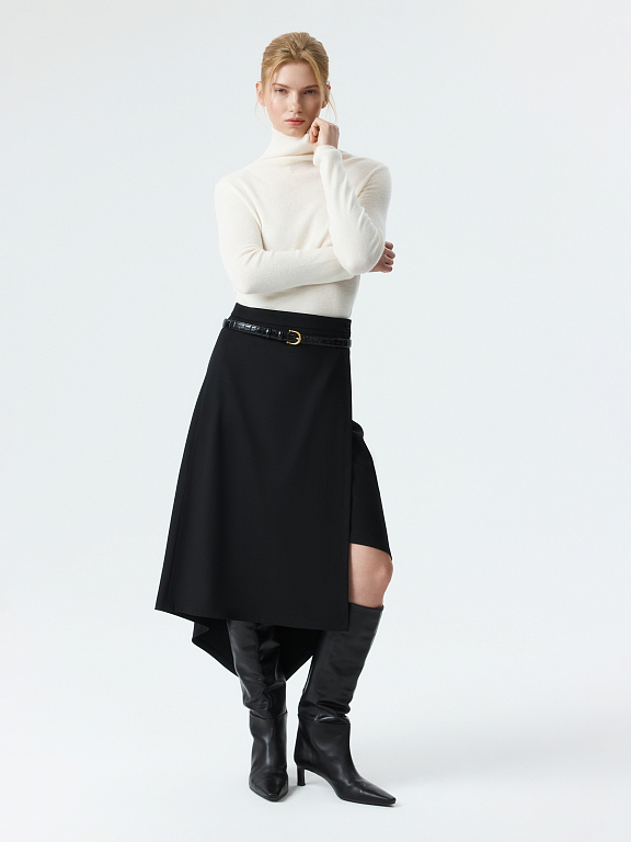 Юбка на запах с асимметричным низом составит комфортный и уместный в офисе образ, при этом – расслабленный и женственный. В меру плотный костюмный текстиль с содержанием натуральной шерсти легко драпируется в складки и мягко прилегает.