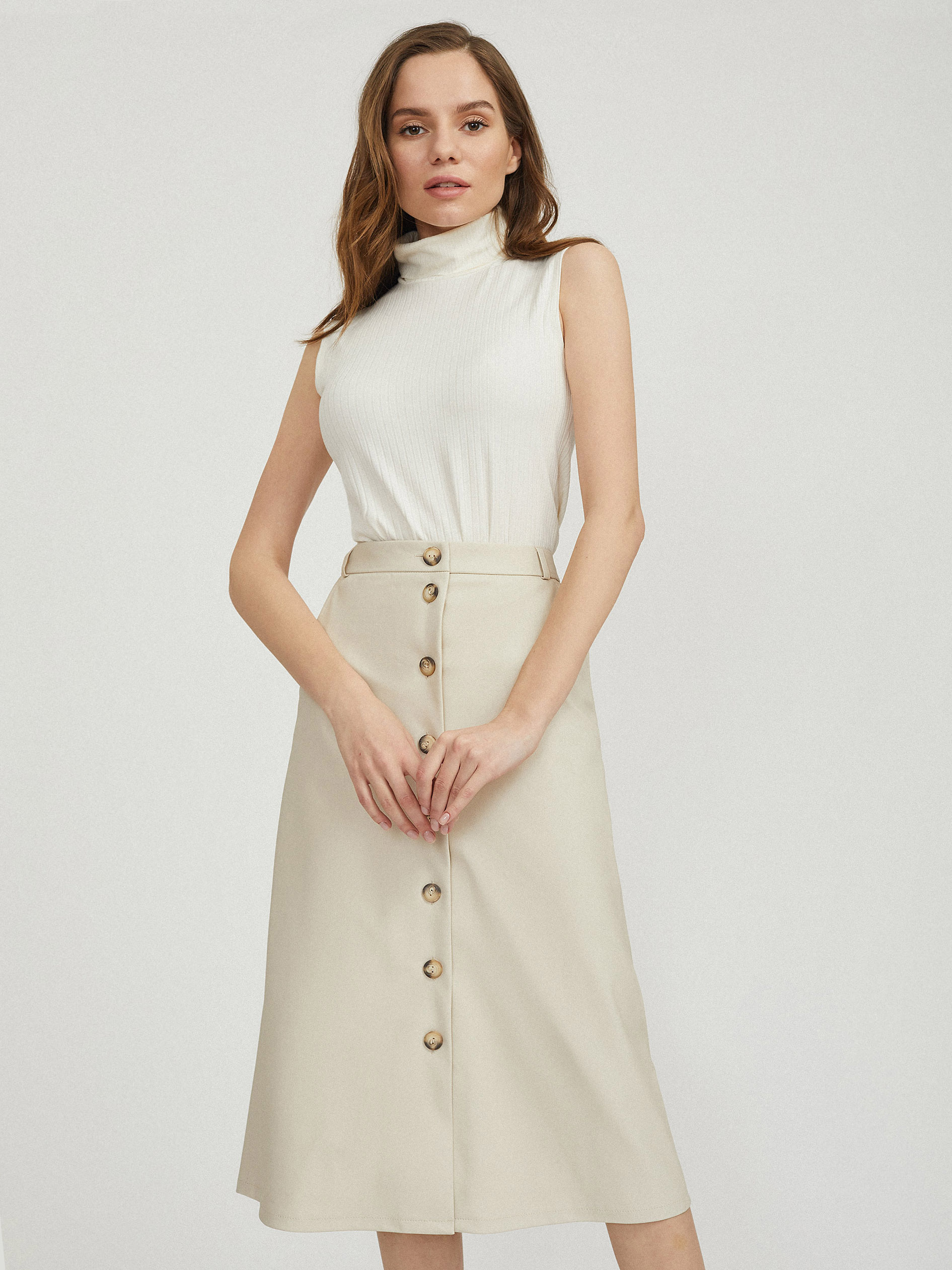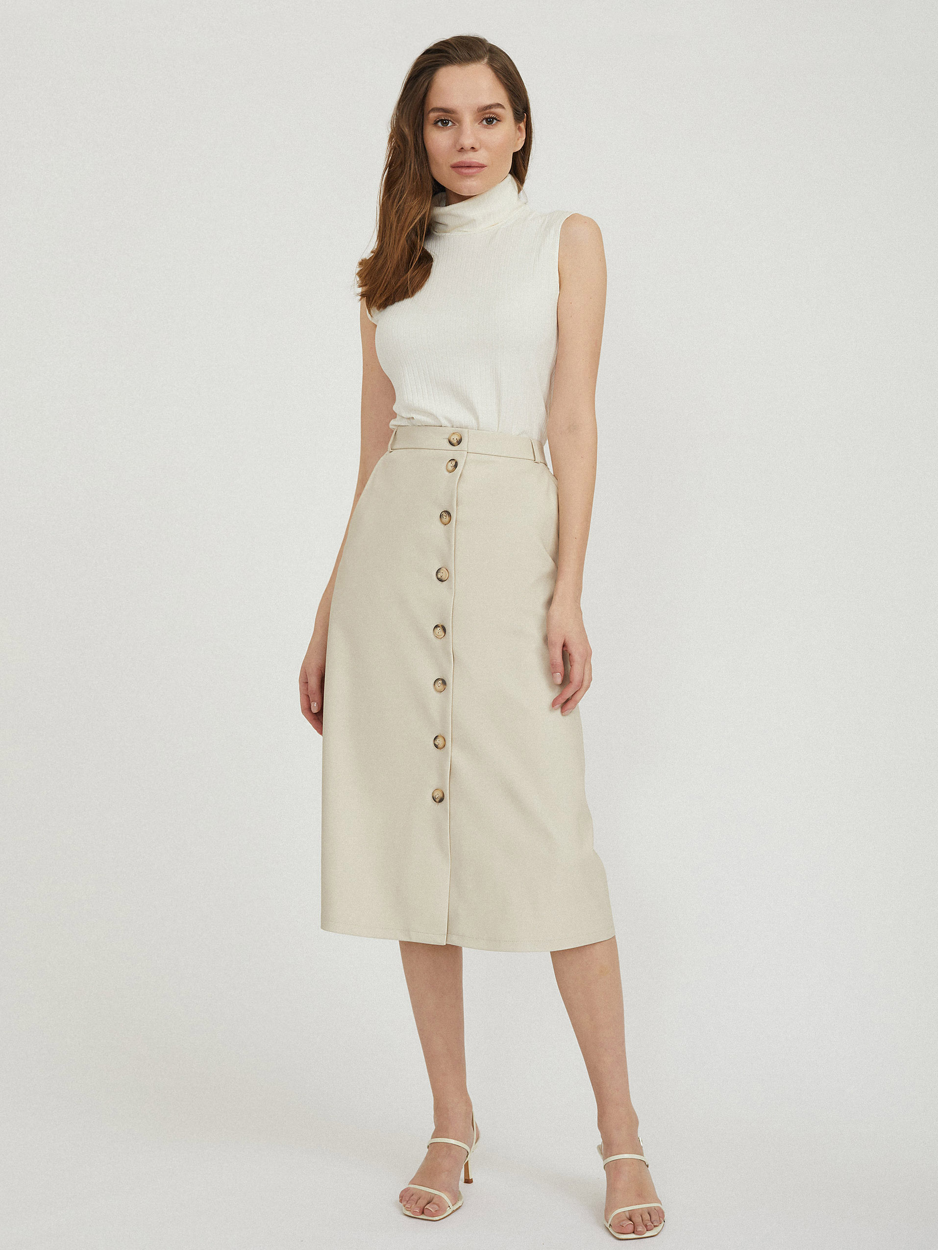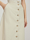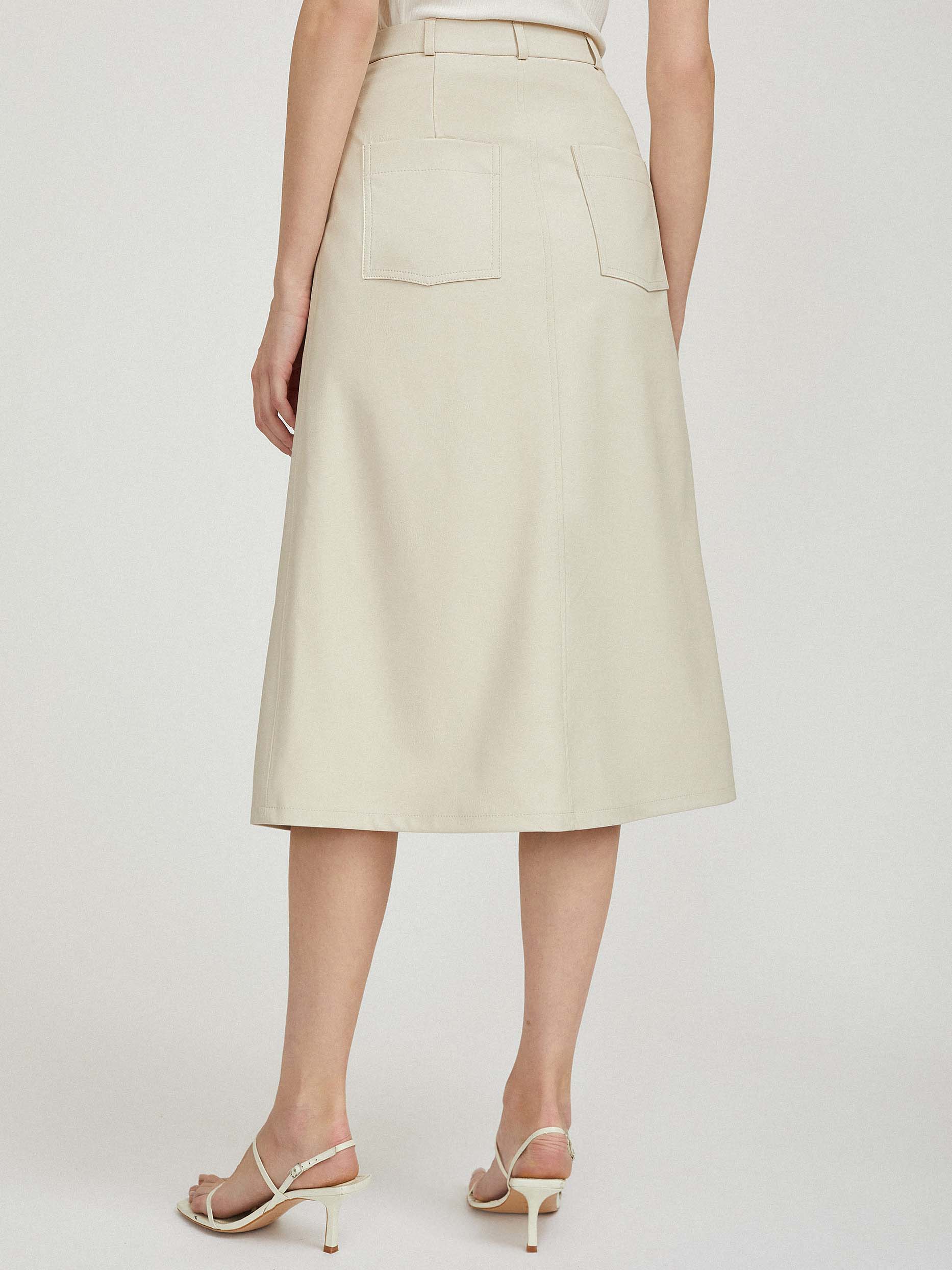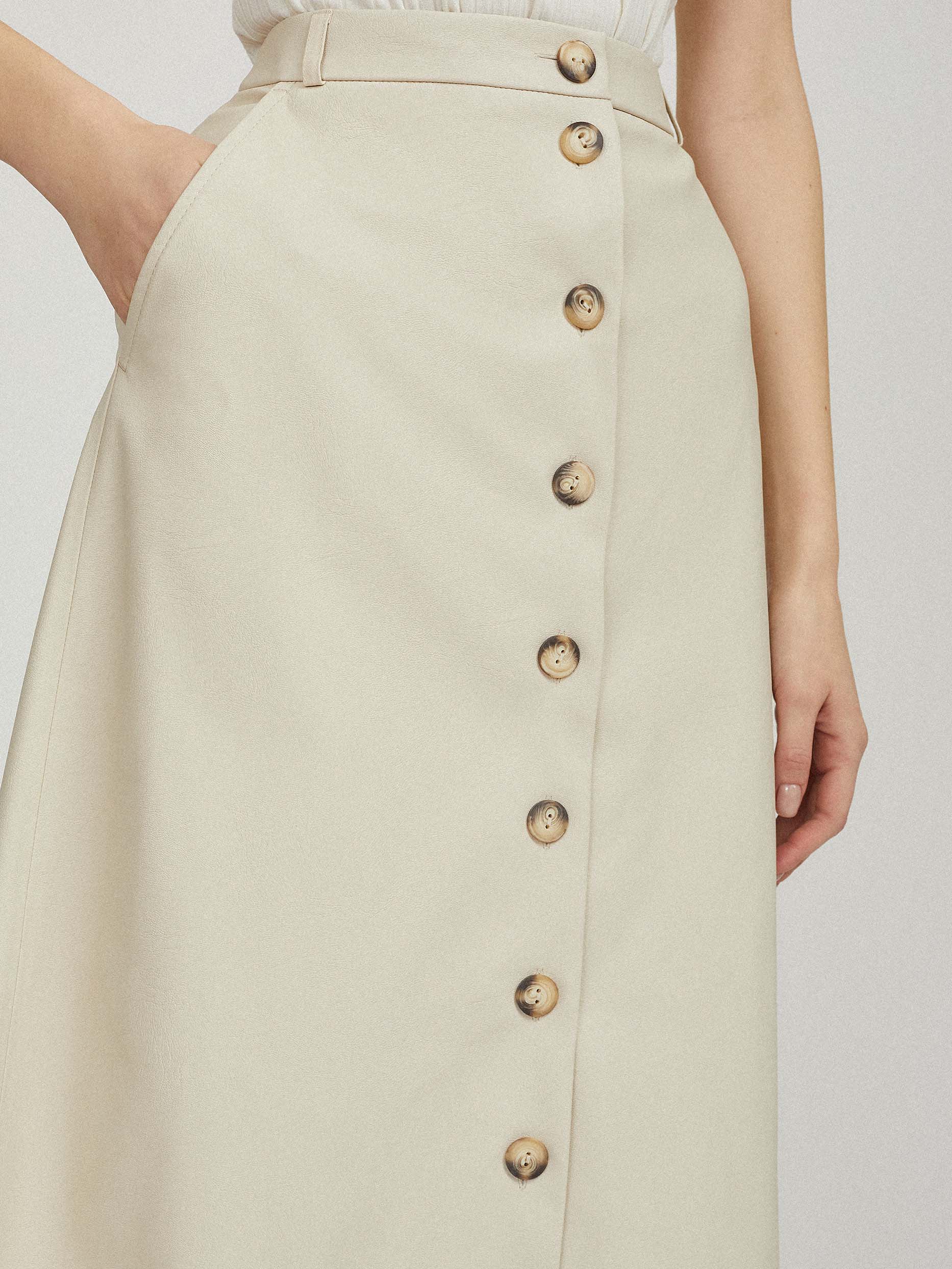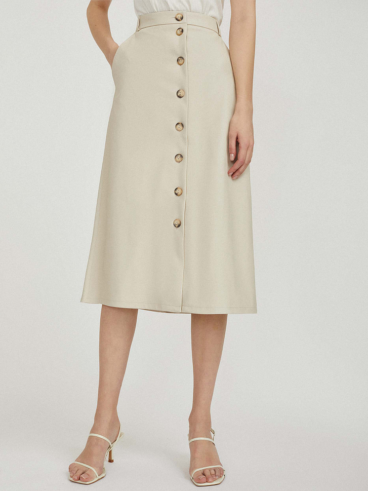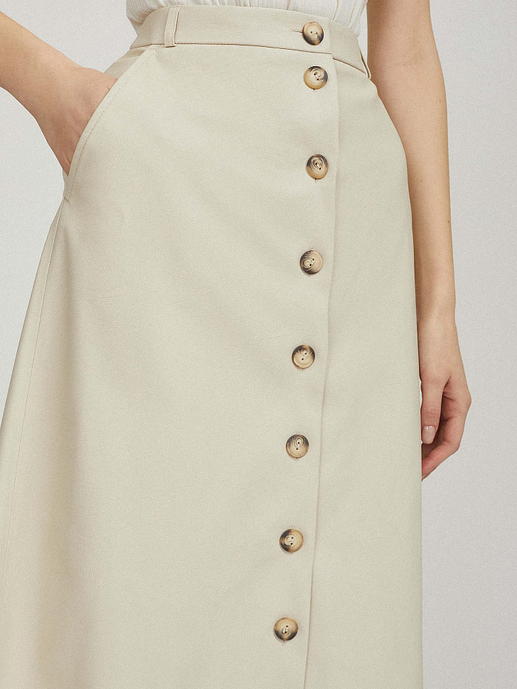 Однотонная юбка А-силуэта, выполненная из искусственной кожи. Высокая посадка, боковые карманы, накладные карманы сзади, подкладка. Застегивается на ряд пуговиц.