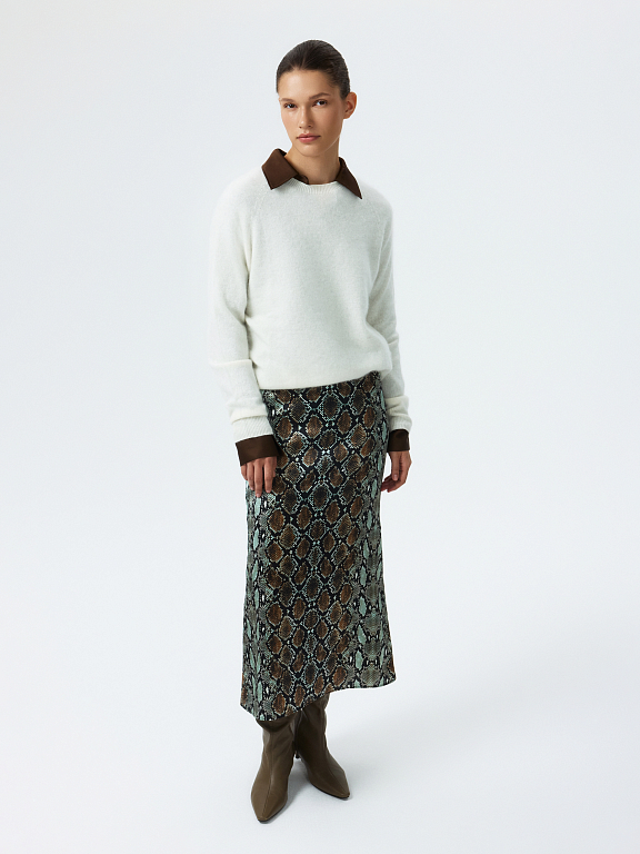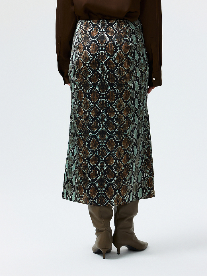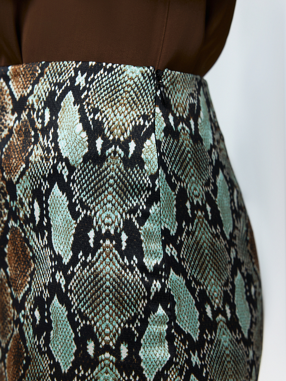 Змеиный принт станет эффектной альтернативой леопардовому узору. Гладкий атласный текстиль приятно струится вдоль тела и не просвечивает даже без подкладки. Юбка прекрасно дополнит как блузу из аналогичного материала, так и гармонично будет смотреться с базовыми рубашками.