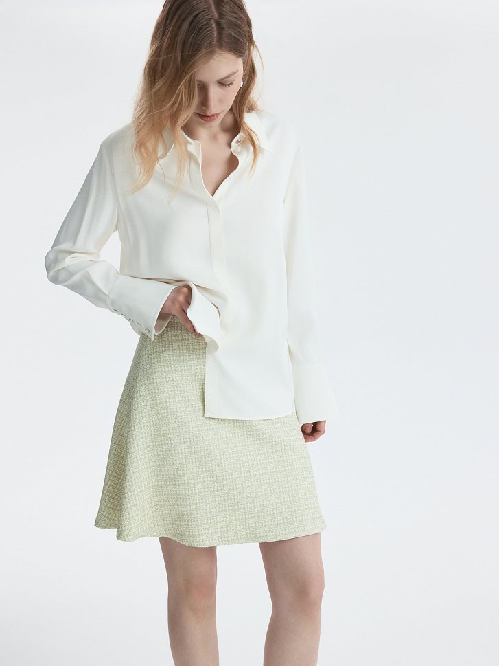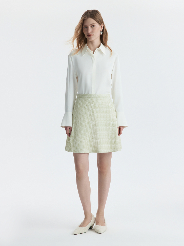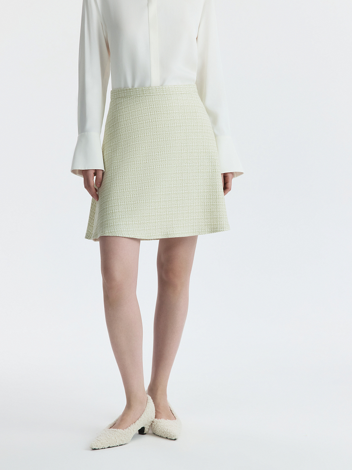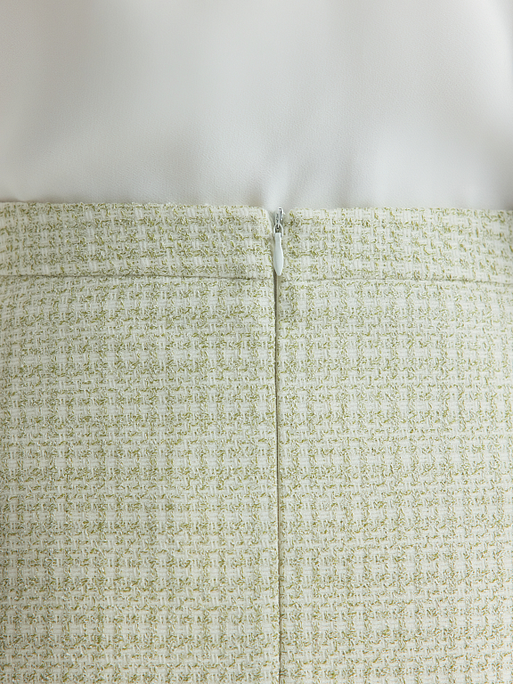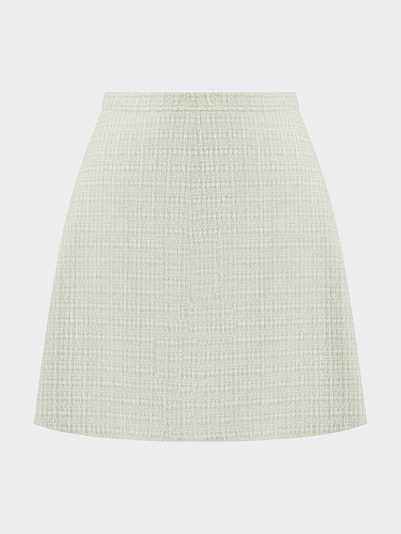 Расклешенная мини-юбка из фактурного материала освежит повседневные образы. В меру плотный твидовый текстиль не тянется и не мнется, а гладкая подкладка дарит комфортное прилегание. Сочетайте модель с парным жилетом или базовым трикотажем.