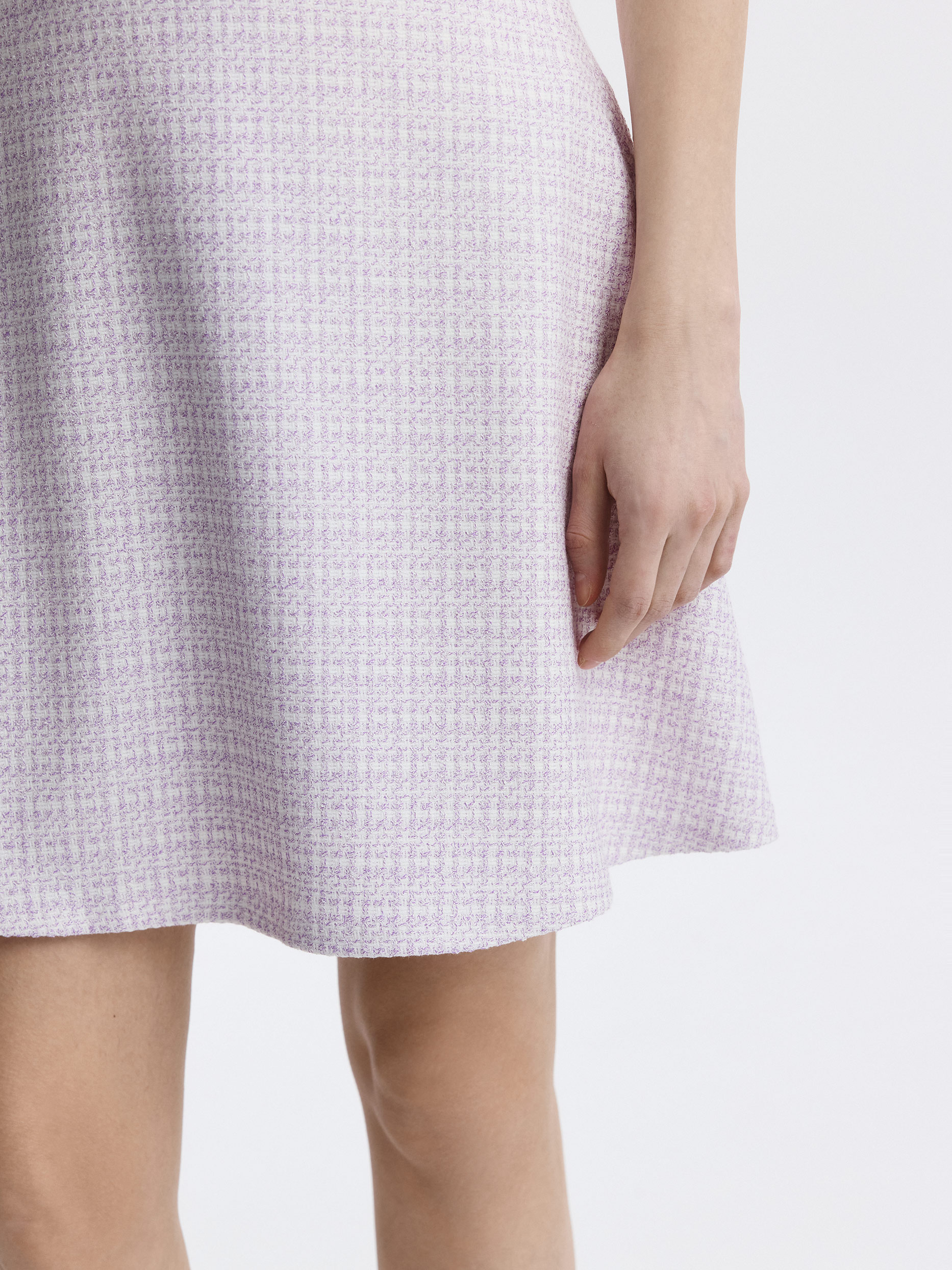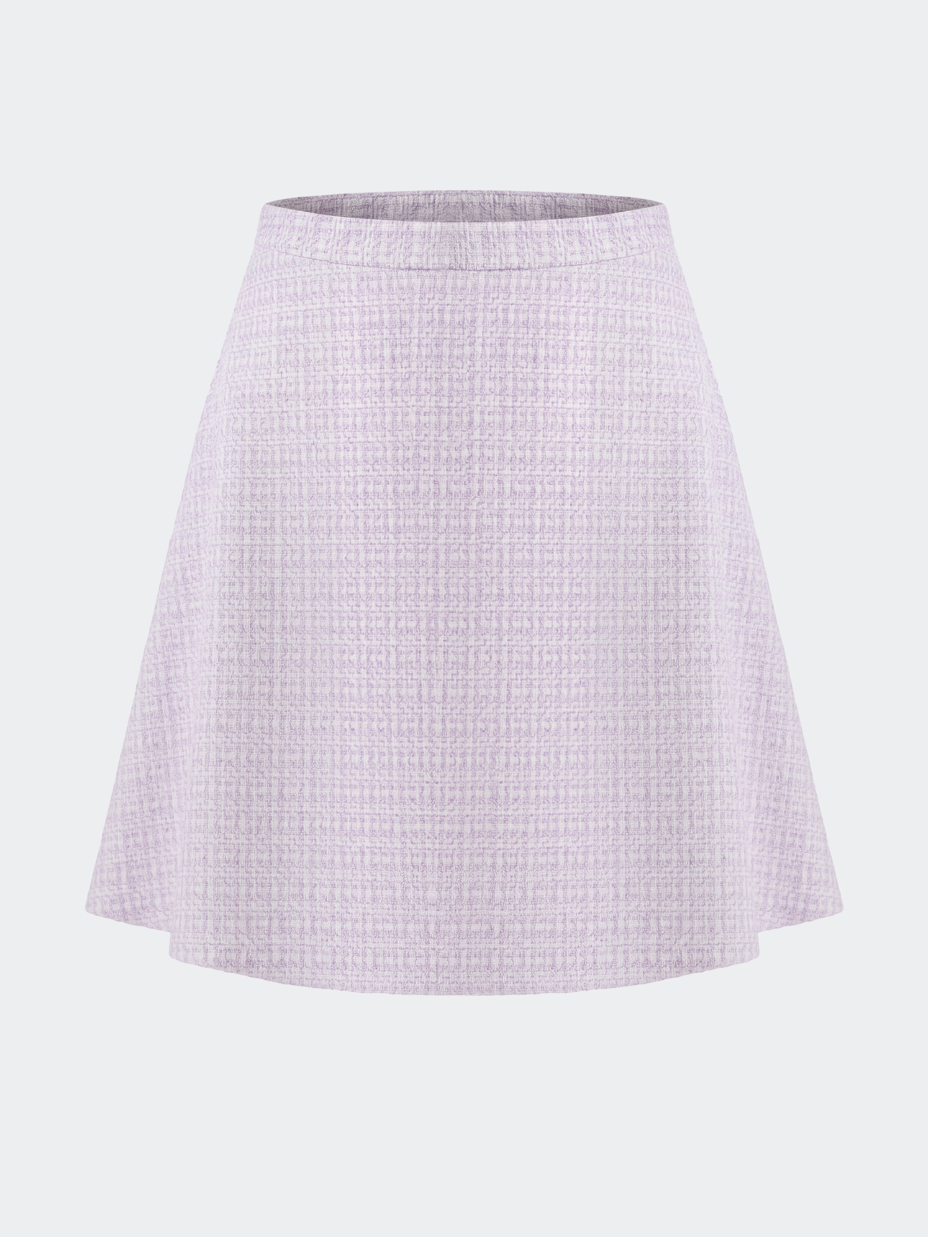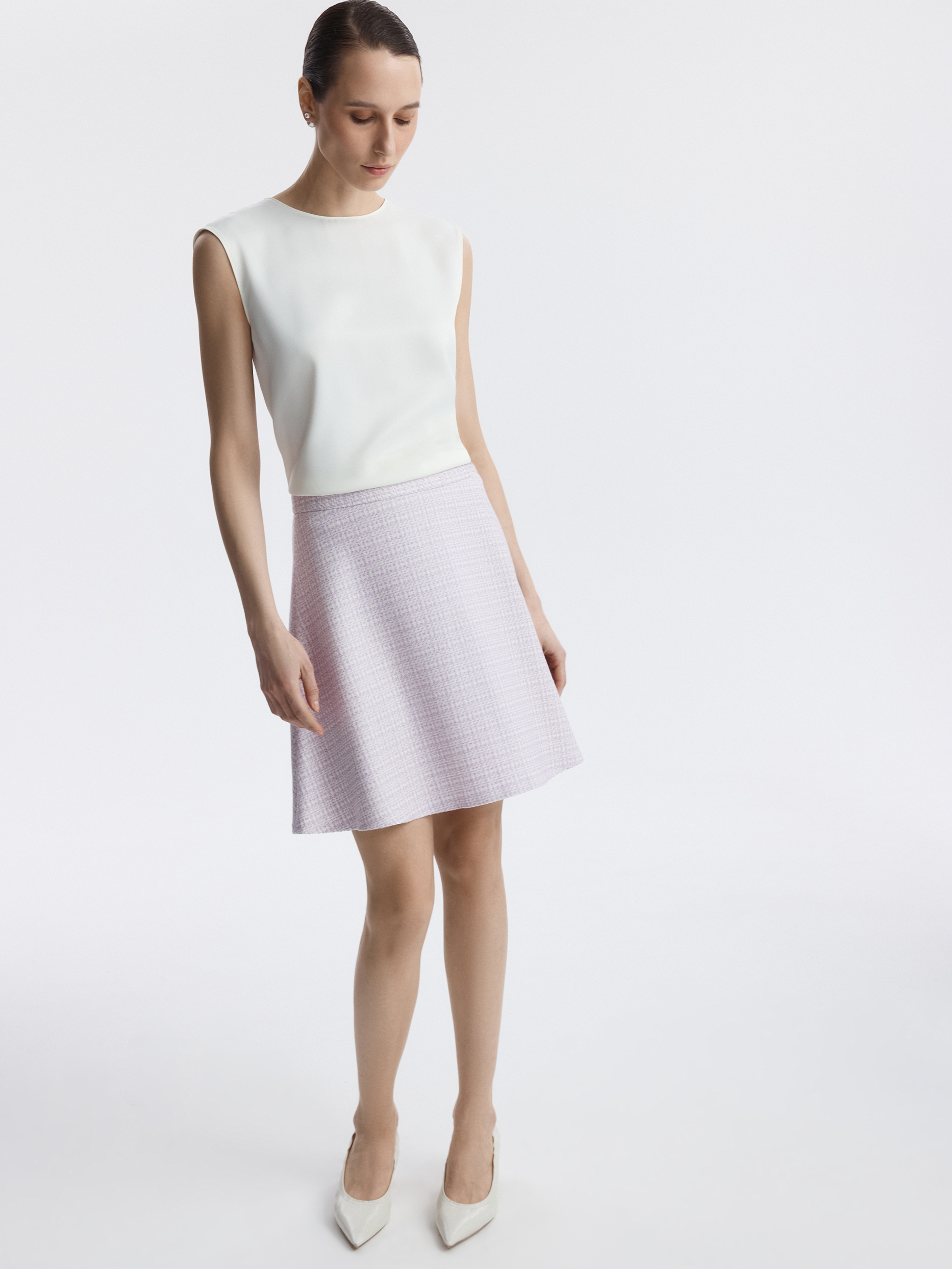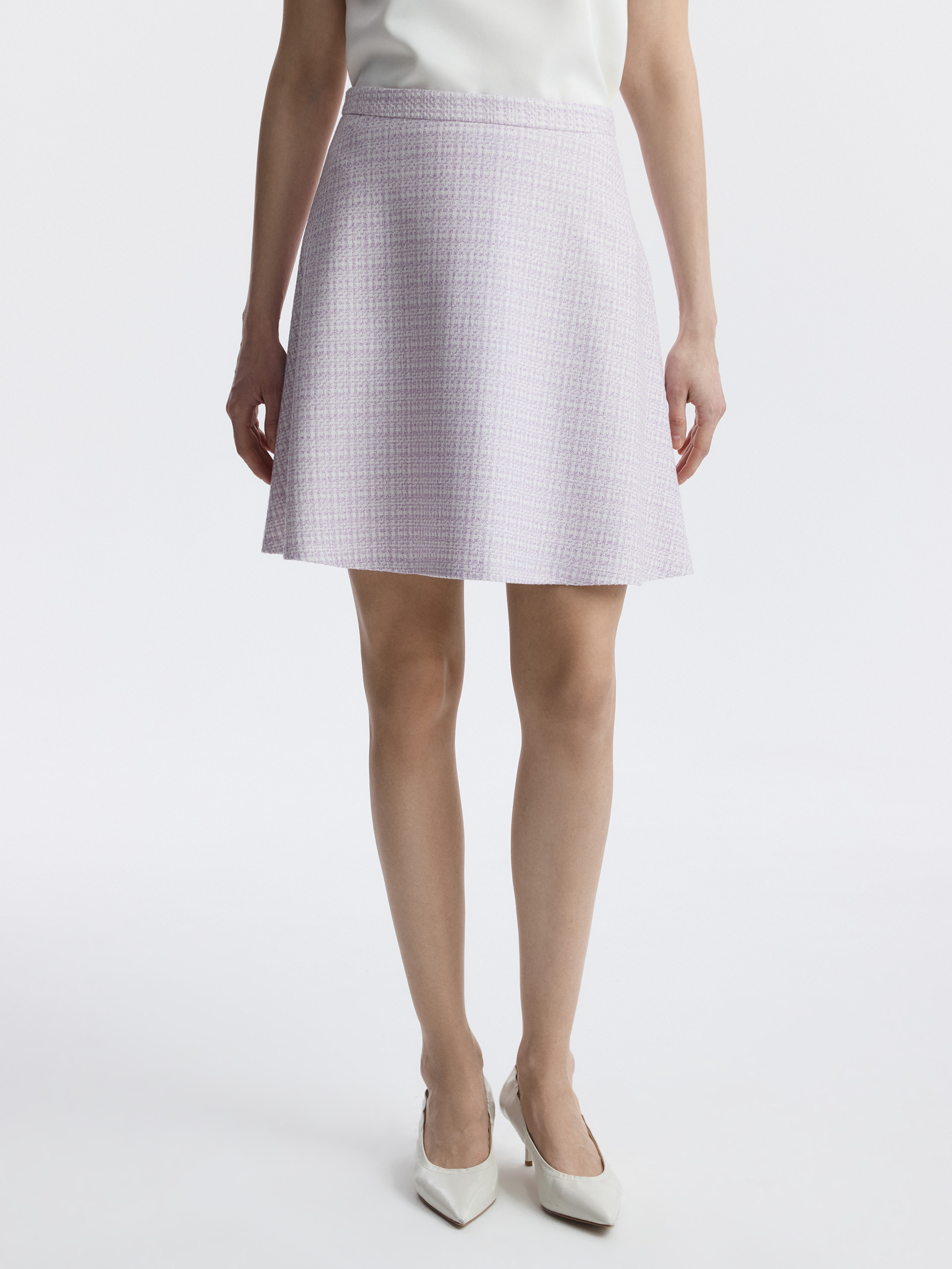 Расклешенная мини-юбка из фактурного материала освежит повседневные образы. В меру плотный твидовый текстиль не тянется и не мнется, а гладкая подкладка дарит комфортное прилегание. Сочетайте модель с парным жилетом или базовым трикотажем.