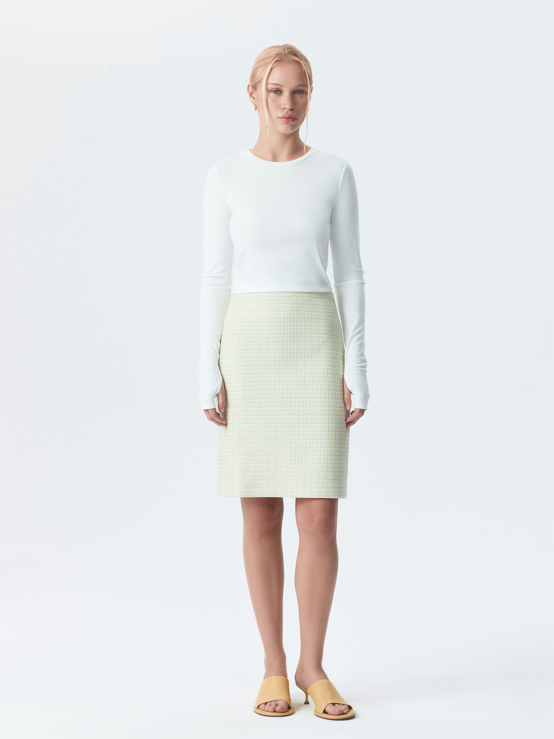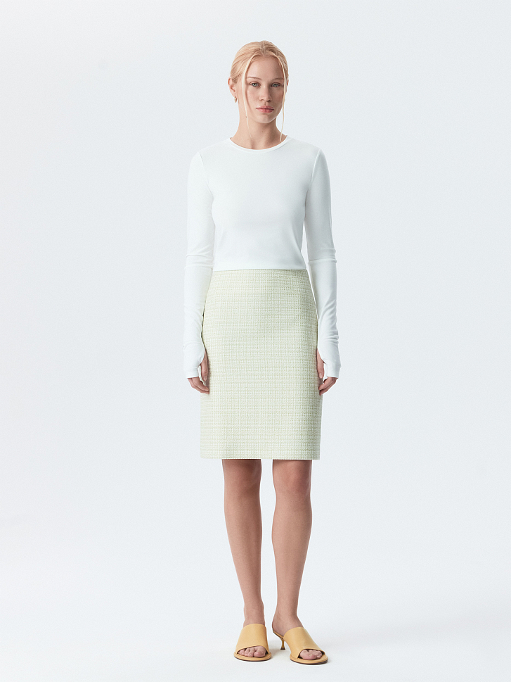 Прямая мини-юбка стала менее классической за счет материала. В меру плотный твидовый текстиль не тянется и не мнется, а гладкая подкладка дарит комфортное прилегание. Модель идеально дополнит костюм с парным жилетом или сочетайте с повседневным трикотажем.