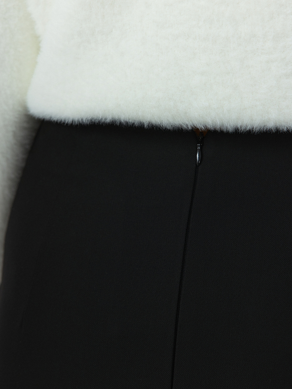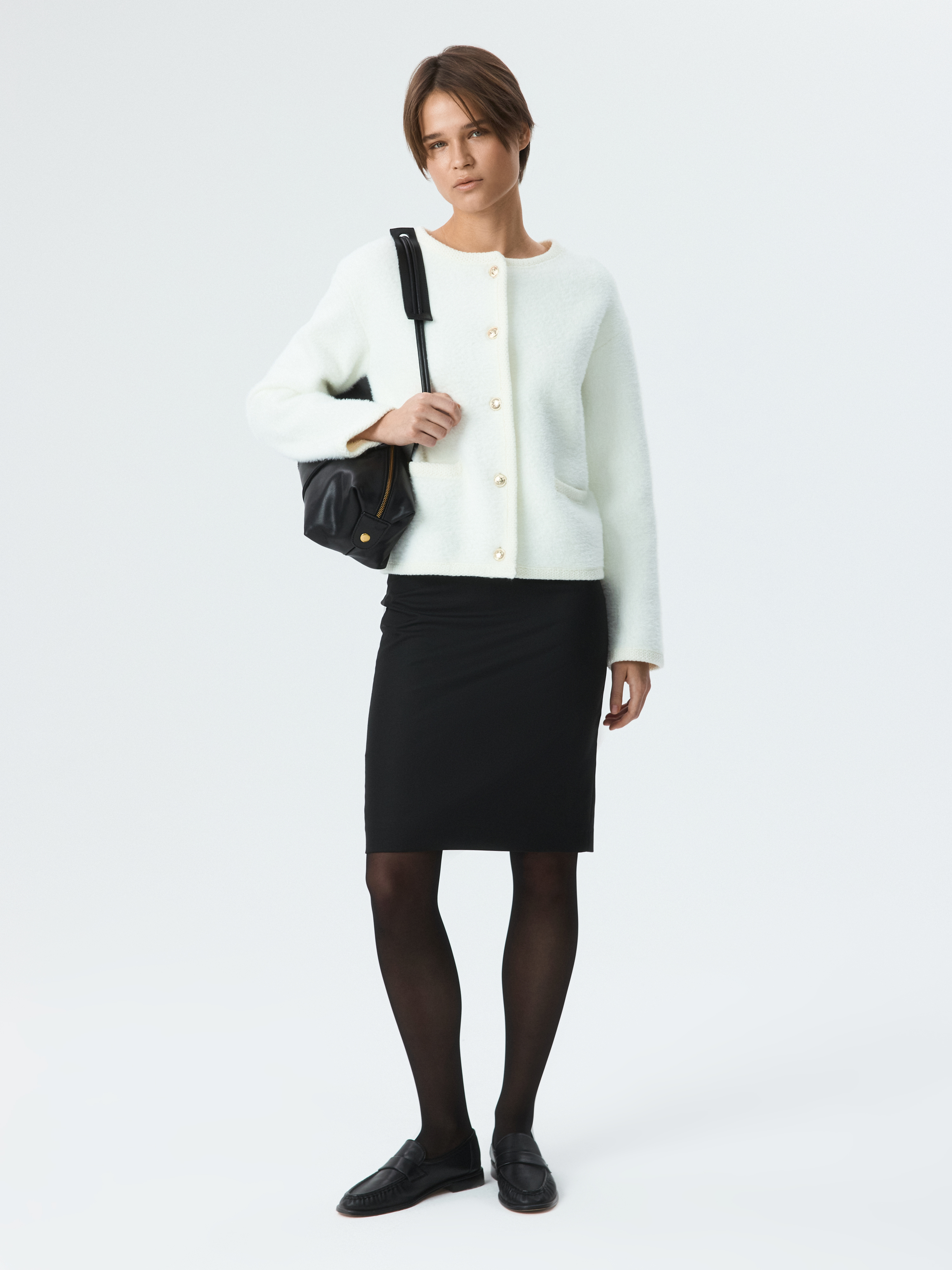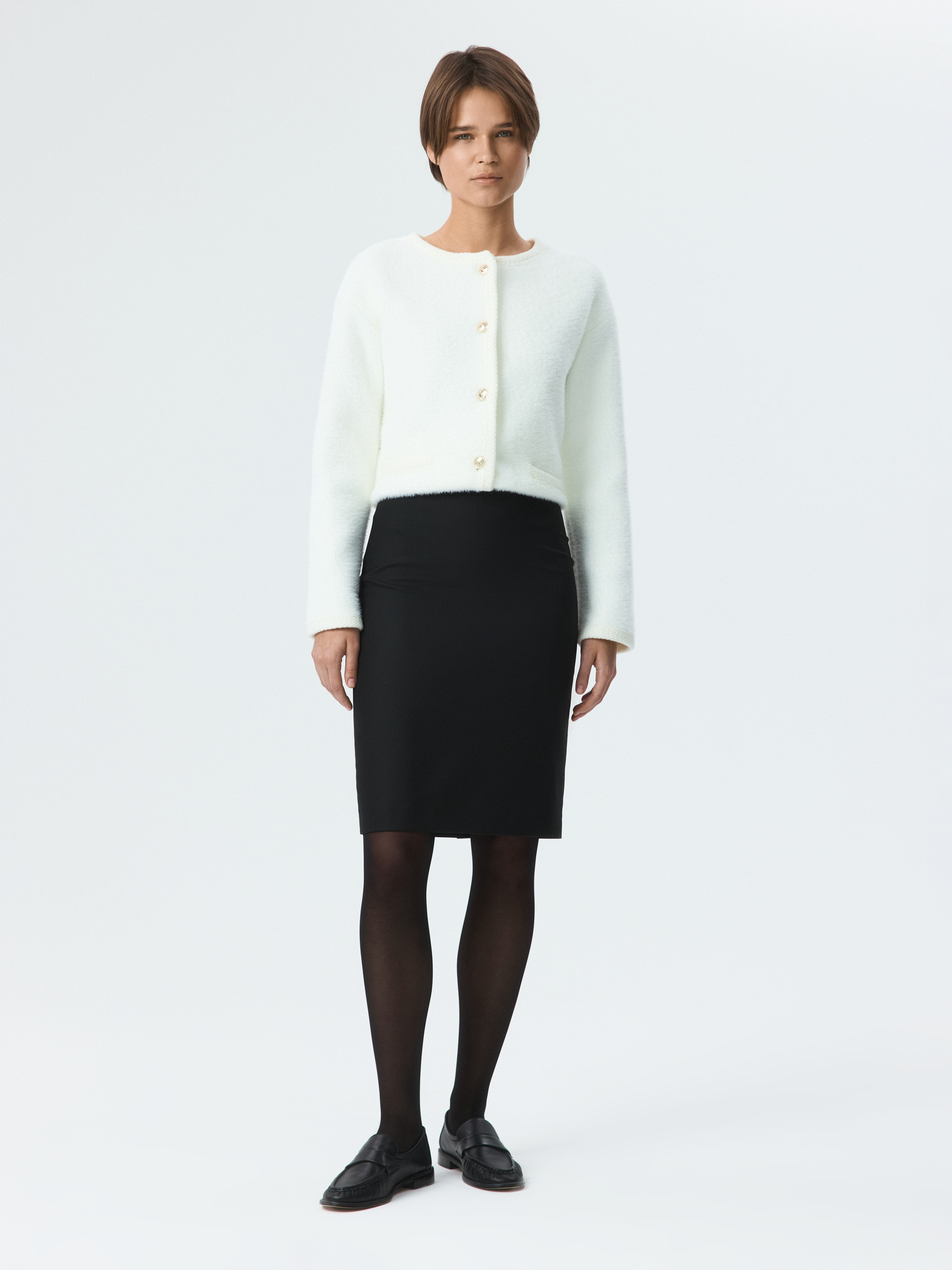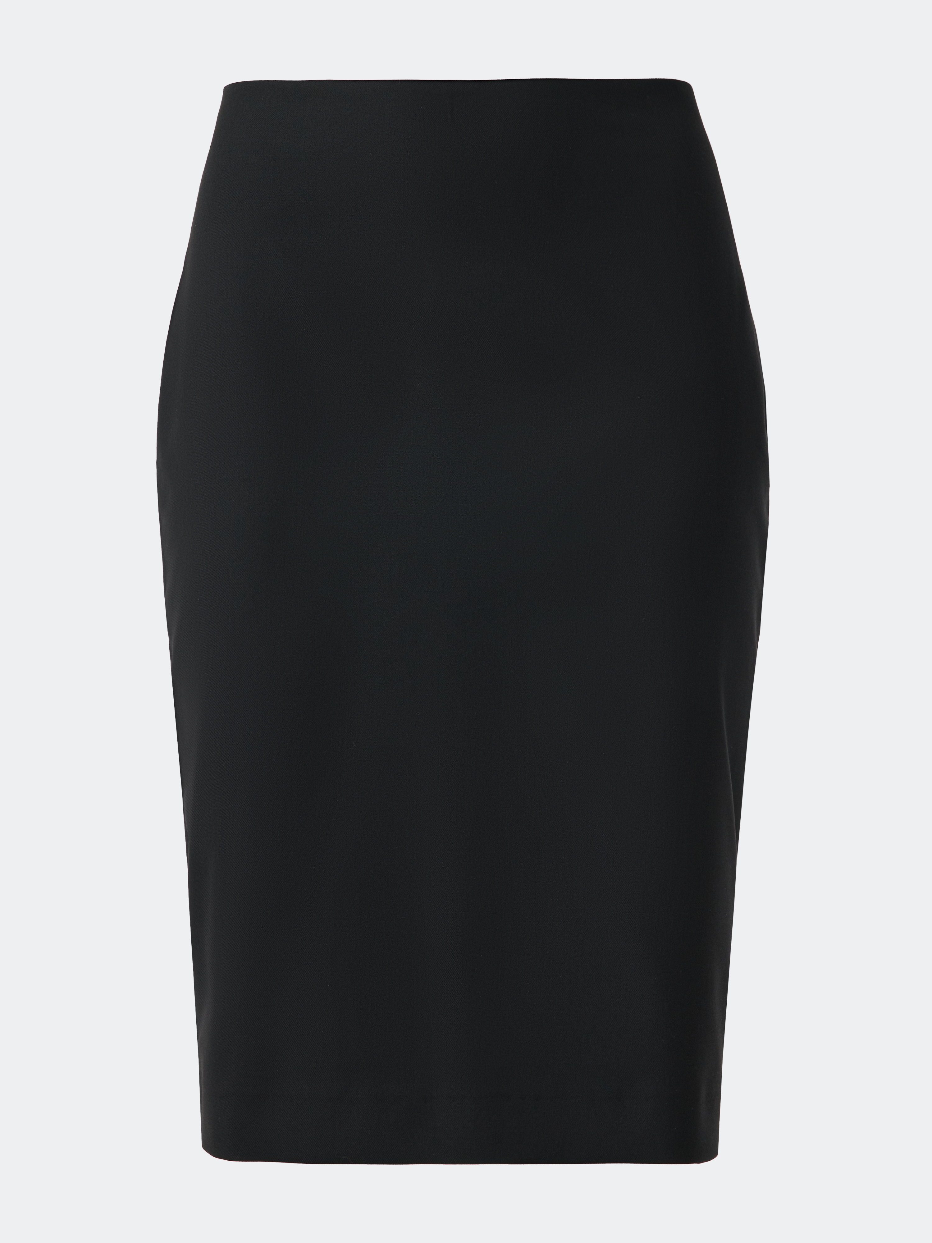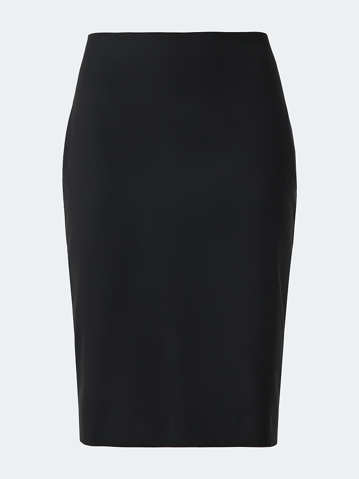 Прямая юбка длиной чуть выше колена легко адаптируется под разные ситуации. Плотный текстиль из поливискозы не тянется и не требует особого ухода, а благодаря гладкой подкладке комфортно прилегает к телу. Модель сдержанного кроя сочетается с любым верхом.