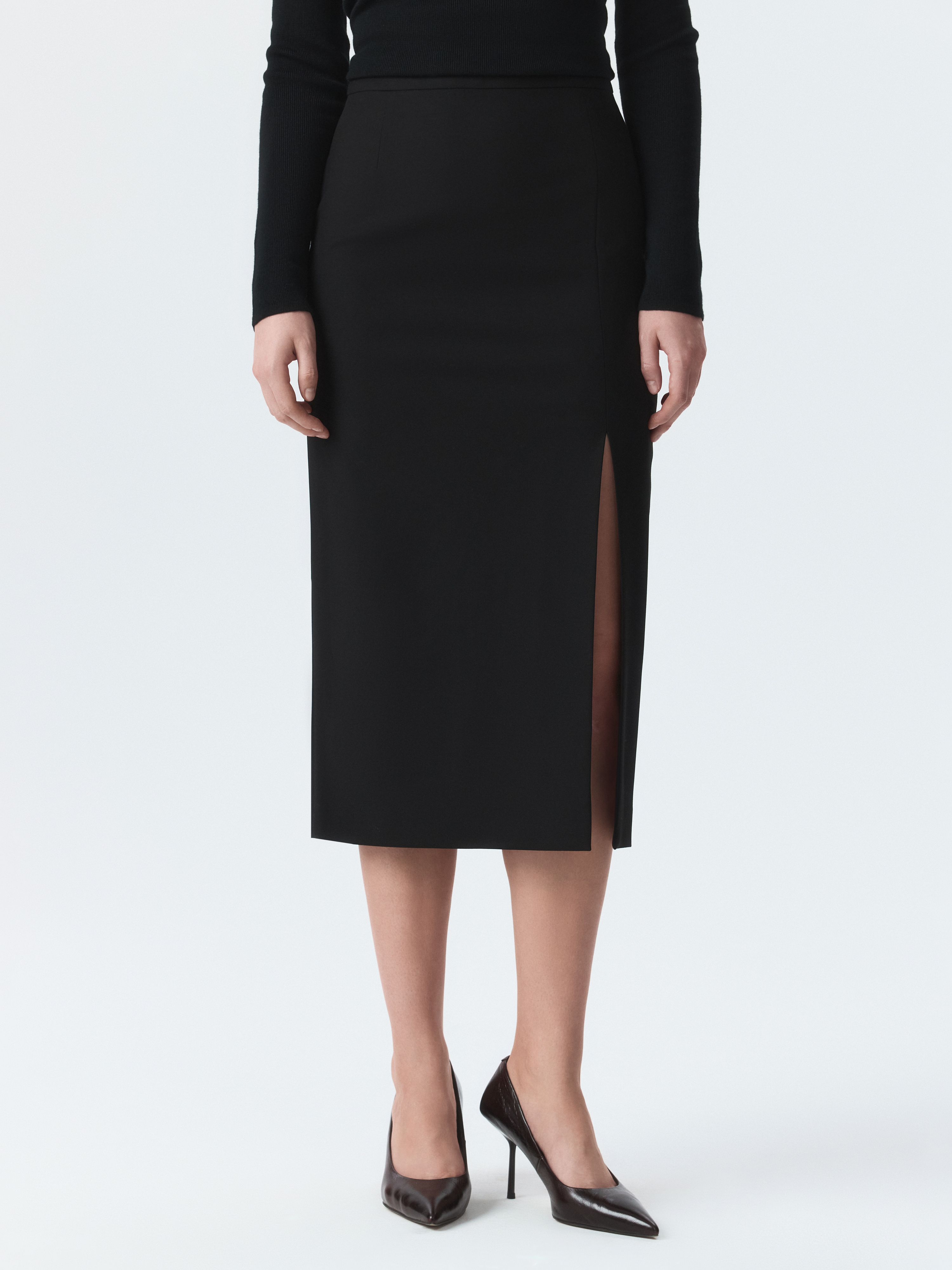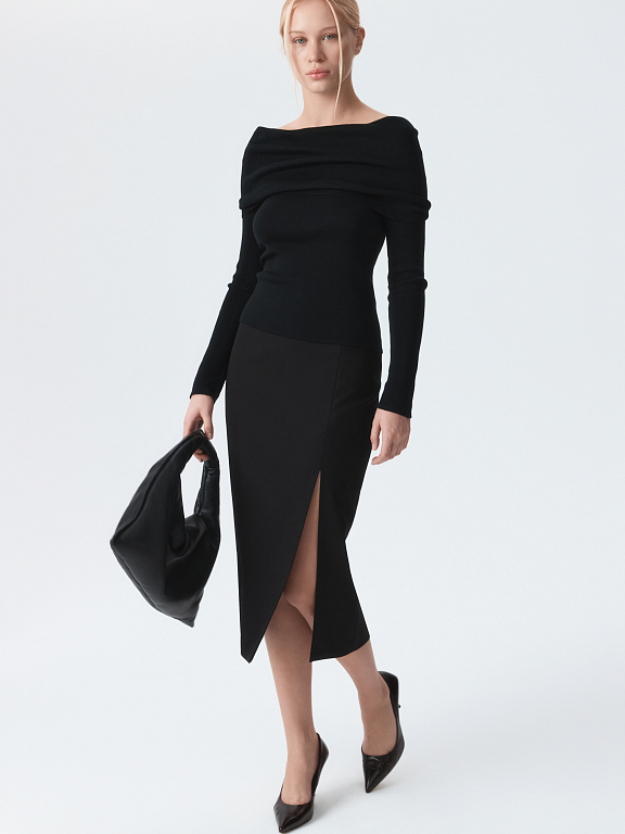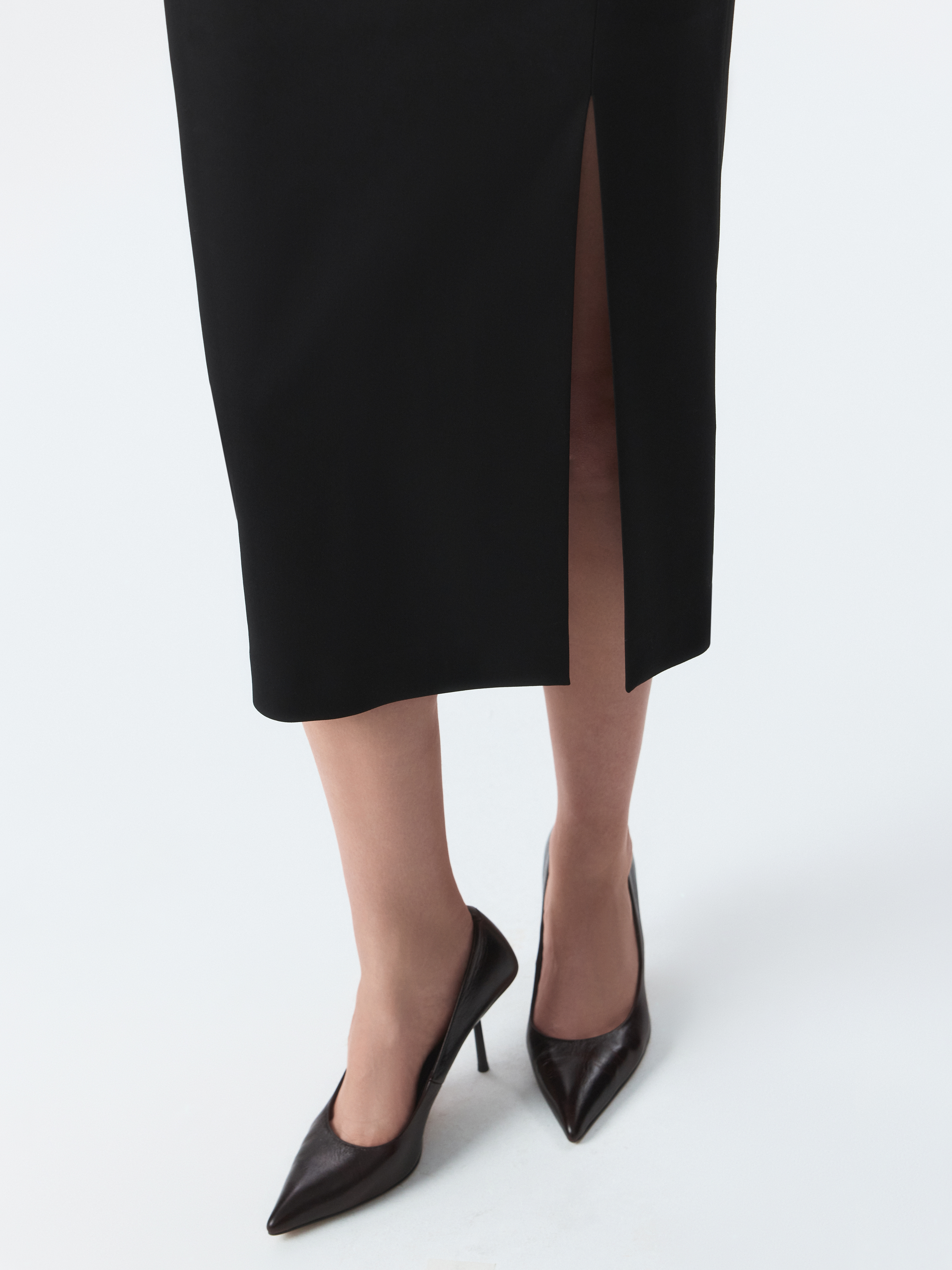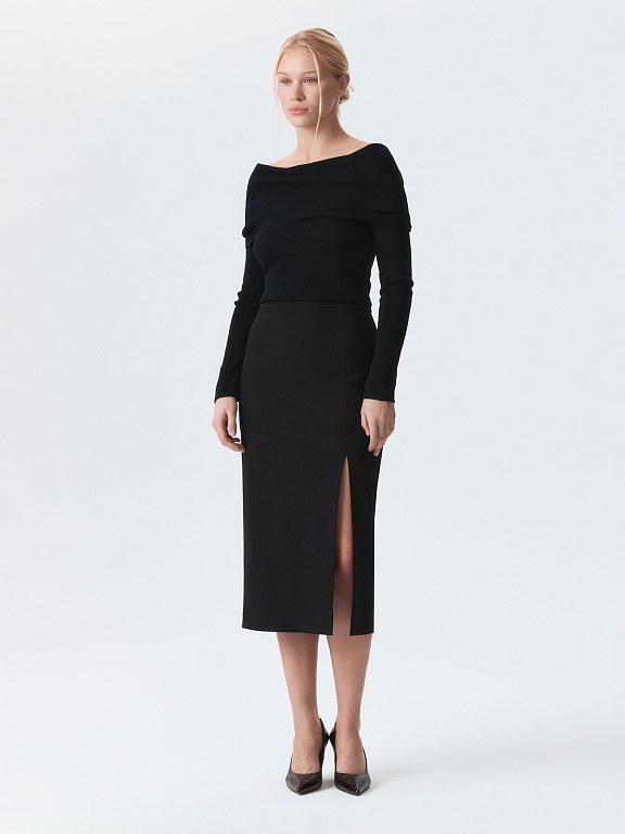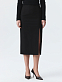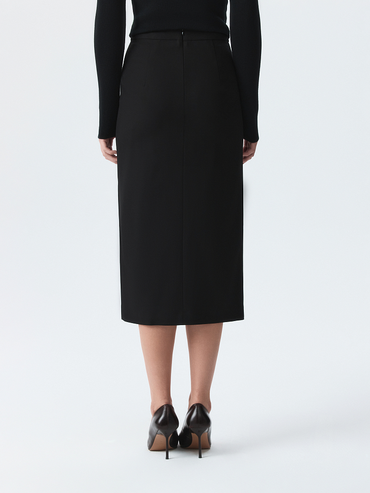 Лаконичную юбку-миди можно стилизовать для деловых или вечерних образов. Плотный текстиль из вискозы не тянется и не мнется, а гладкая подкладка дарит комфортное прилегание. Чтобы юбка ниже колена не сковывала шаг, спереди предусмотрели разрез.