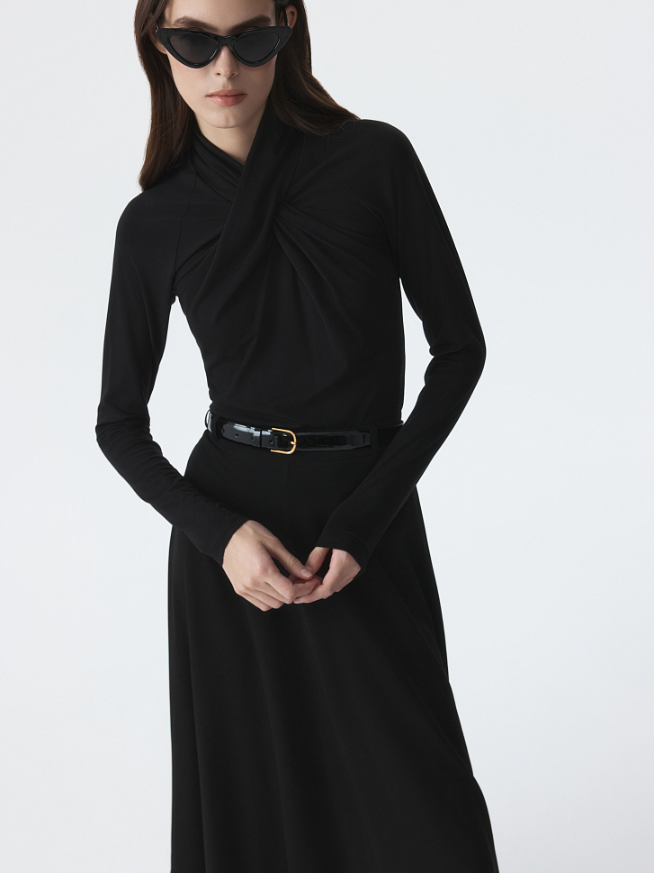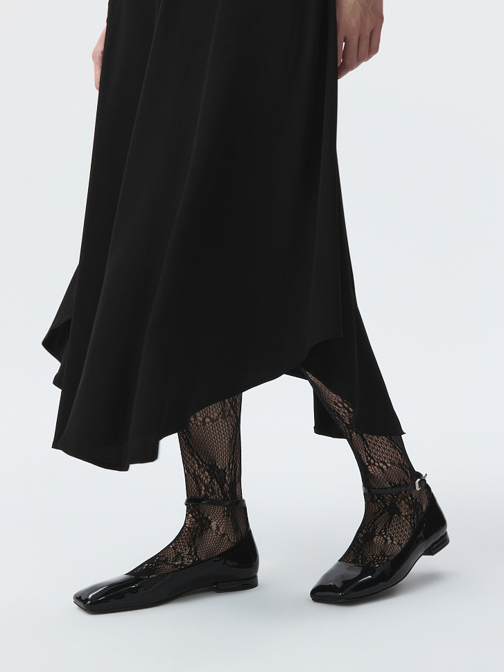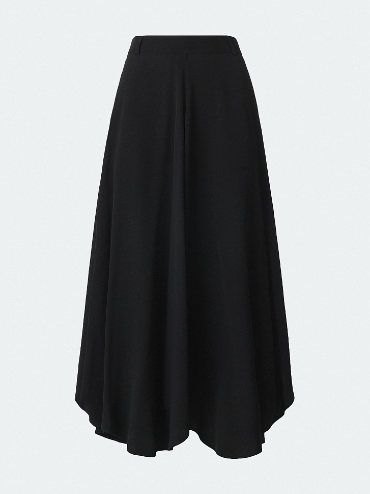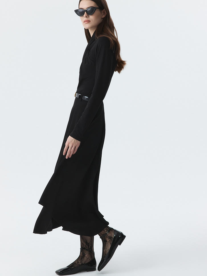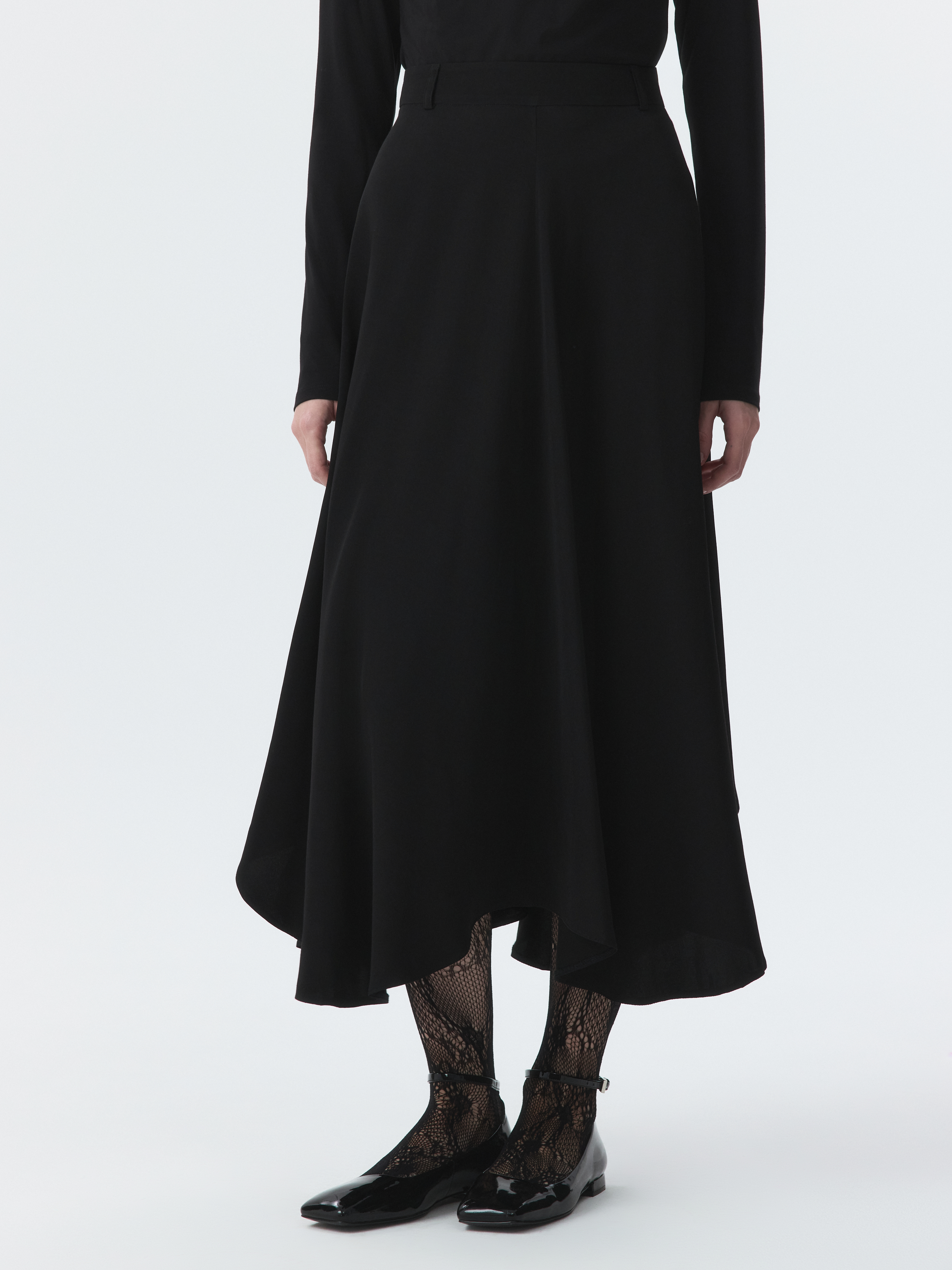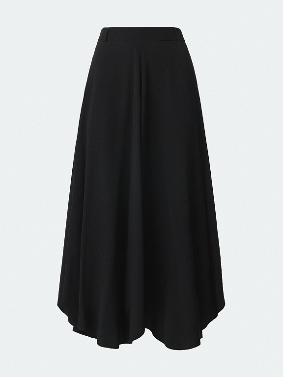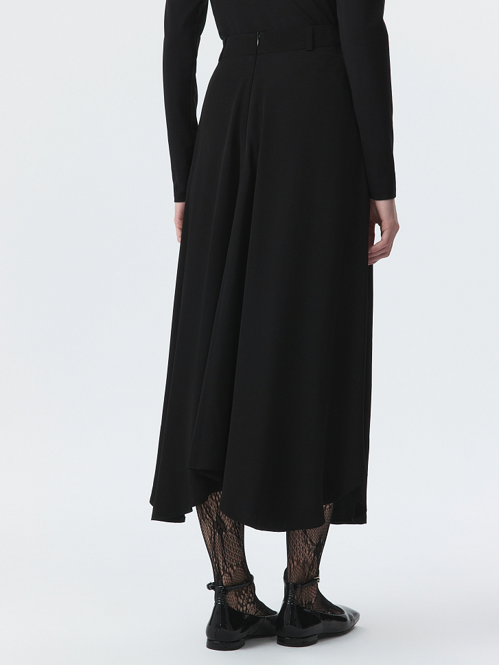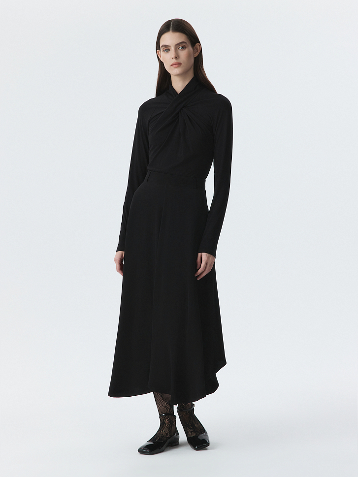 Расклешенная юбка поддерживает тренд на асимметрию. Тонкий гладкий текстиль с волокнами бамбука легко струится в движении и не просвечивает даже без подкладки. Дополнить образ можно базовым трикотажем, сохраняя баланс между классикой и праздничным настроением.