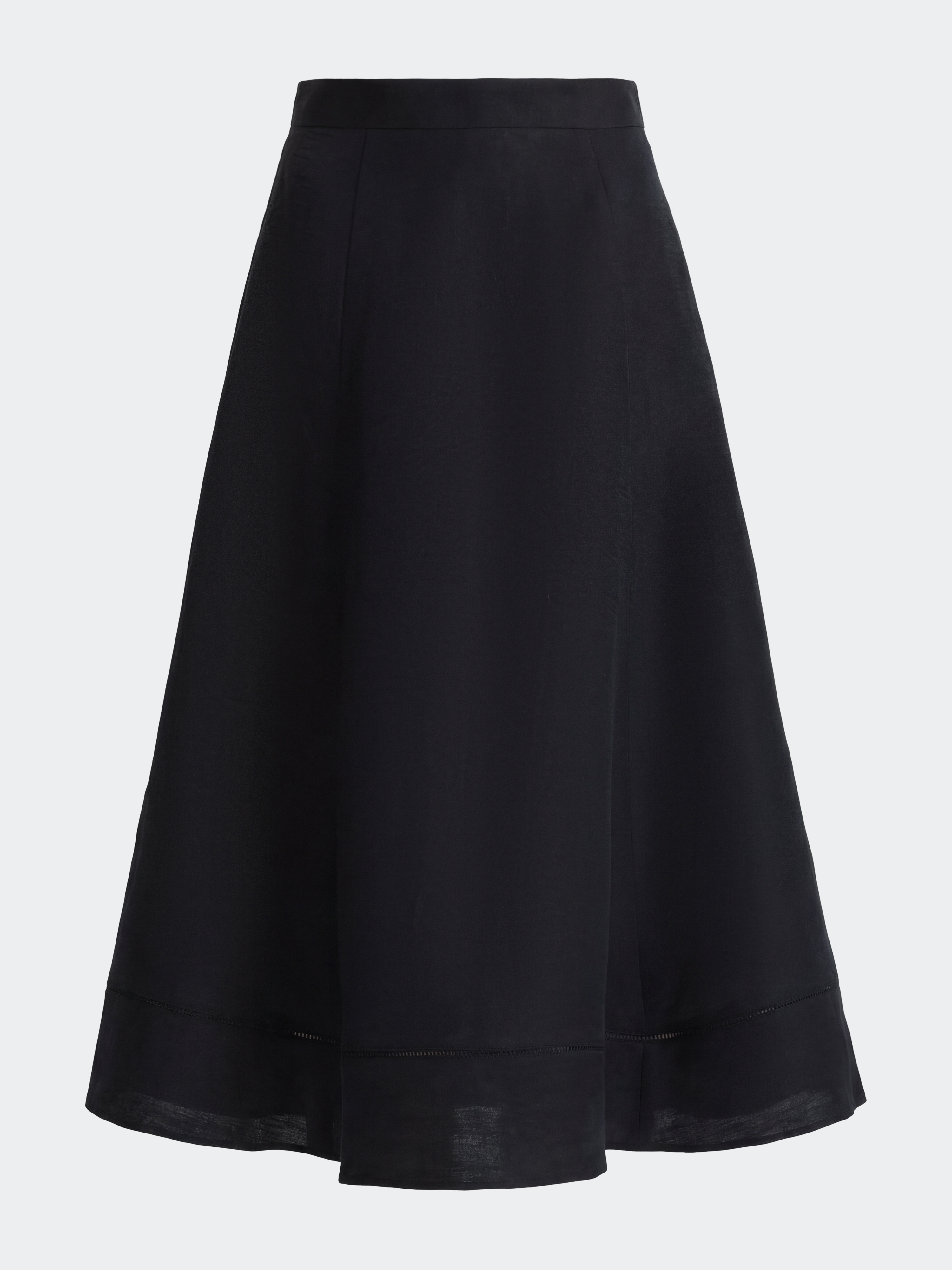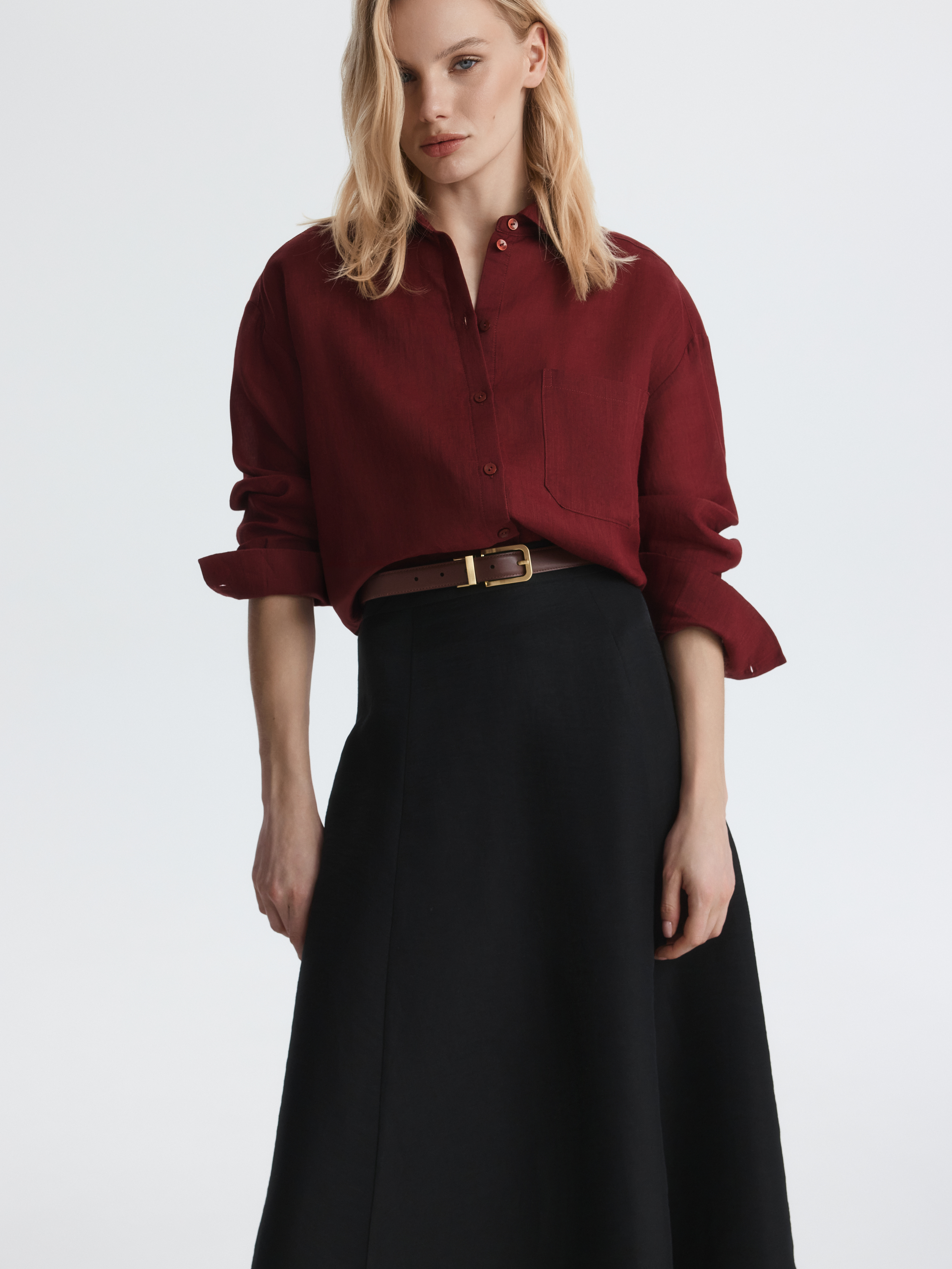 Романтичное настроение миди-юбке придают расклешенный крой и крупные мягкие складки. В меру плотный льняной текстиль не тянется и обеспечивает воздухопроницаемость, а хлопковая подкладка дарит комфортное прилегание. Силуэт-трапеция не сковывает движения и подходит на любой тип фигуры.
