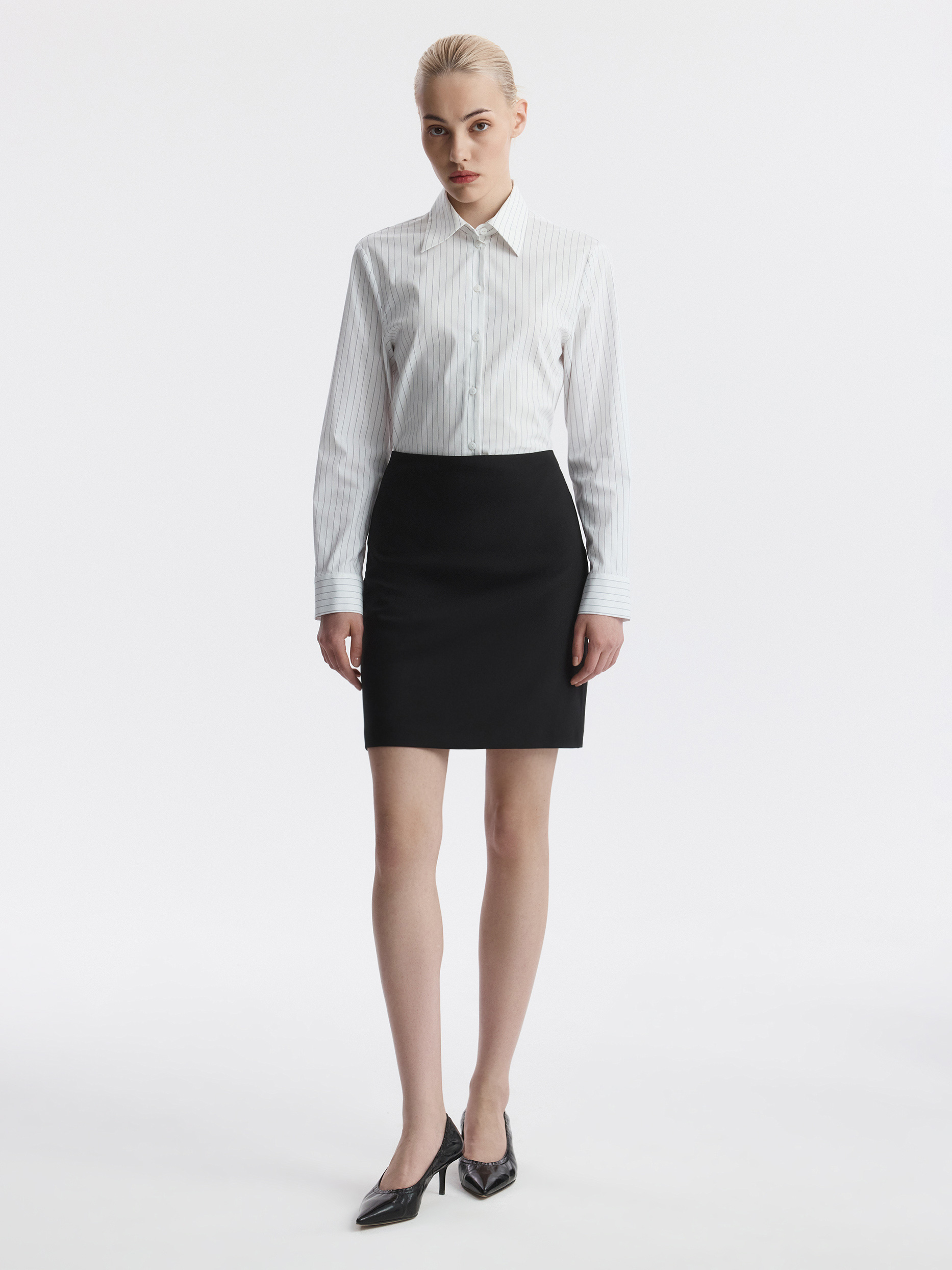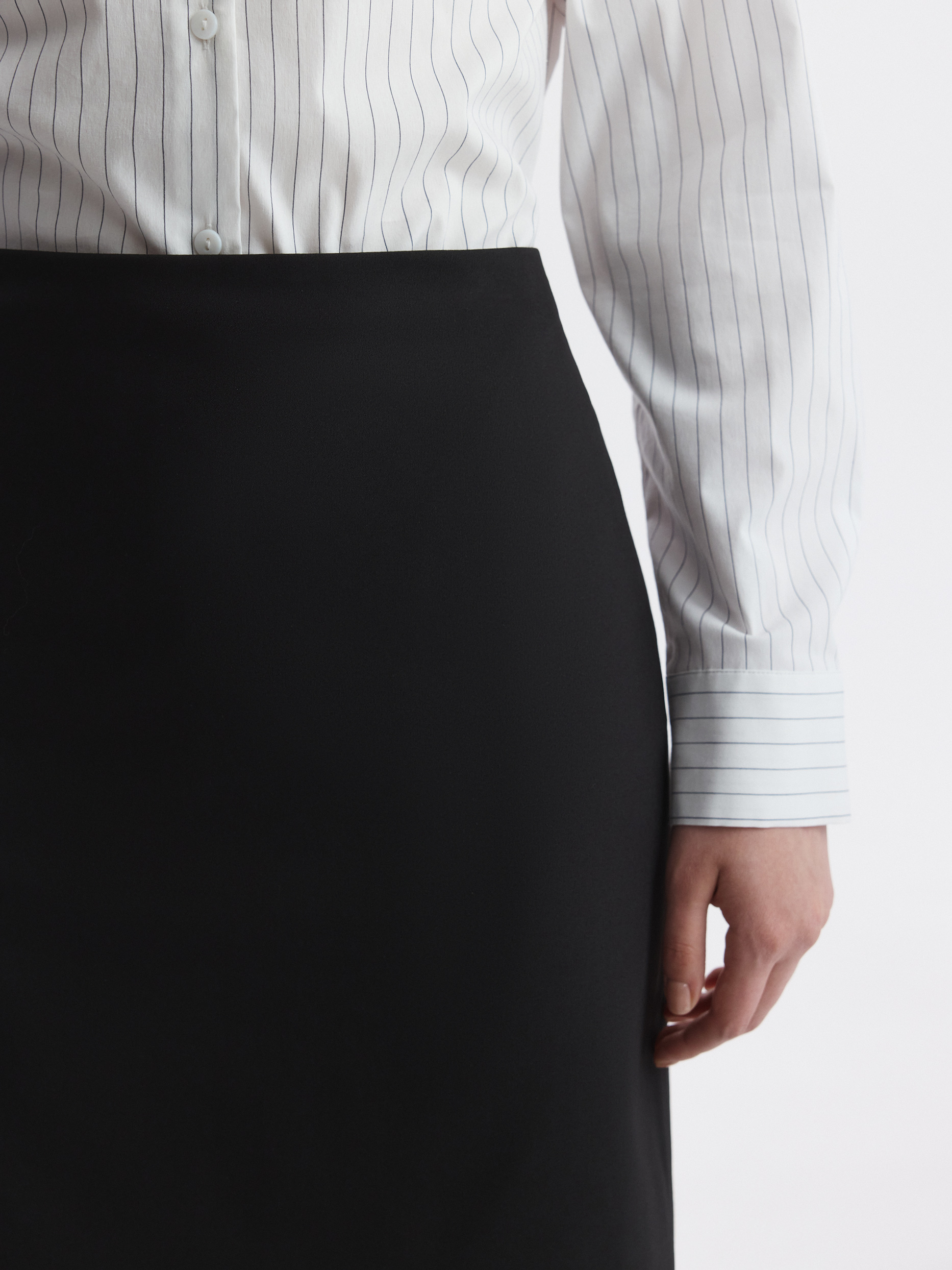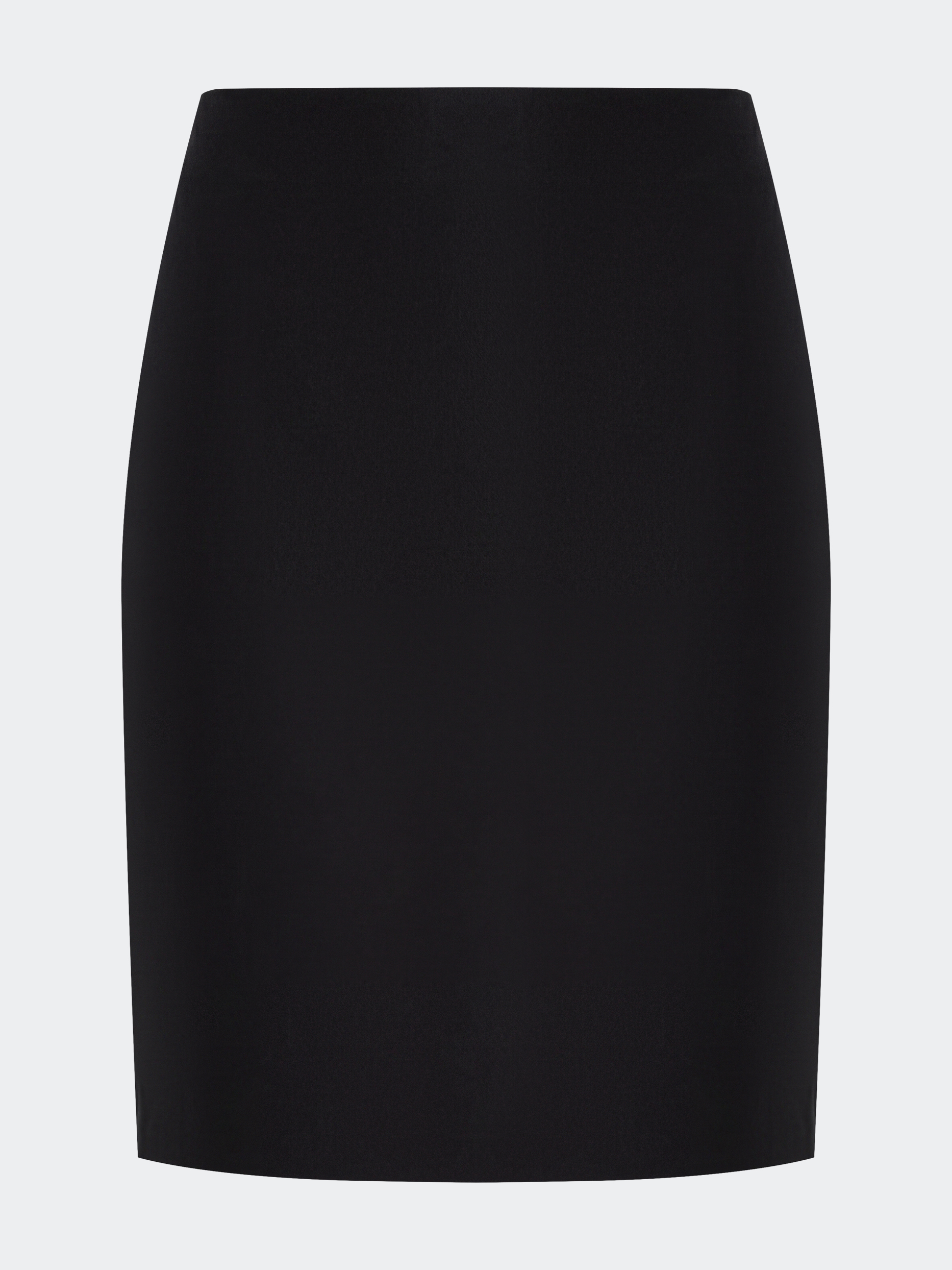 Прямая мини-юбка без декора всегда пригодится в гардеробе. Плотный гладкий текстиль на основе хлопка не тянется и комфортно прилегает благодаря тонкой хлопковой подкладке. Завершить костюм можно жакетом из аналогичного материала.