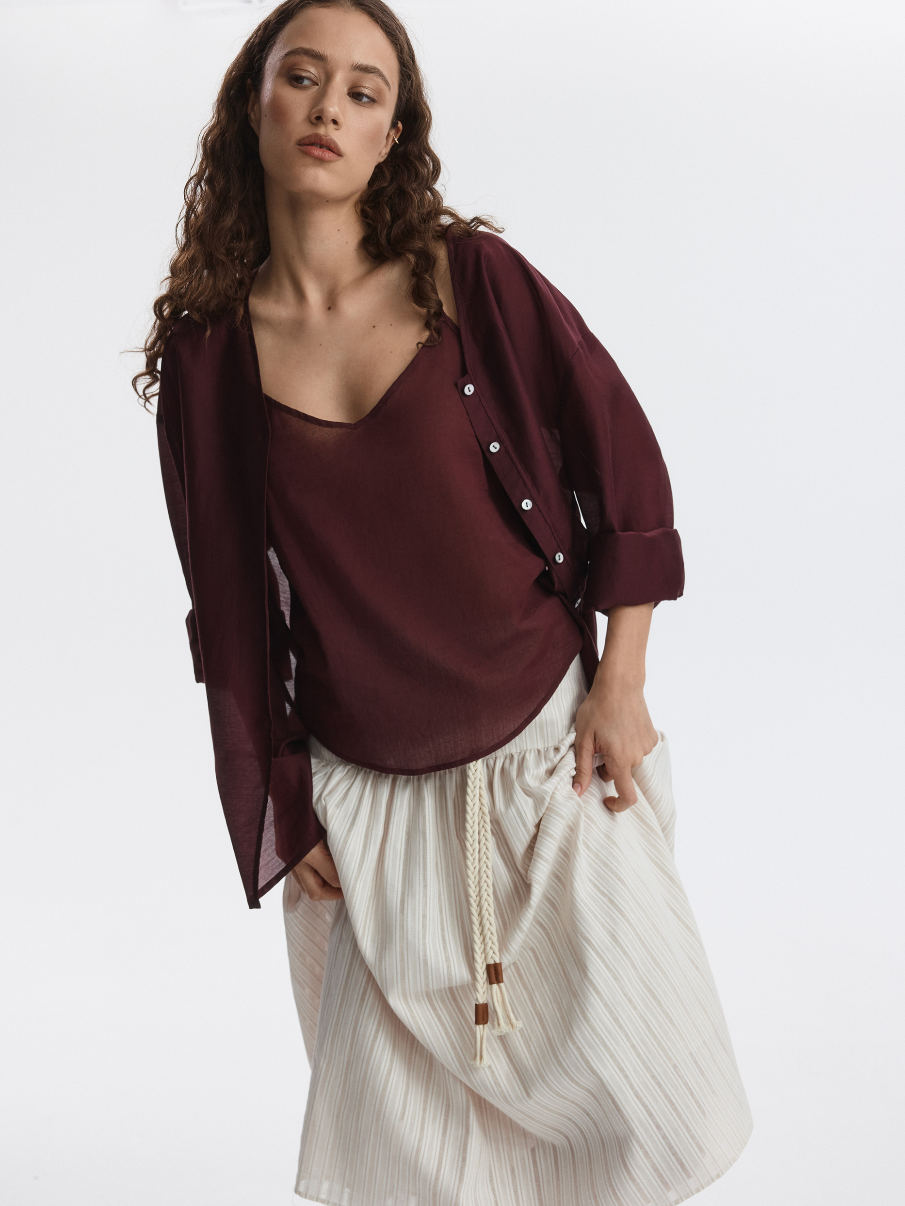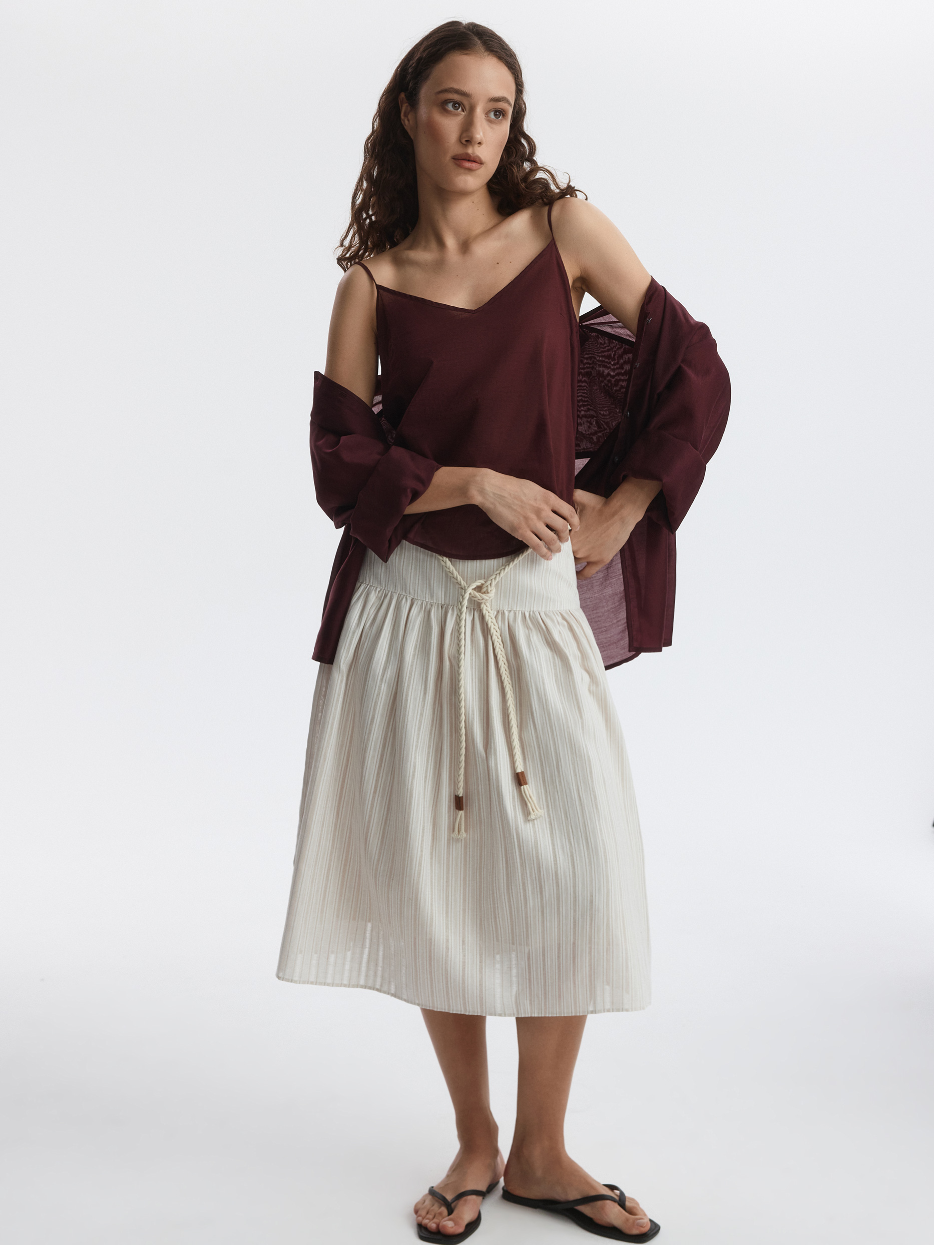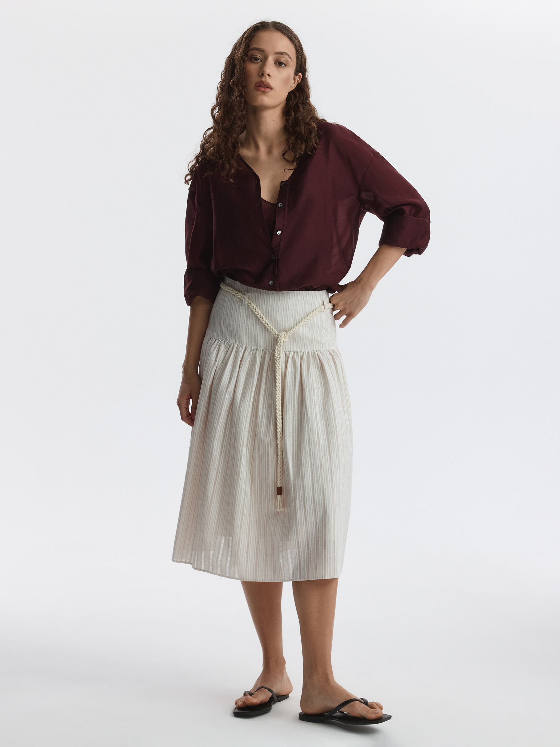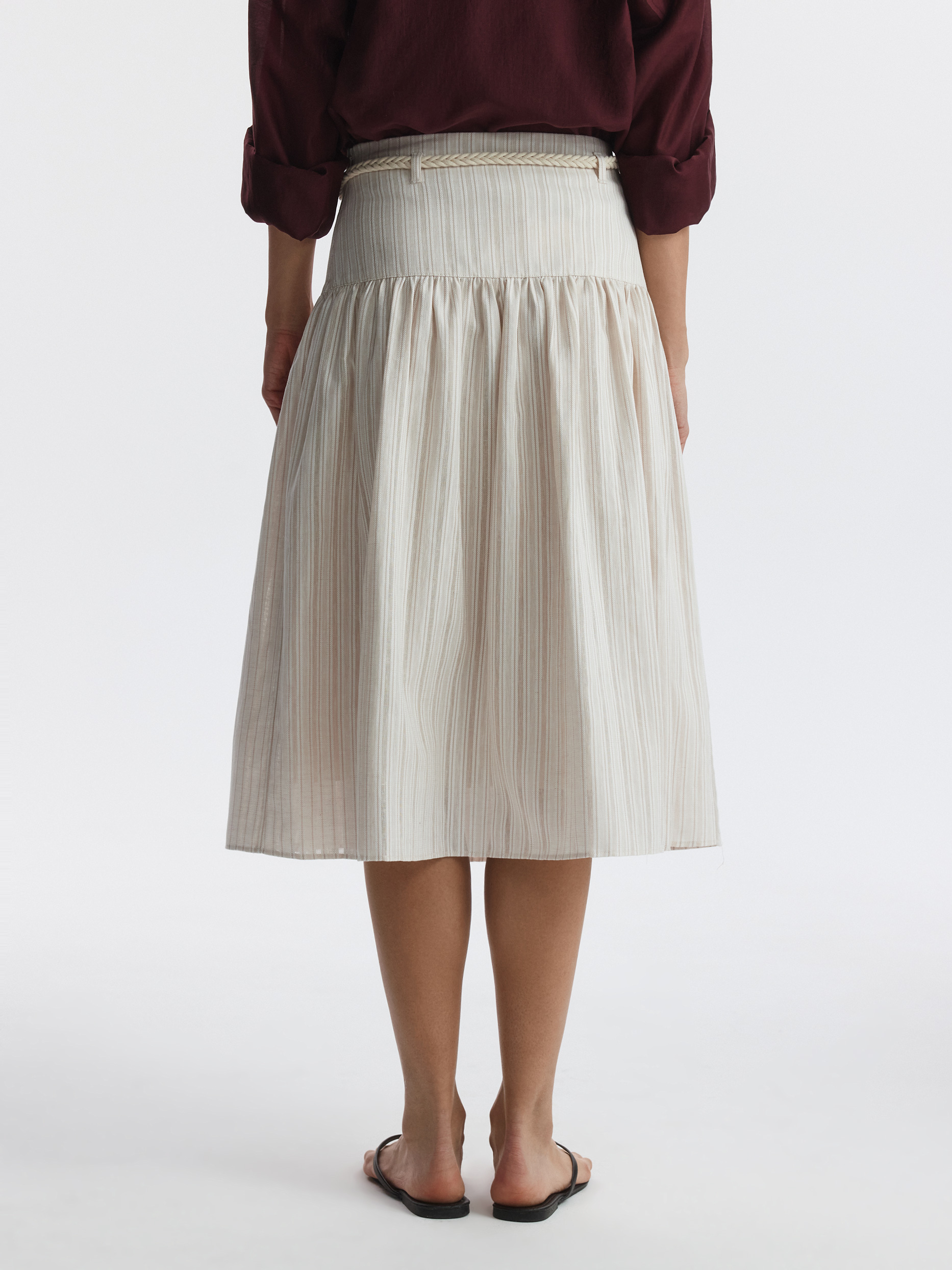 Юбка-миди на кокетке станет альтернативой классическим моделям. В меру плотный смесовый текстиль из хлопка и льна в жаккардовую полоску хорошо пропускает воздух и мягко прилегает благодаря хлопковой подкладке. Плетеный пояс из комплекта можно заменить на классический ремень, чтобы образ заиграл по-новому.