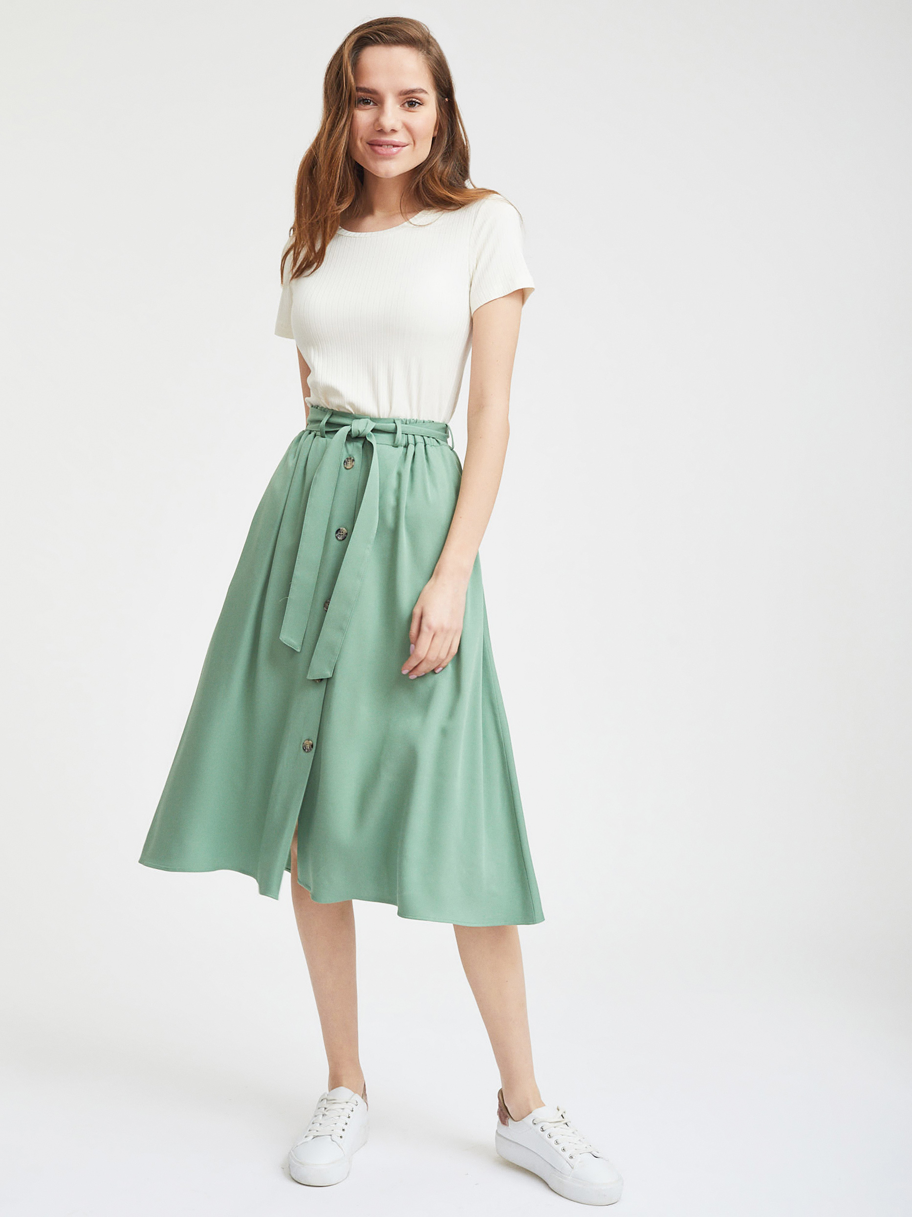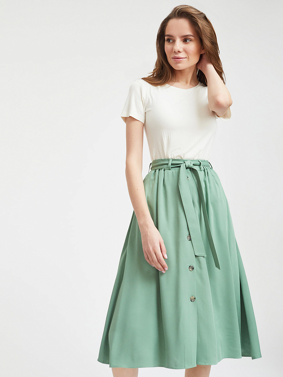 Однотонная юбка из мягкой вискозы. А-силуэт, высокая посадка, втачной эластичный пояс, застежка на ряд пуговиц. В комплекте пояс.