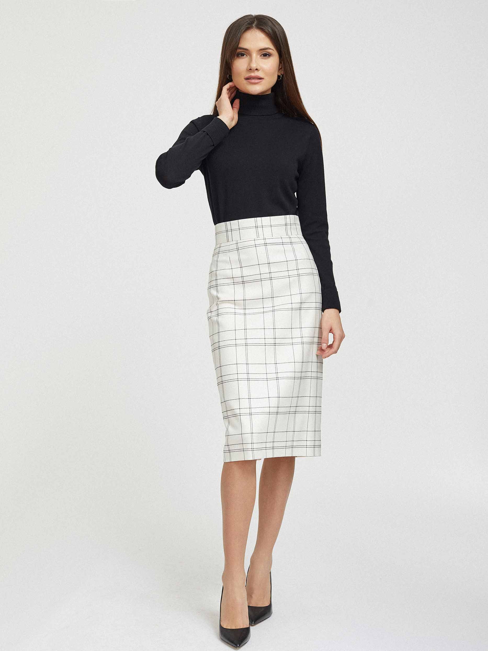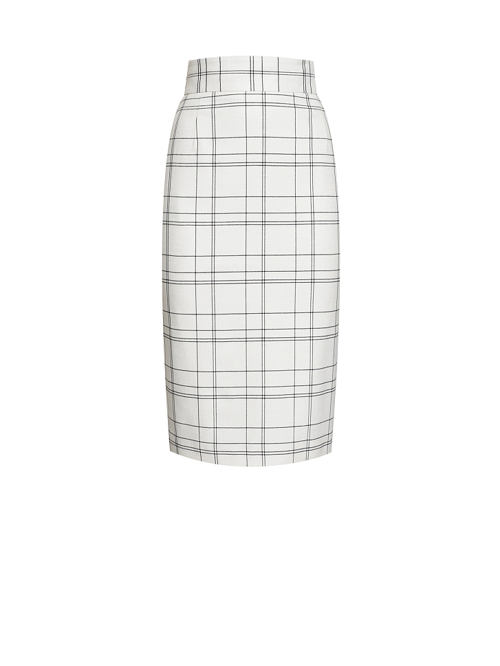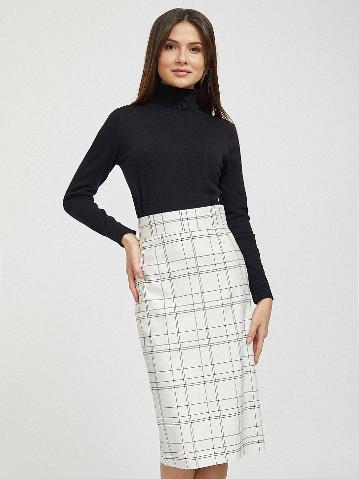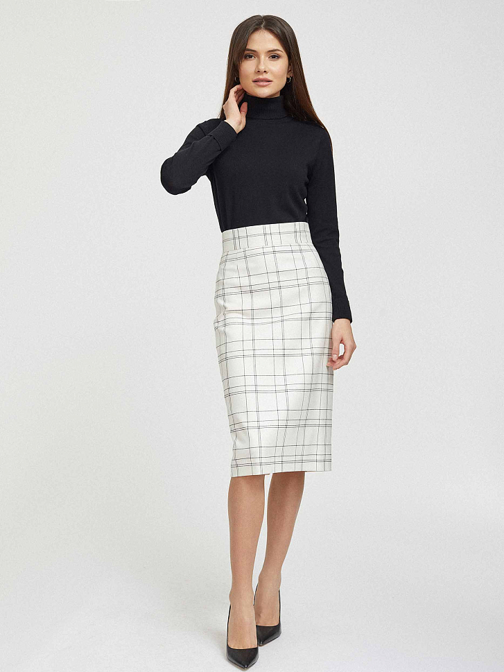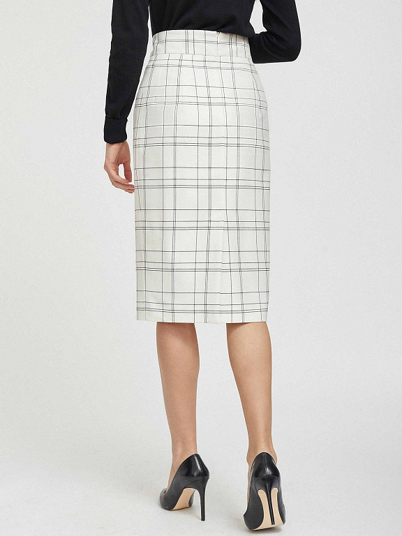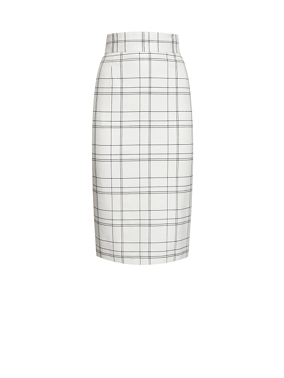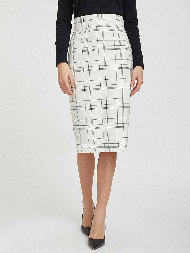 Юбка приталенного кроя в клетку. Высокая посадка, широкий втачной пояс, шлица, подкладка. Застегивается на потайную молнию.