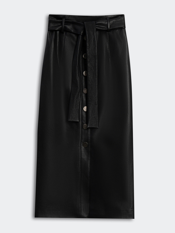 Прямая юбка из искусственной кожи. Высокая посадка, втачной пояс, декоративный ряд пуговиц, шлица, подкладка. Застегивается на потайную молнию. В комплекте пояс-хомут.