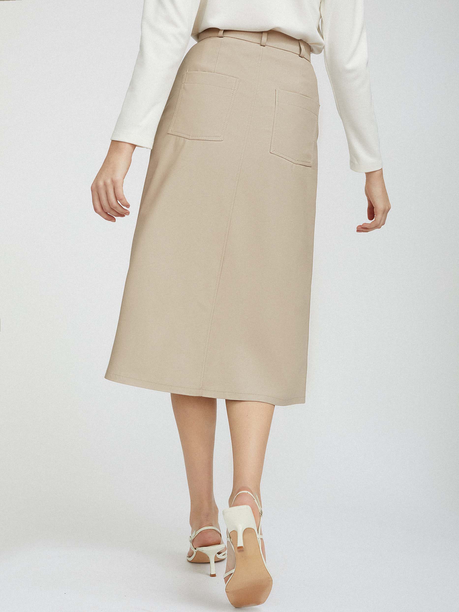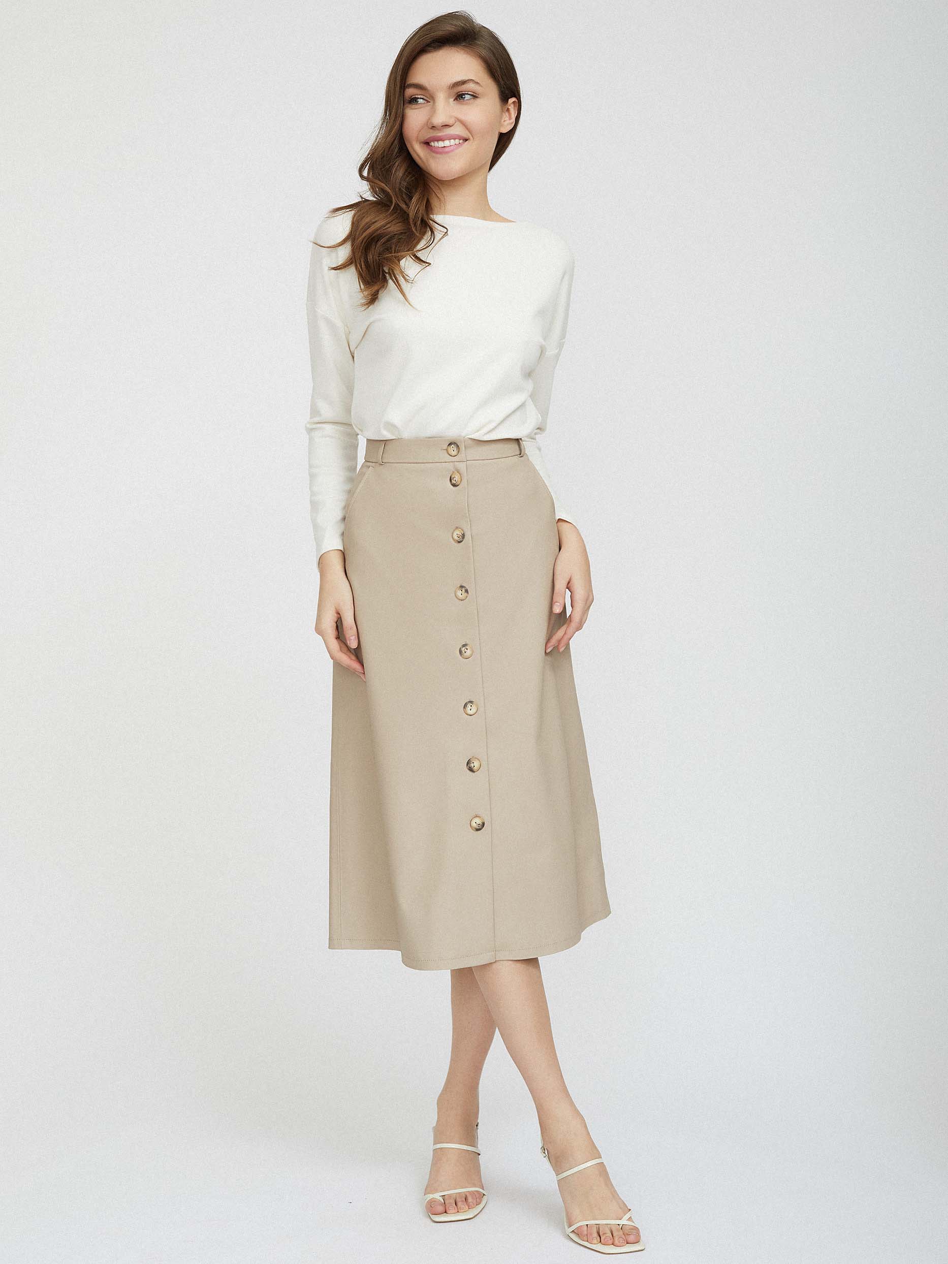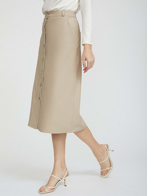 Однотонная юбка А-силуэта, выполненная из искусственной кожи. Высокая посадка, боковые карманы, накладные карманы сзади, подкладка. Застегивается на ряд пуговиц.