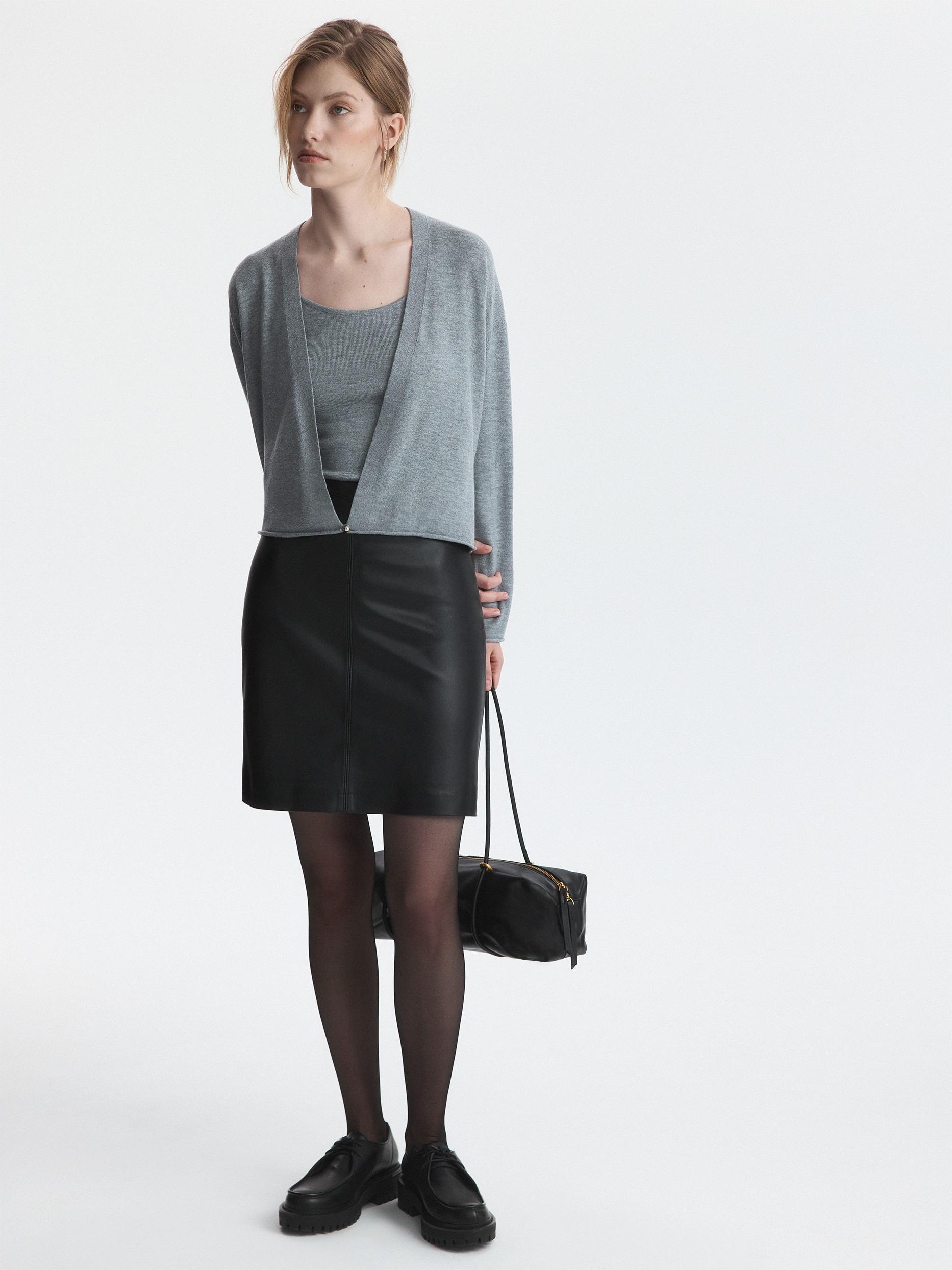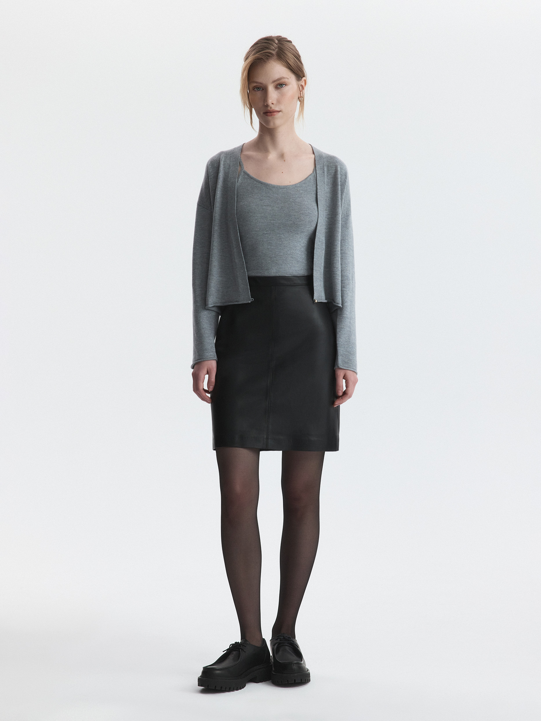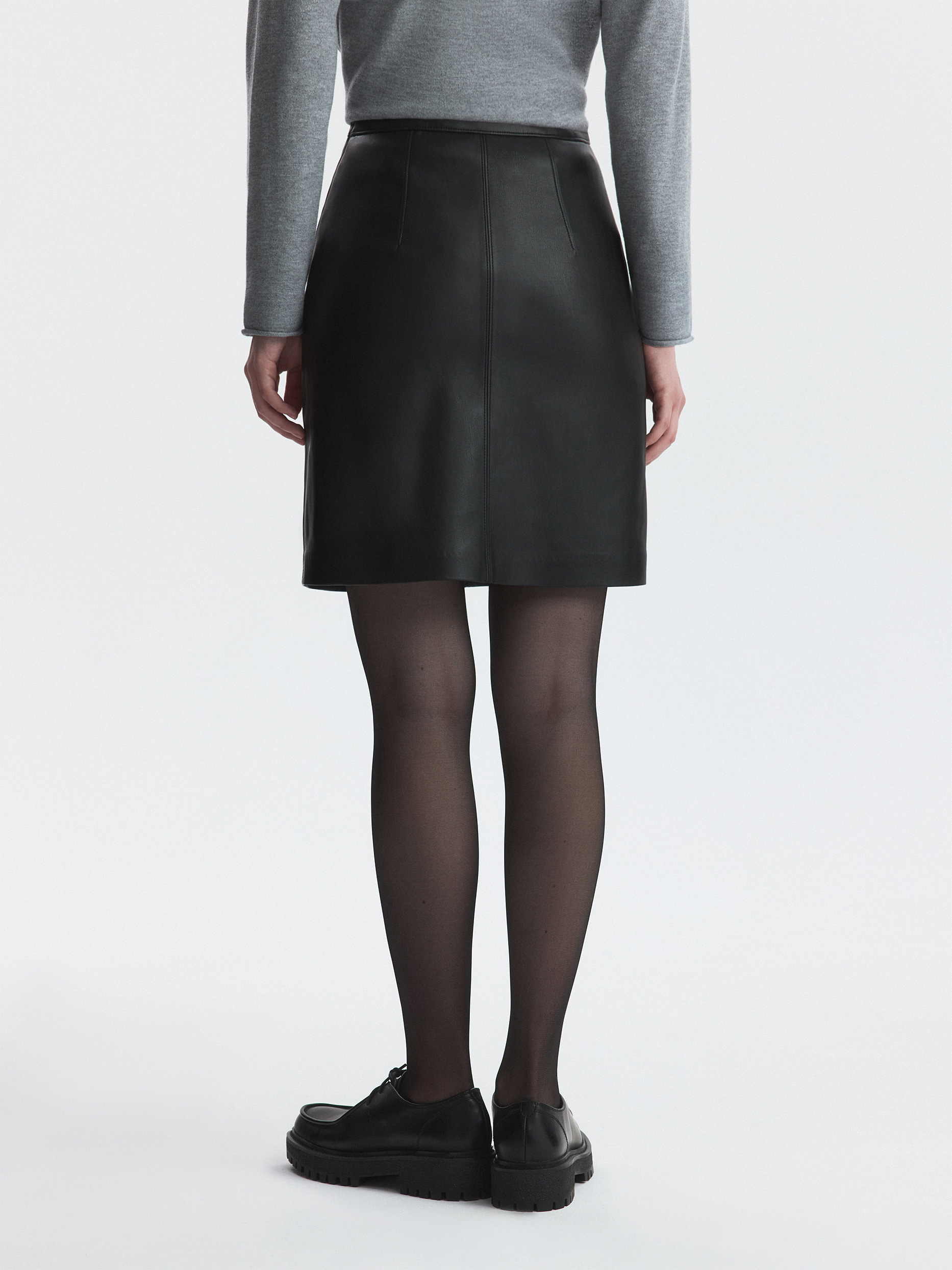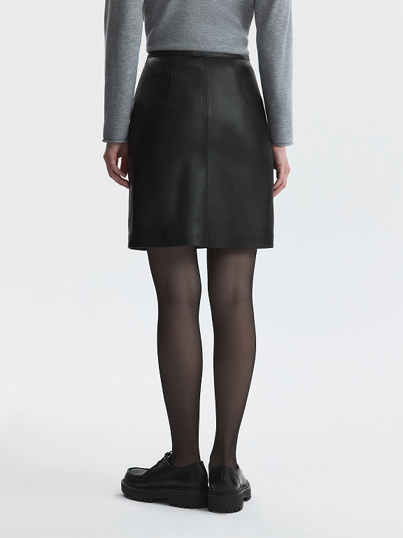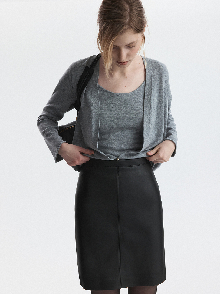 Лаконичный крой мини-юбки компенсируется благородным материалом: для пошива выбрали искусственную кожу с матовым блеском. Гладкая подкладка дарит комфортное прилегание. Универсальная кожаная юбка станет идеальным фоном как для делового так и для casual стиля.