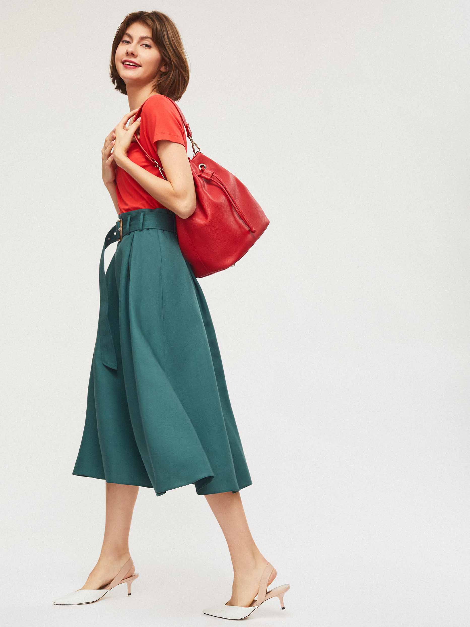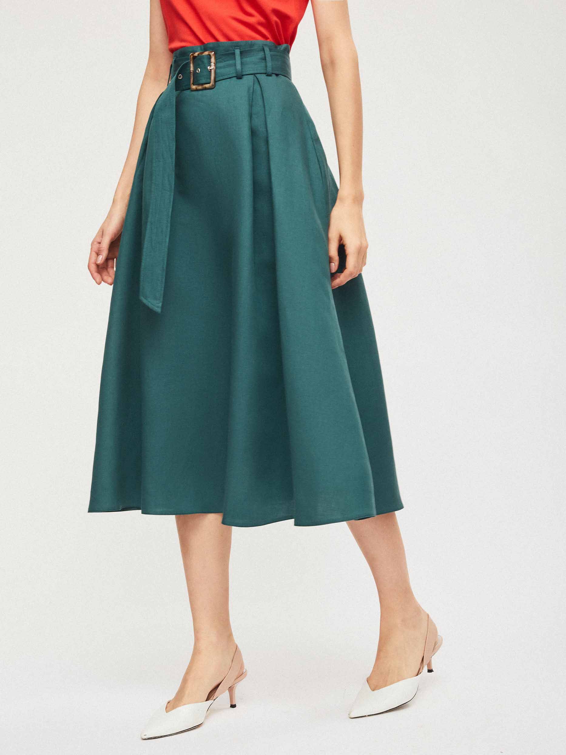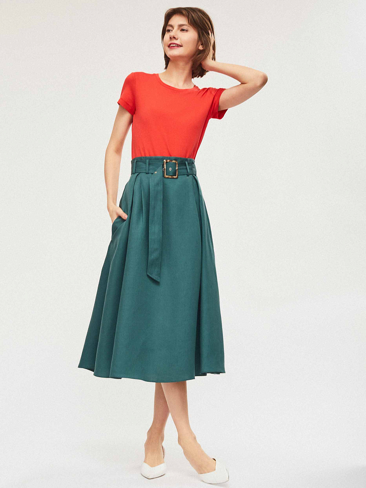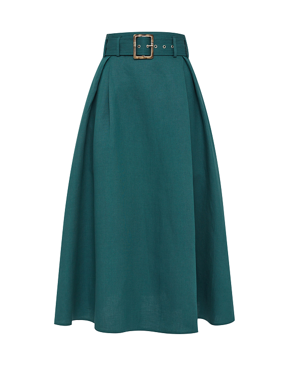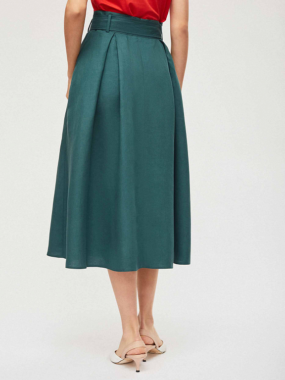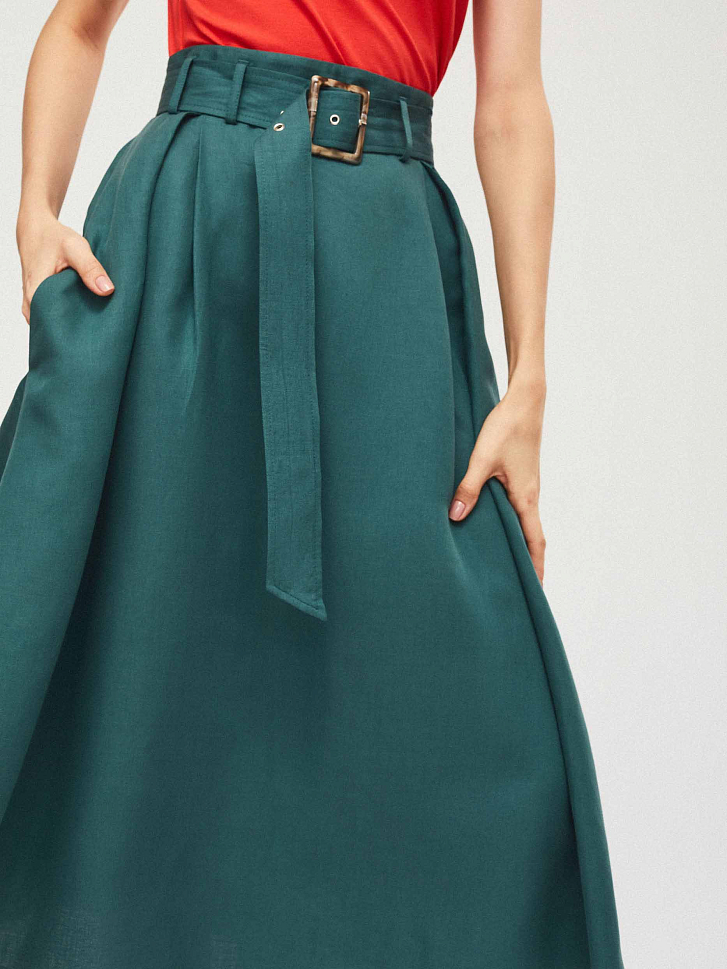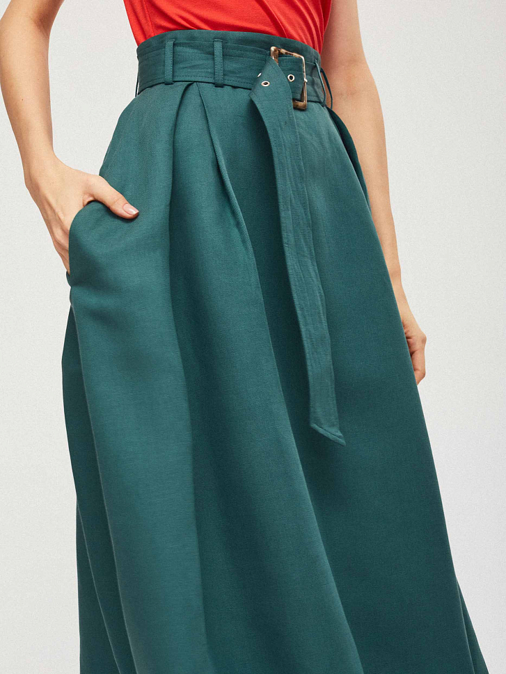 Юбка из смесового льна на талии с поясом в тон. А-силуэт, боковые прорезные карманы и потайная молния сзади.