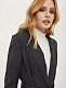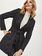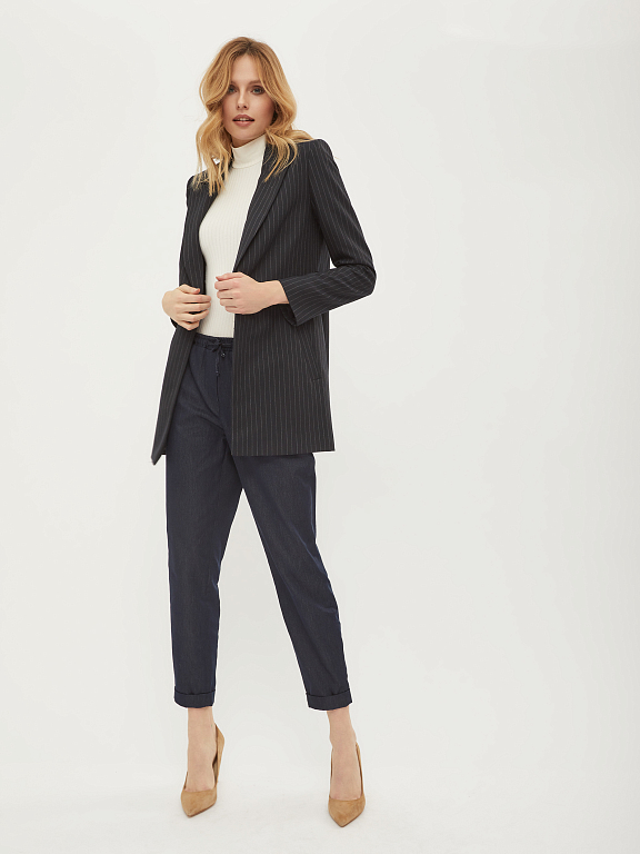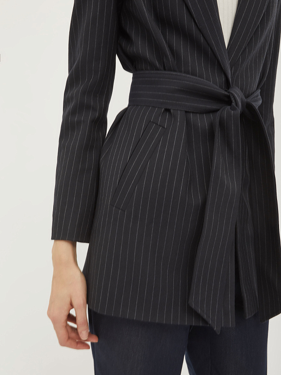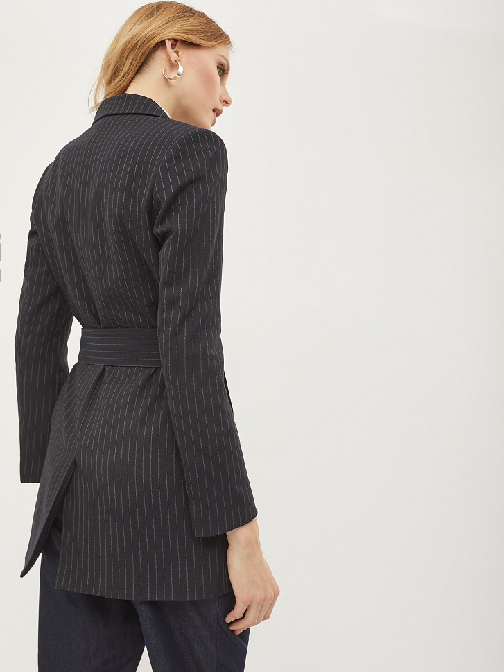 Удлиненный жакет в полоску с поясом. Воротник с остроконечными лацканами. Прорезные карманы с листочкой. Застежка на одну пуговицу, сзади разрез. Силуэт подчёркнут тонкими подплечниками. Шлёвки для пояса. Изделие на подкладке. Рост модели 173 см, размер 42 (российский). Плотность ткани: 260 г/м2