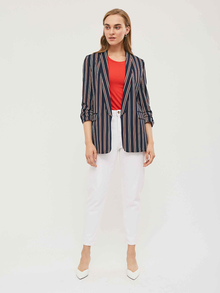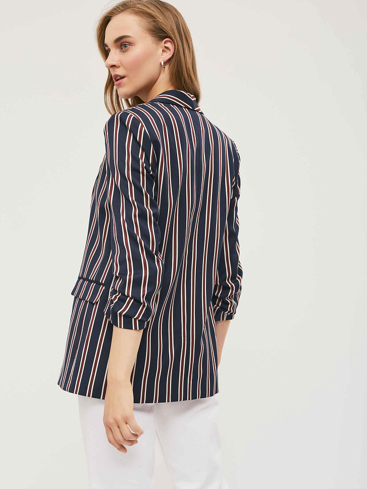 Удлиненный жакет прямого кроя. Декоративные клапаны, лацканы, рукава с драпировкой длины ¾. Изделие на подкладке.