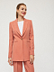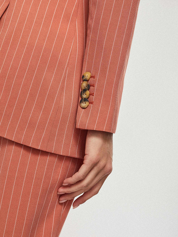 Удлиненный однобортный жакет приталенного кроя. Декоративные передние карманы, на рукавах ряды крупных контрастных пуговиц, шлица сзади.
