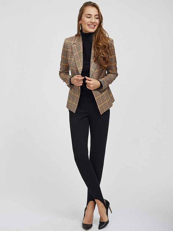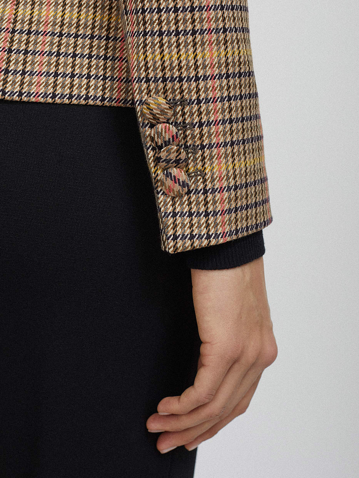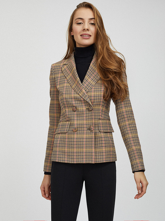 Приталенный жакет из фактурной ткани с принтом. Отложной воротник с лацканами, ряды пуговиц на рукавах, декоративные карманы с клапанами, подкладка, двубортная застежка на обтяжные пуговицы.